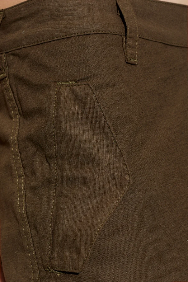 Zastosowanie wysokogatunkowego lnu oraz bawełny w strukturze o gęstym splocie zapewnia subtelne doznania dotykowe oraz trwałość na lata. Luźny, prosty krój z szerokimi nogawkami, zwieńczonymi ściągaczami ze sznurkami, gwarantuje wygodę i swobodę stylizacji. Praktyczne, skośne kieszenie boczne, przestronne kieszenie cargo na udach oraz kieszenie z tyłu – wszystkie zamykane klapami – nadają całości charakterystyczną sylwetkę i oferują wyjątkową funkcjonalność.