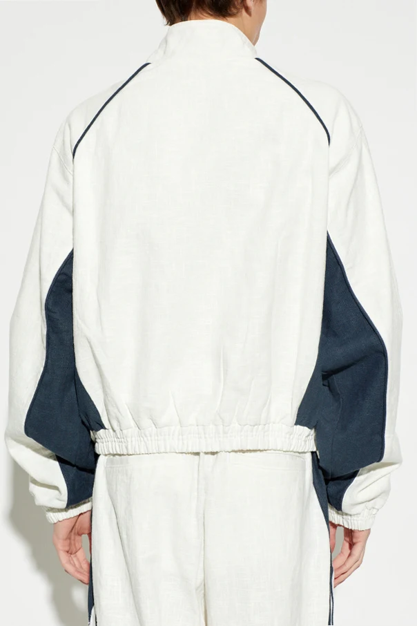 Lniana kurtka ze stójką marki Rhude to wyrafinowany manifest nowoczesnej mody, łączący subtelną nonszalancję ze sportową elegancją. Projekt zachwyca luźnym, lekko oversize’owym fasonem typu bomber , a elastyczne wykończenia dołu i rękawów nadają lekkości oraz funkcjonalności. Charakterystycznym elementem są ciemne, granatowe lub ciemnoszare wstawki, podkreślające linię sylwetki i wprowadzające graficzną, wyrafinowaną dynamikę.