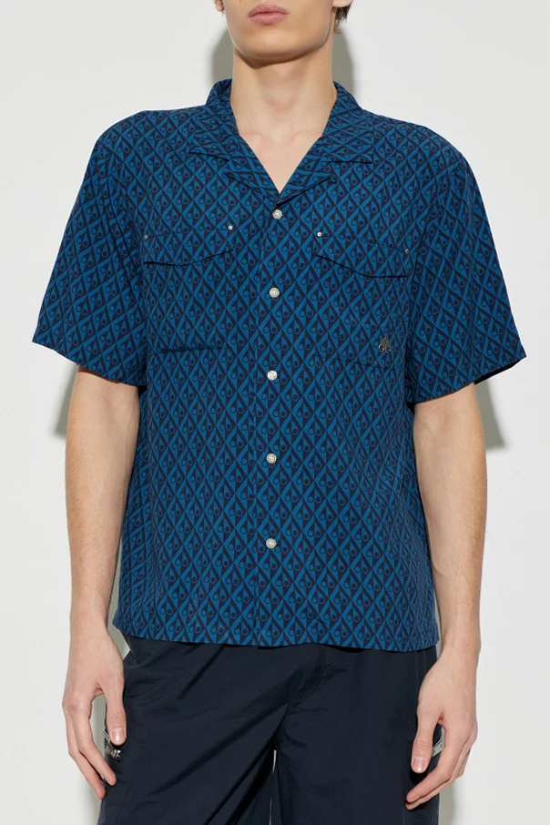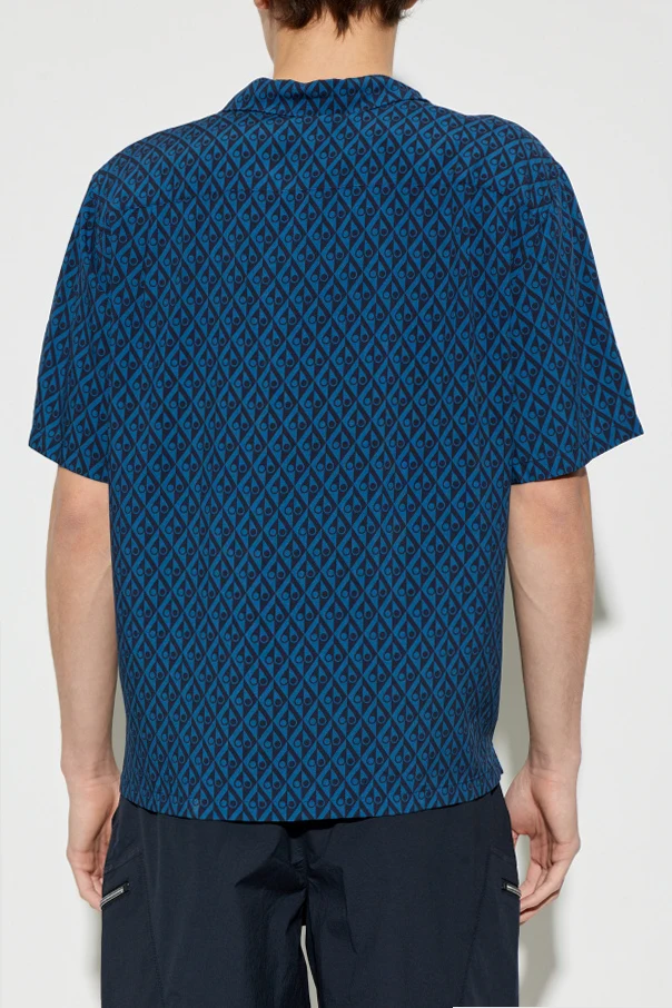Niebieski odcień stanowi ponadczasową bazę dla efektownego, geometrycznego wzoru – regularnych romboidalnych monogramów, które intrygują subtelnym motywem „łez”. Prosty, luźny fason z krótkimi rękawami oraz klasyczny, rewersowy kołnierzyk podkreślają casualowy, lecz niezwykle elegancki charakter koszuli.