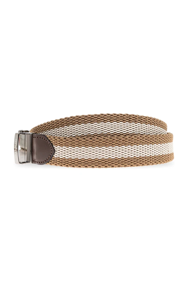 Wykonany z plecionego, elastycznego tworzywa tekstylnego, z elegancko wykończonymi skórzanymi końcówkami w odcieniu ciemnobrązowym, gwarantuje ponadczasowy szyk oraz niezrównaną trwałość. Metalowa, połyskująca klamra o prostokątnym kształcie dopełnia całości, a subtelne tłoczenie na skórzanej nasadce delikatnie sygnalizuje prestiż marki.