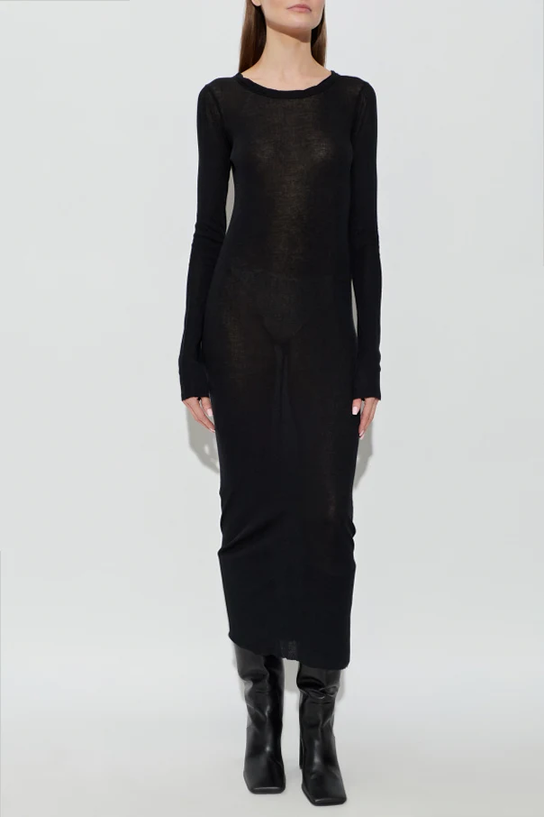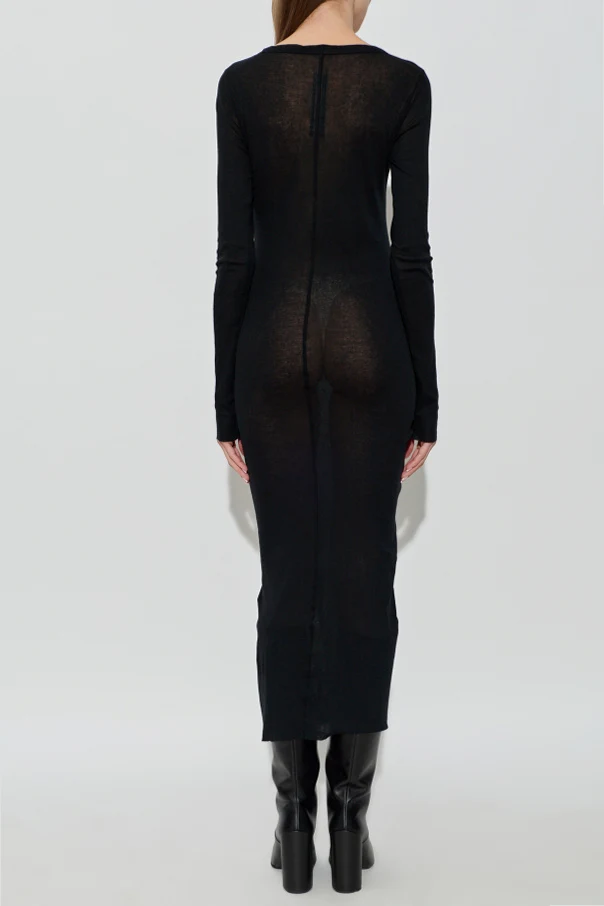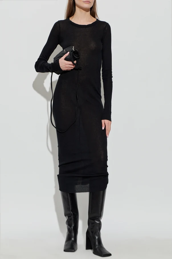 Czarna sukienka o dopasowanym kroju sygnowana przez Ricka Owensa to przejaw nieprzeciętnego kunsztu oraz współczesnego minimalizmu. Jej przylegająca sylwetka typu bodycon subtelnie podkreśla kobiece kształty, a długość sięgająca poniżej kolan nadaje całości wysublimowanego charakteru.
