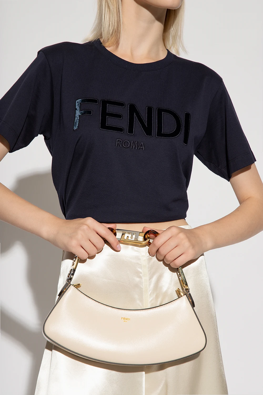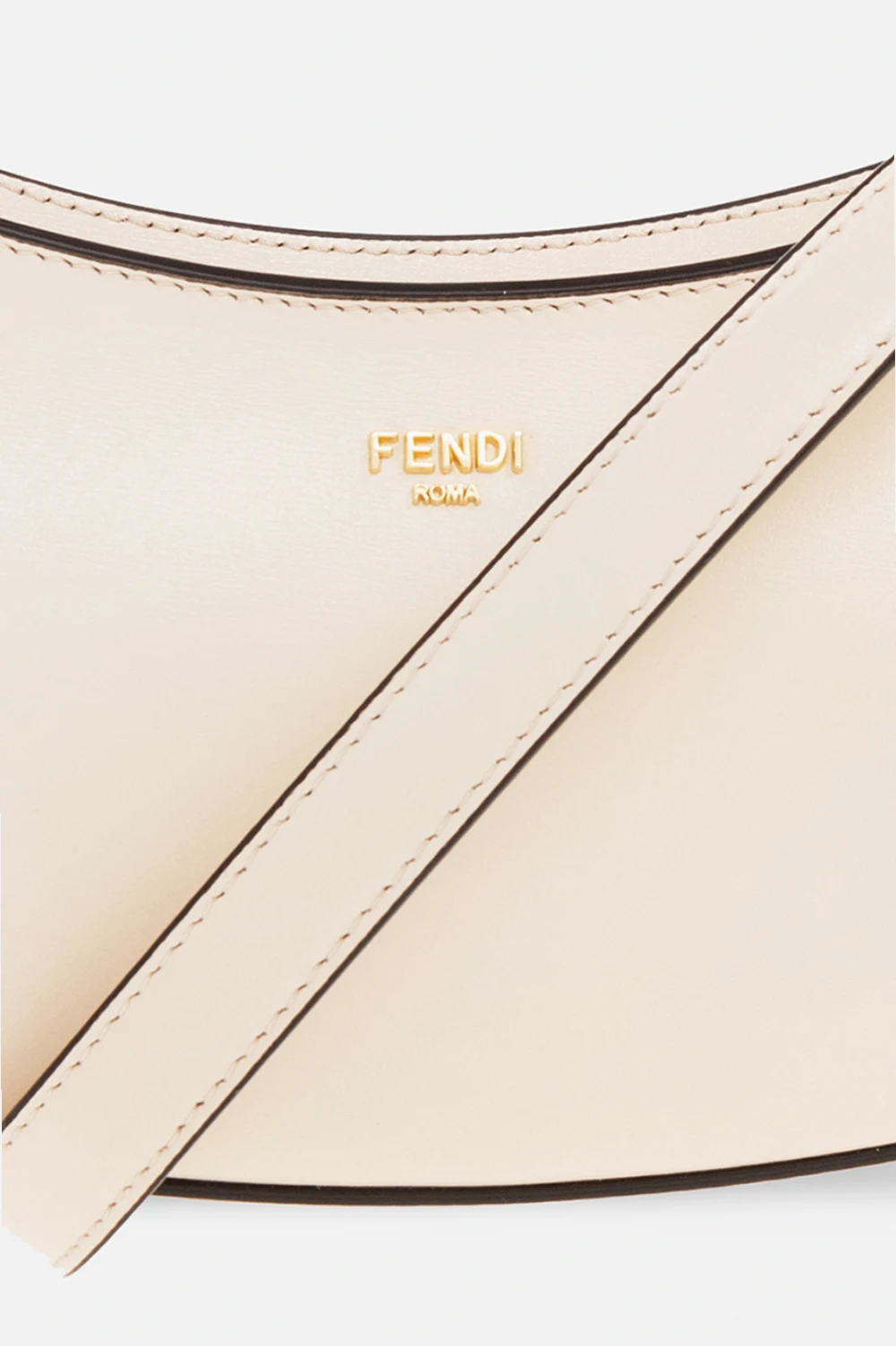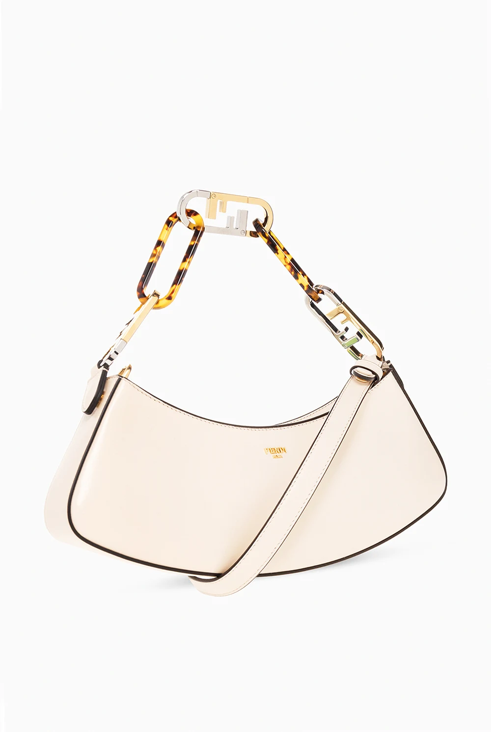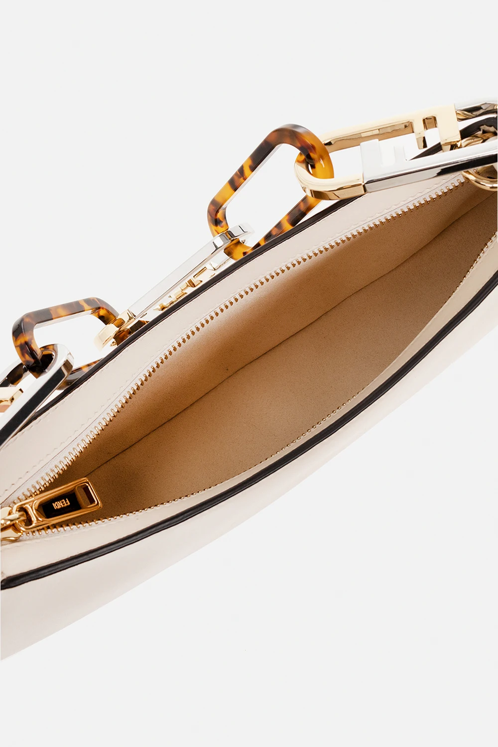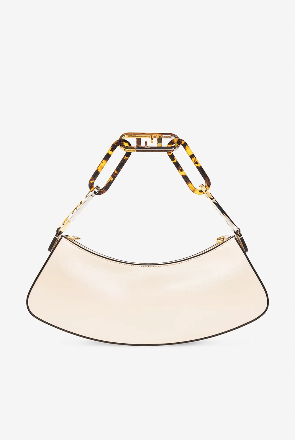 Kremowa torba na ramię typu ‘hobo’, model ‘Fendi O’Lock Swing’ Fendi. Wykonana z cielęcej skóry. Zamykana na zamek. Z przodu ozdobiona metalową aplikacją w kształcie logo w kolorze złotym. Odpinany pasek na ramię oraz łańcuch z dekoracyjnymi ogniwami w kształcie logo ‘Maxi O'Lock’ z metalu i pleksi z efektem szylkretu. Wewnątrz komora. Metalowe wykończenie w kolorze złotym.