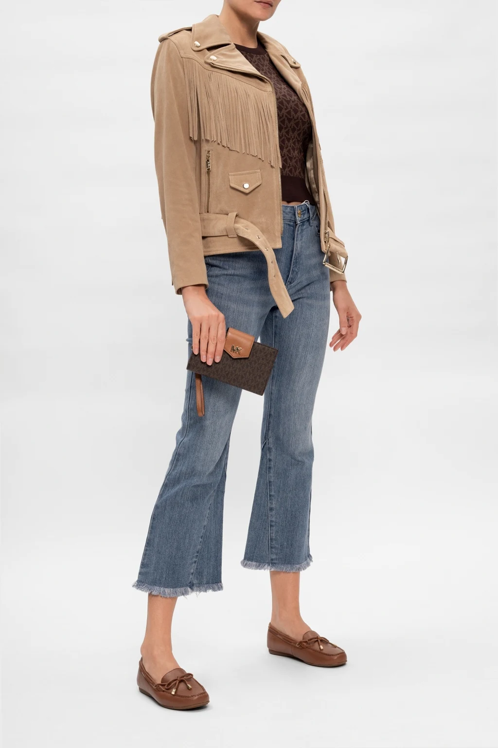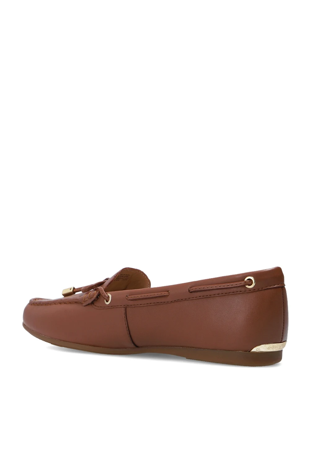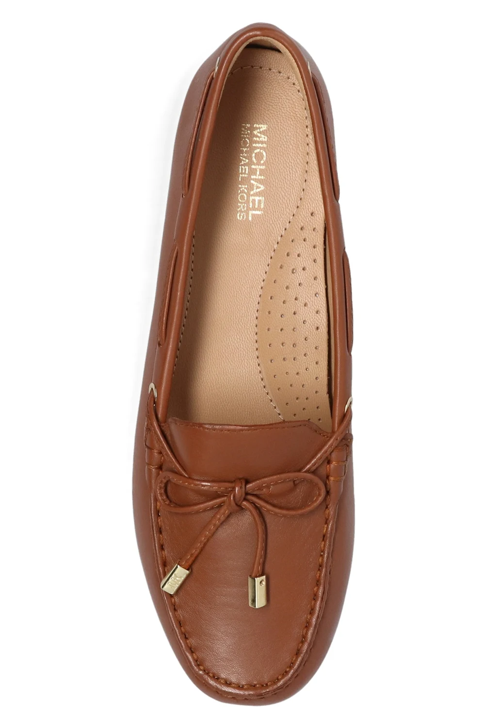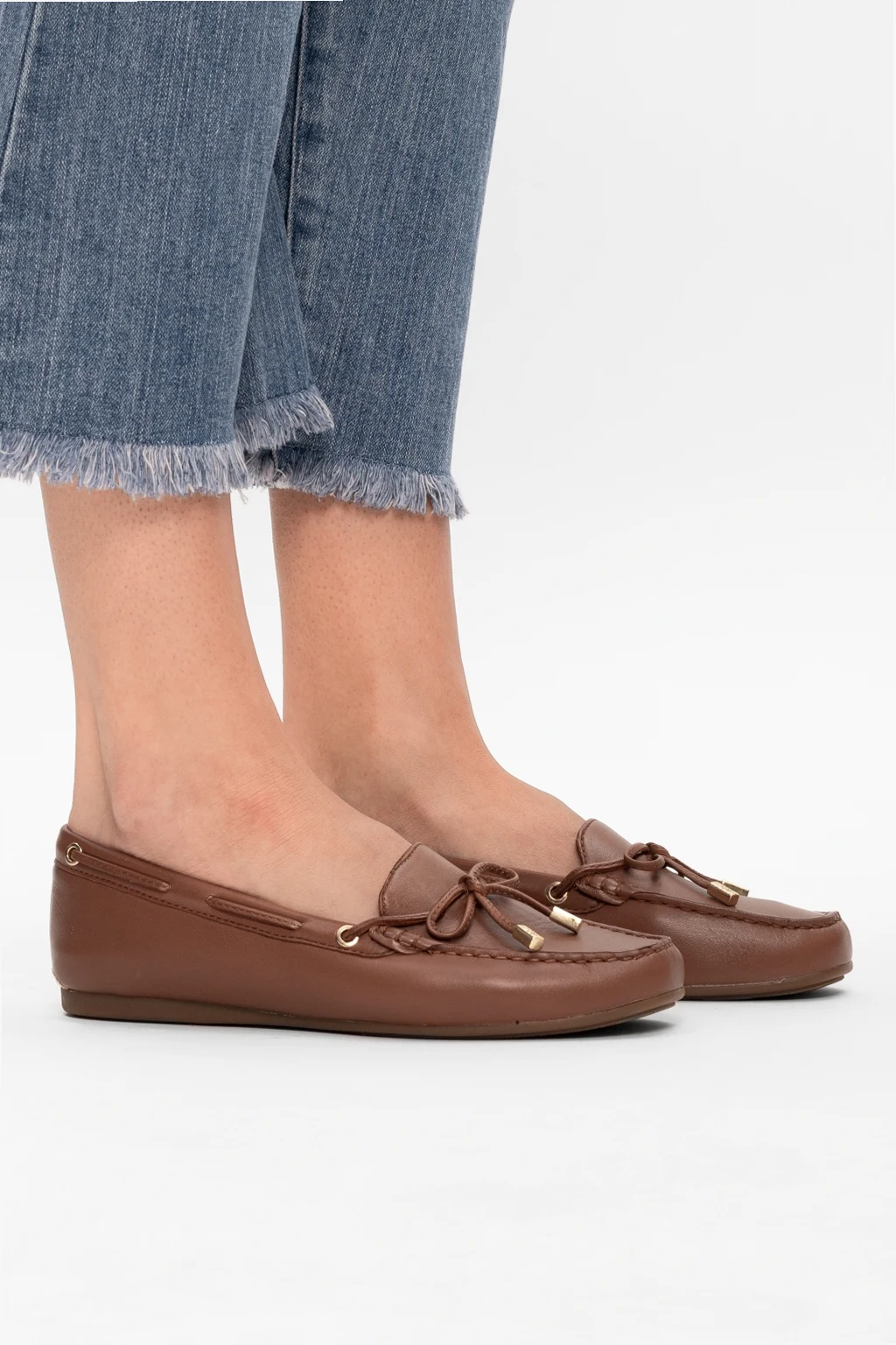 Brązowe mokasyny, model ‘Sutton Moc’ Michael Kors. Wykonane ze skóry o specjalnej fakturze. Z przodu aplikacja w kształcie kokardy z logo. Brązowa, gumowa podeszwa.