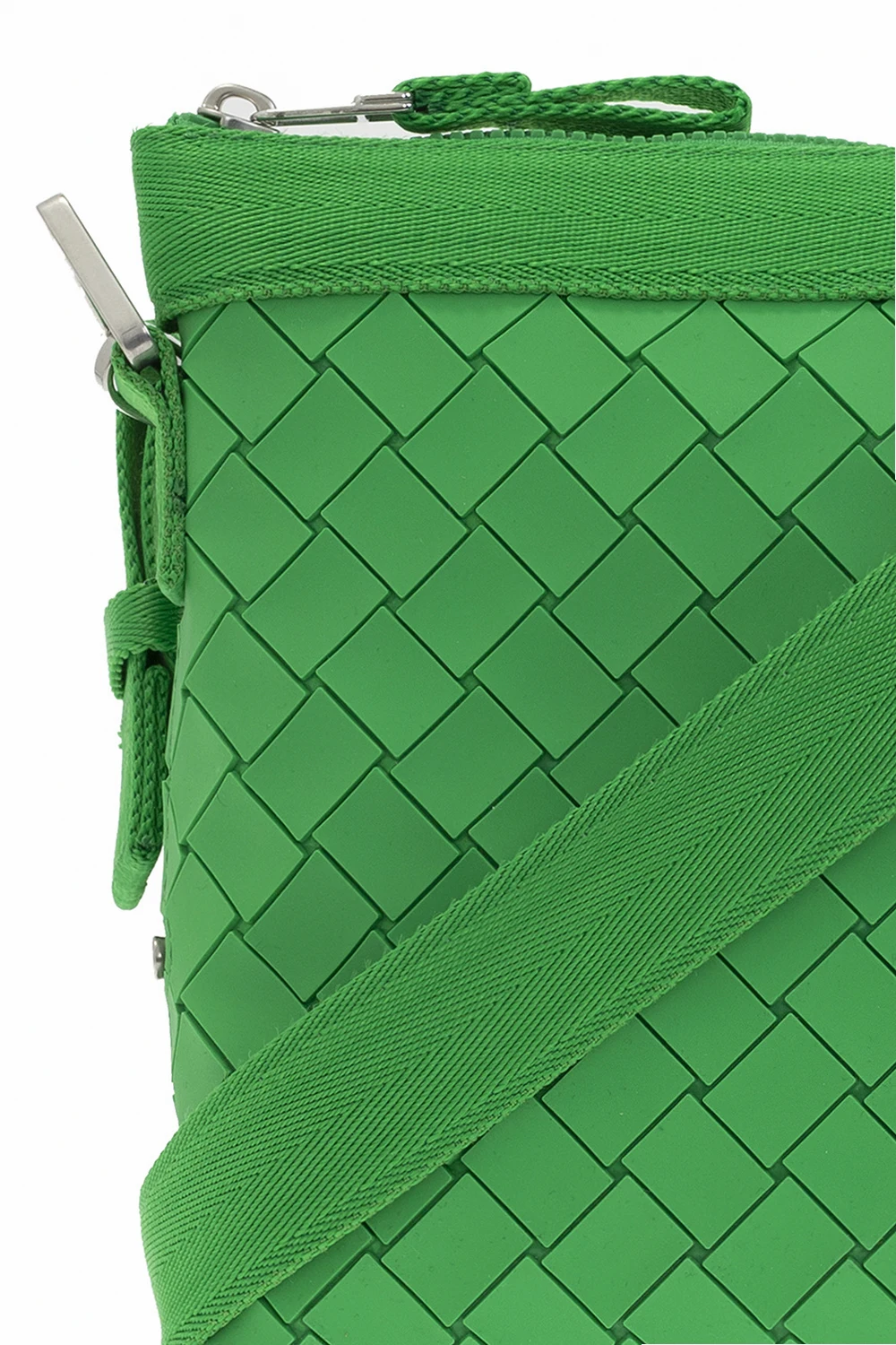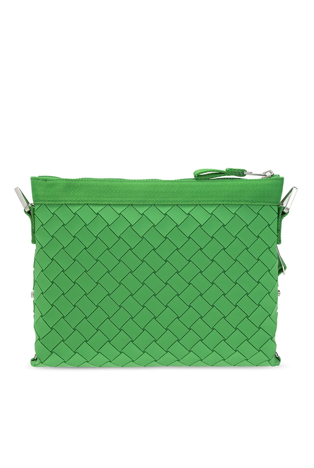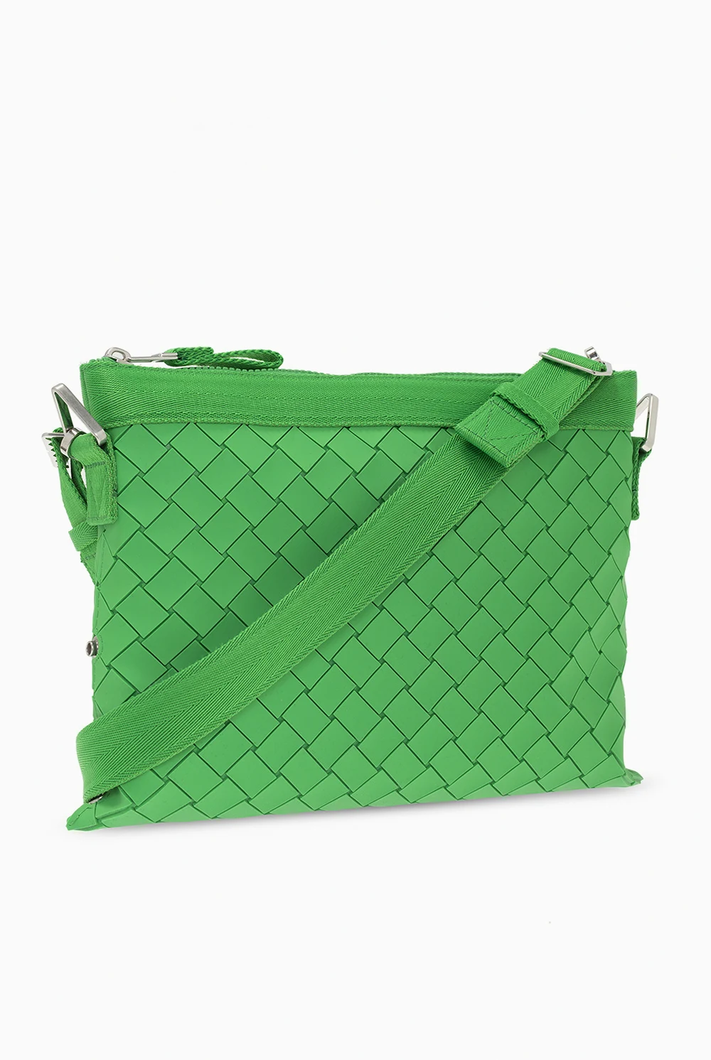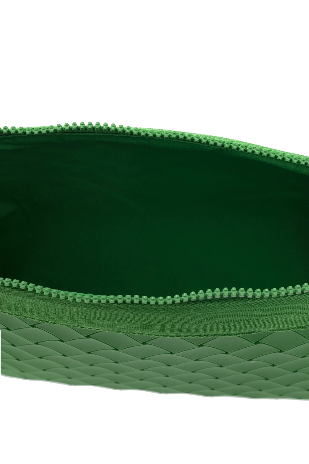 Zielona, gumowa torba na ramię, model 'Buffer’ Bottega Veneta. Zamykana na zamek. Ozdobiona charakterystyczną plecionką ‘Intrecciato’. Regulowany pas. Wewnątrz komora. Metalowe elementy w kolorze srebrnym.