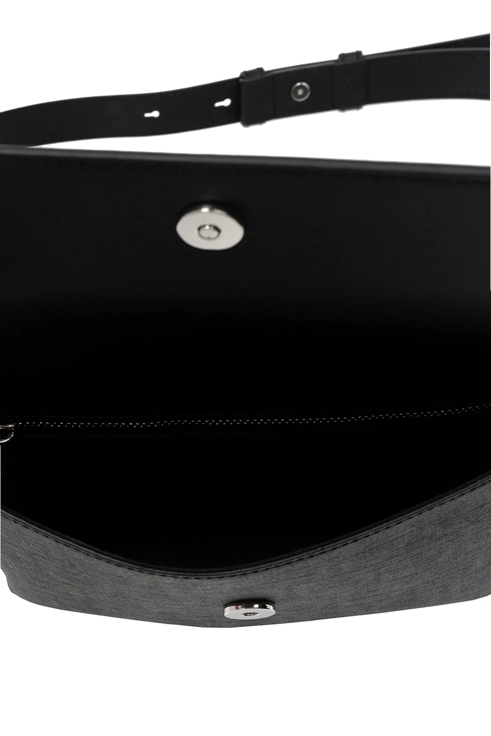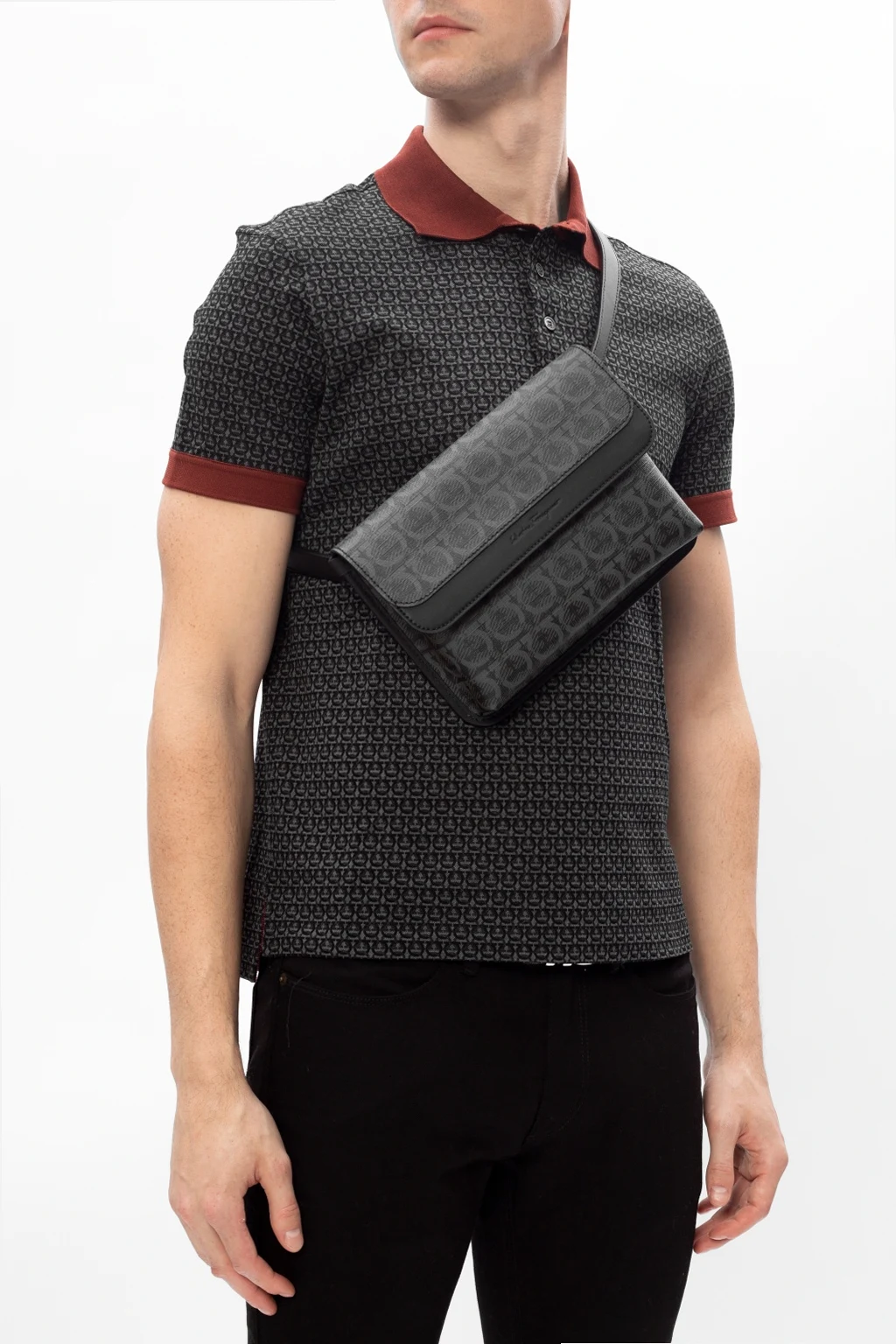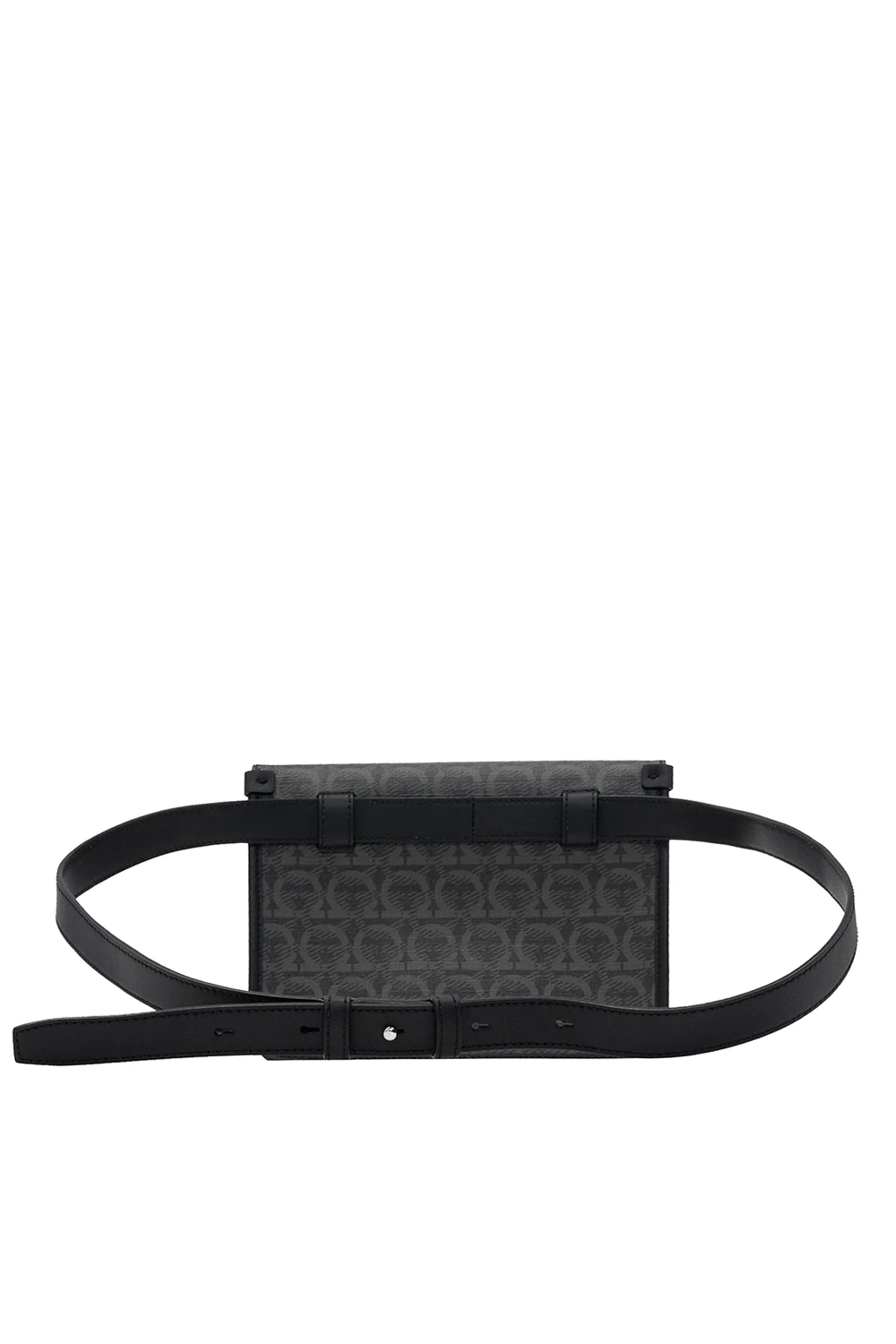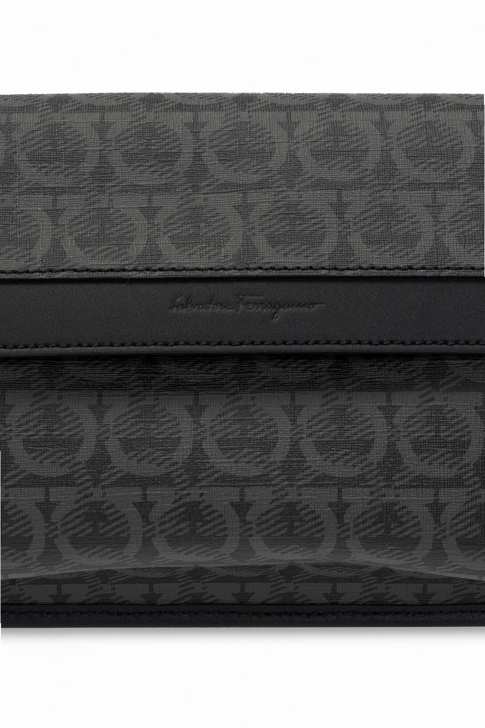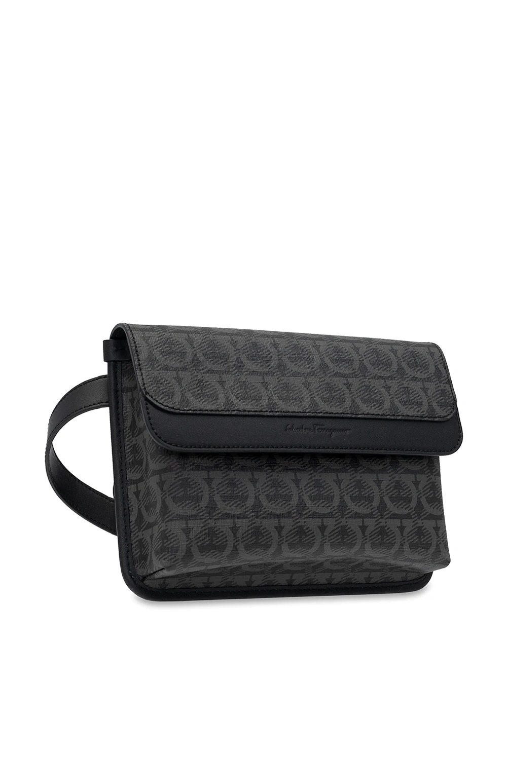 Czarno-szara torba na pas Salvatore Ferragamo. Wykonana ze skóry cielęcej. Zamykana na zatrzask. Ozdobiona wytłoczonym oraz nadrukowanym logo. Regulowany pas biodrowy. Wewnątrz komora oraz kieszeń zamykana na zamek.