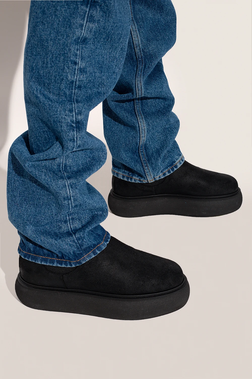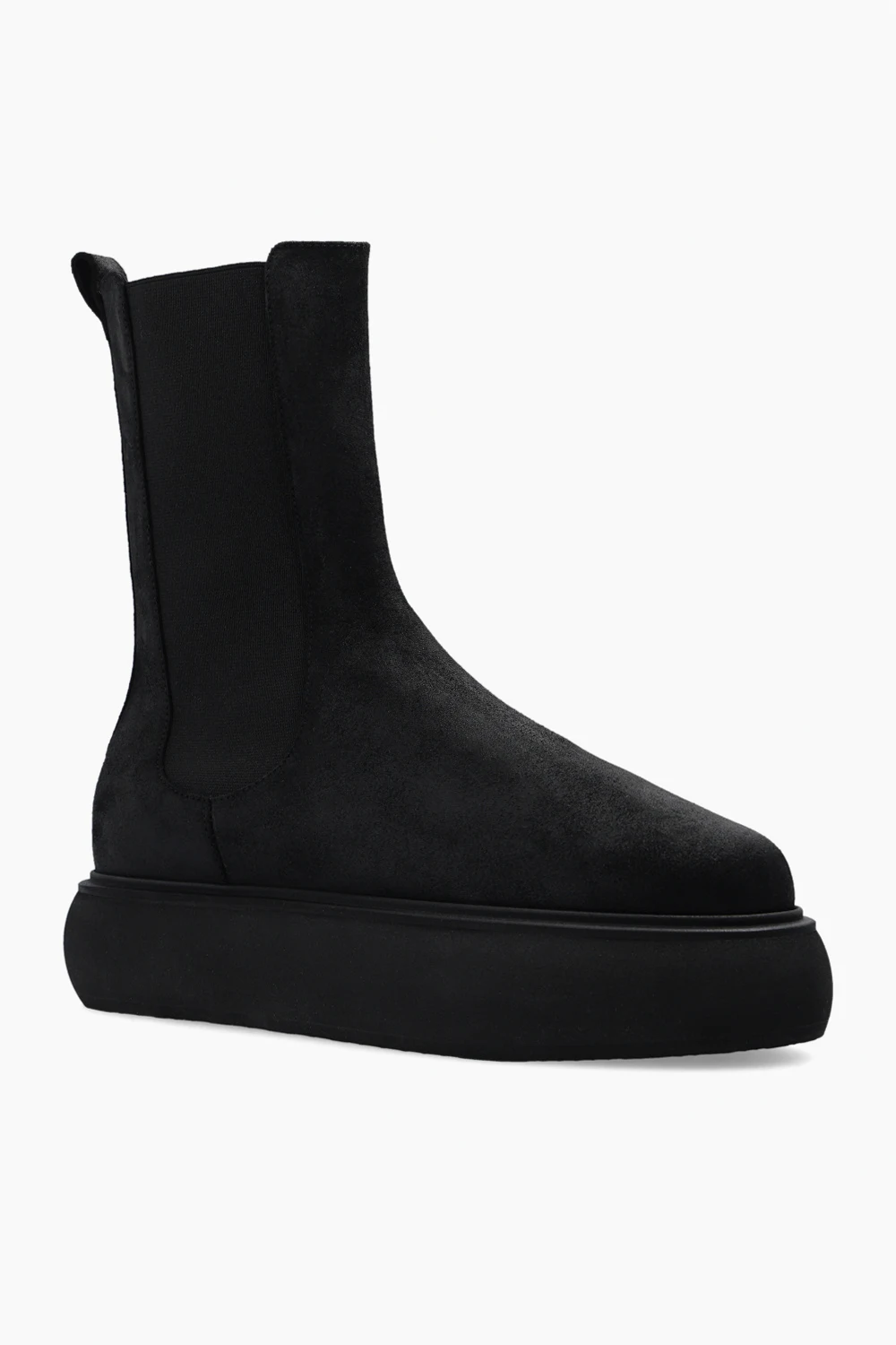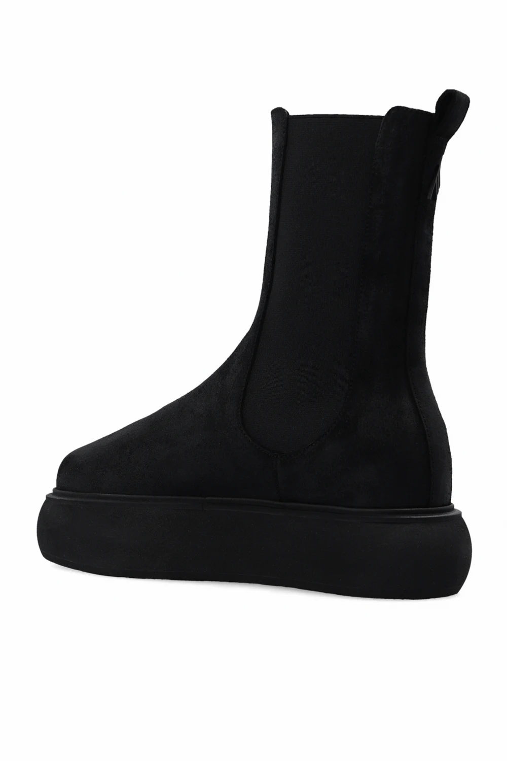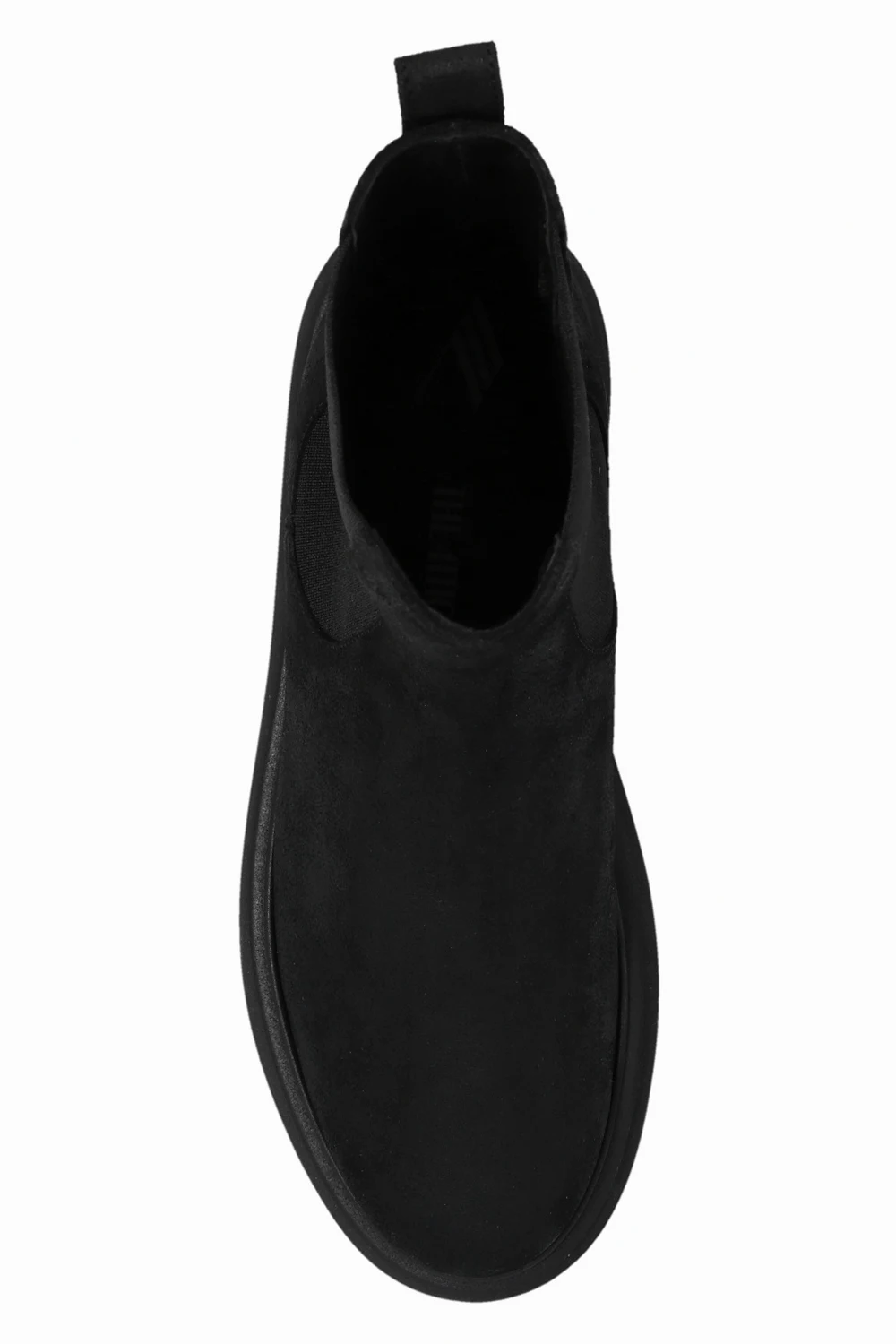 Czarne buty za kostkę na platformie, model ‘Selene’ The Attico. Wykonane z zamszu. Po bokach wszyta guma. Czarna, gumowa podeszwa.