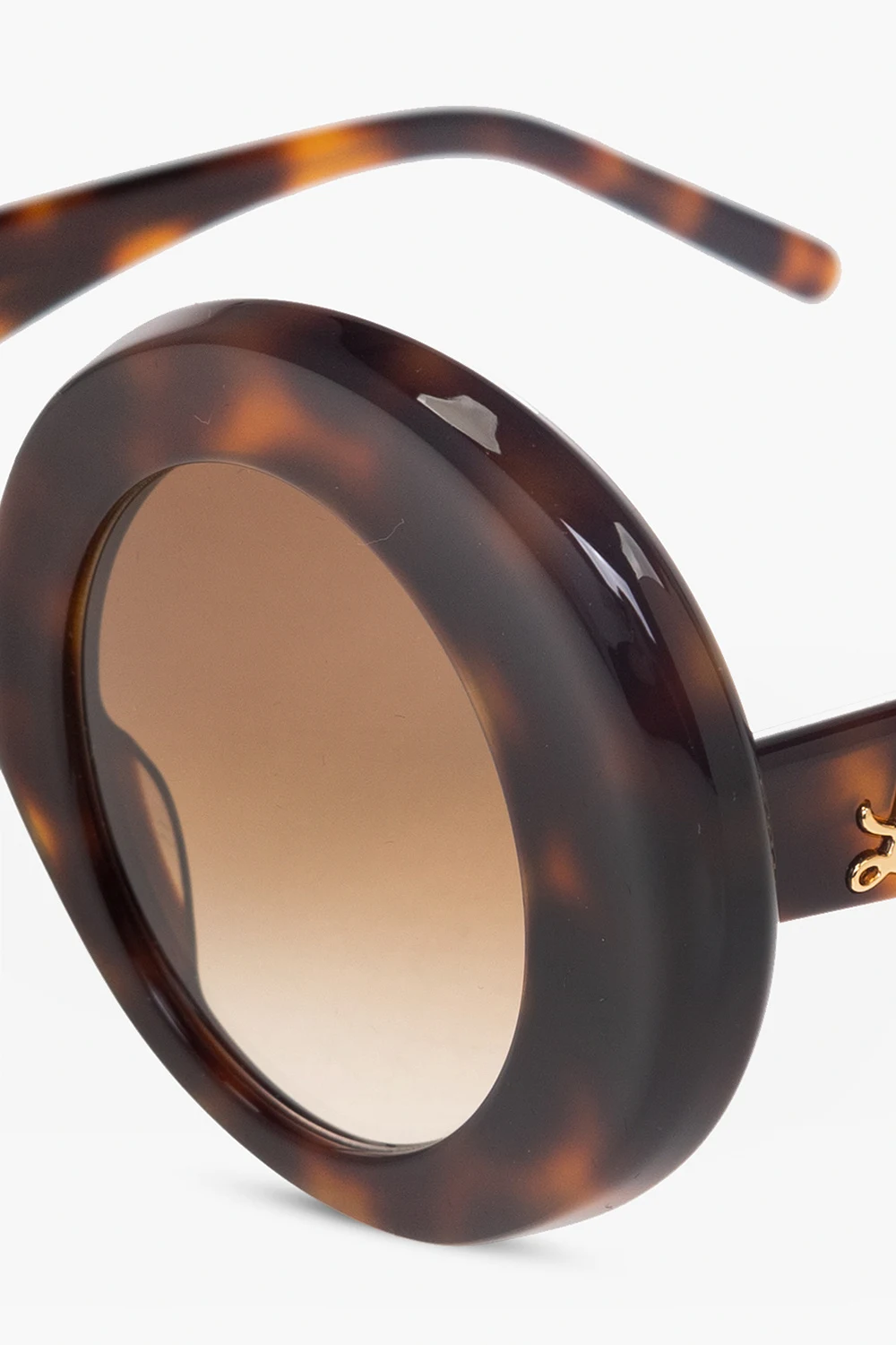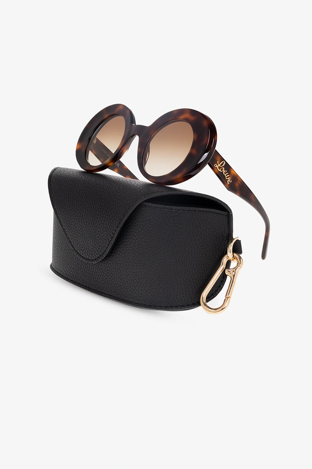 Brązowo-czarne, szylkretowe okulary przeciwsłoneczne Loewe. Okrągłe oprawki. Zauszniki ozdobione wypukłym logo w kolorze złotym. Brązowe, gradientowe szkła ze 100% ochroną przed promieniowaniem UV. Dołączone etui w losowo wybranym kolorze.