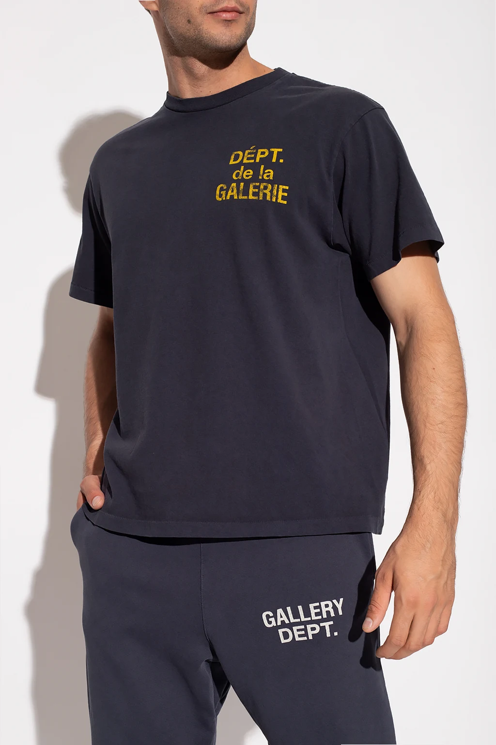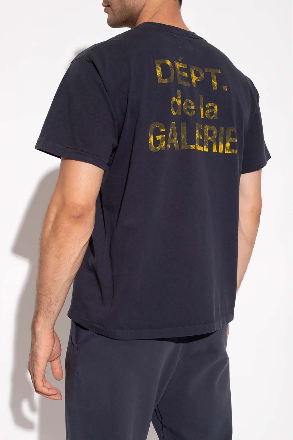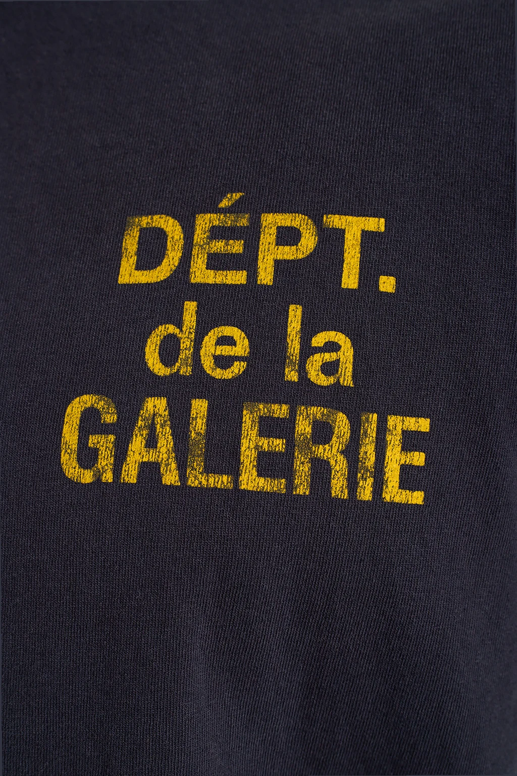 Granatowy t-shirt GALLERY DEPT. Wykonany z bawełny. Ozdobiony żółtym nadrukiem z logo. Okrągły dekolt wykończony ściągaczem. Krótkie rękawy.