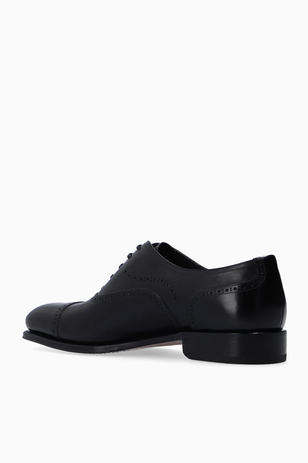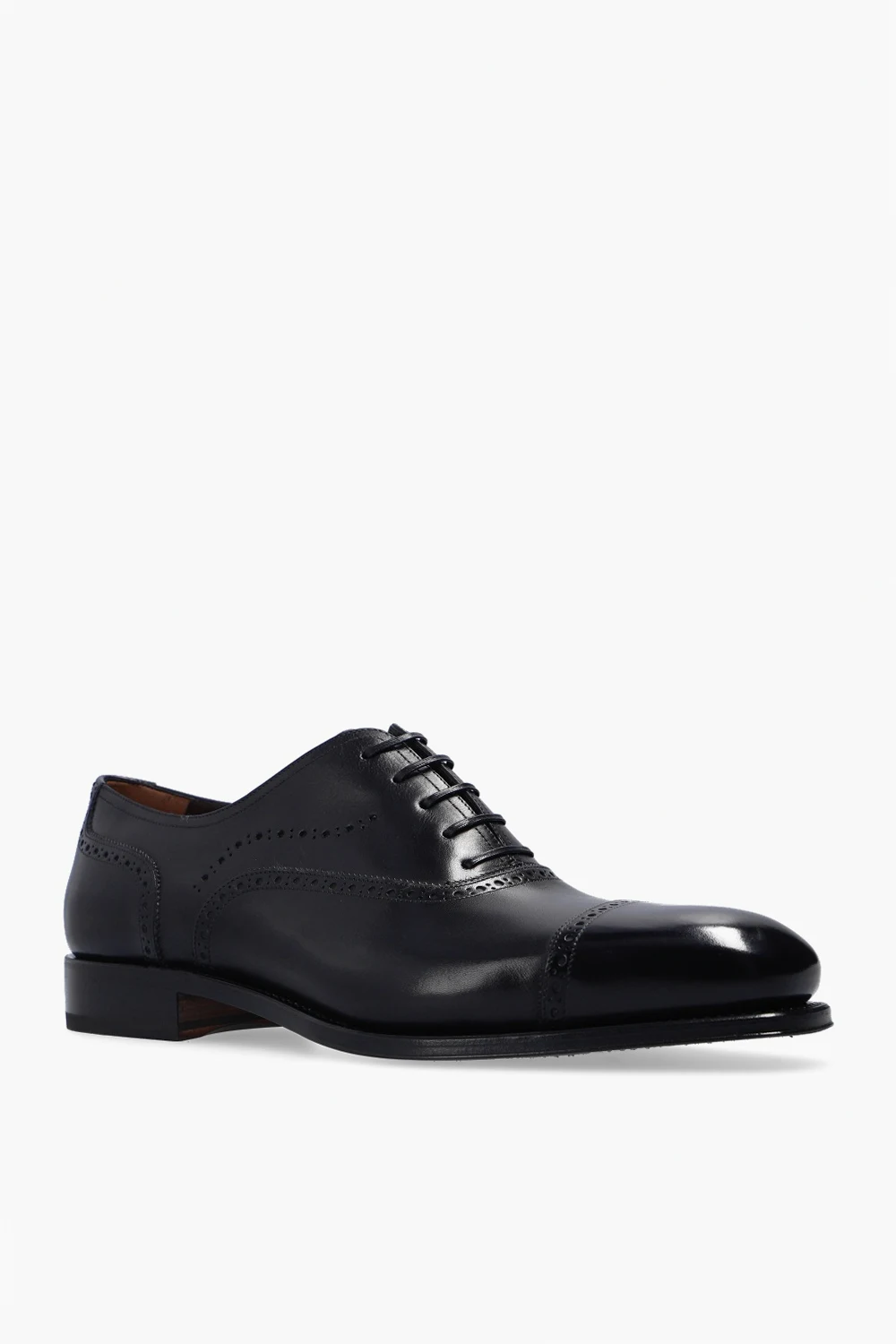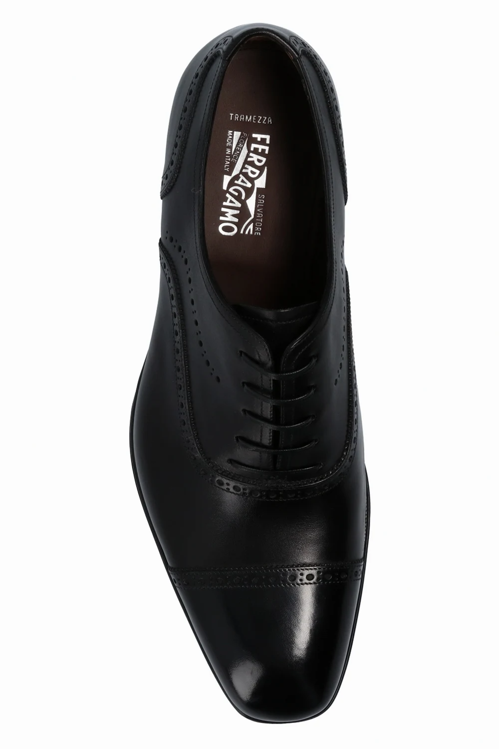 Czarne, sznurowane buty, model ‘Pizzarro’ Salvatore Ferragamo. Wykonane ze skóry cielęcej. Ozdobione dekoracyjnymi perforacjami. Brązowo-czarna, skórzana podeszwa.