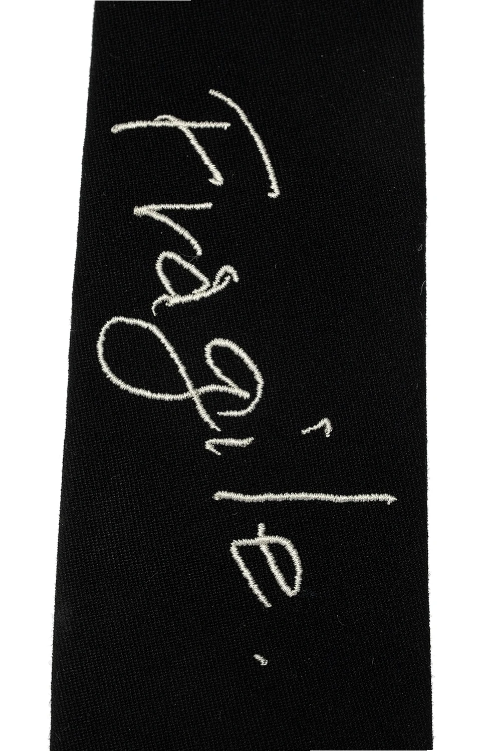 Czarny krawat Yohji Yamamoto. Wykonany z wełny. Wyszyty napis w kolorze białym.