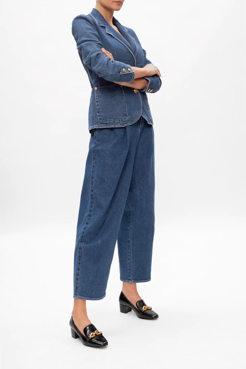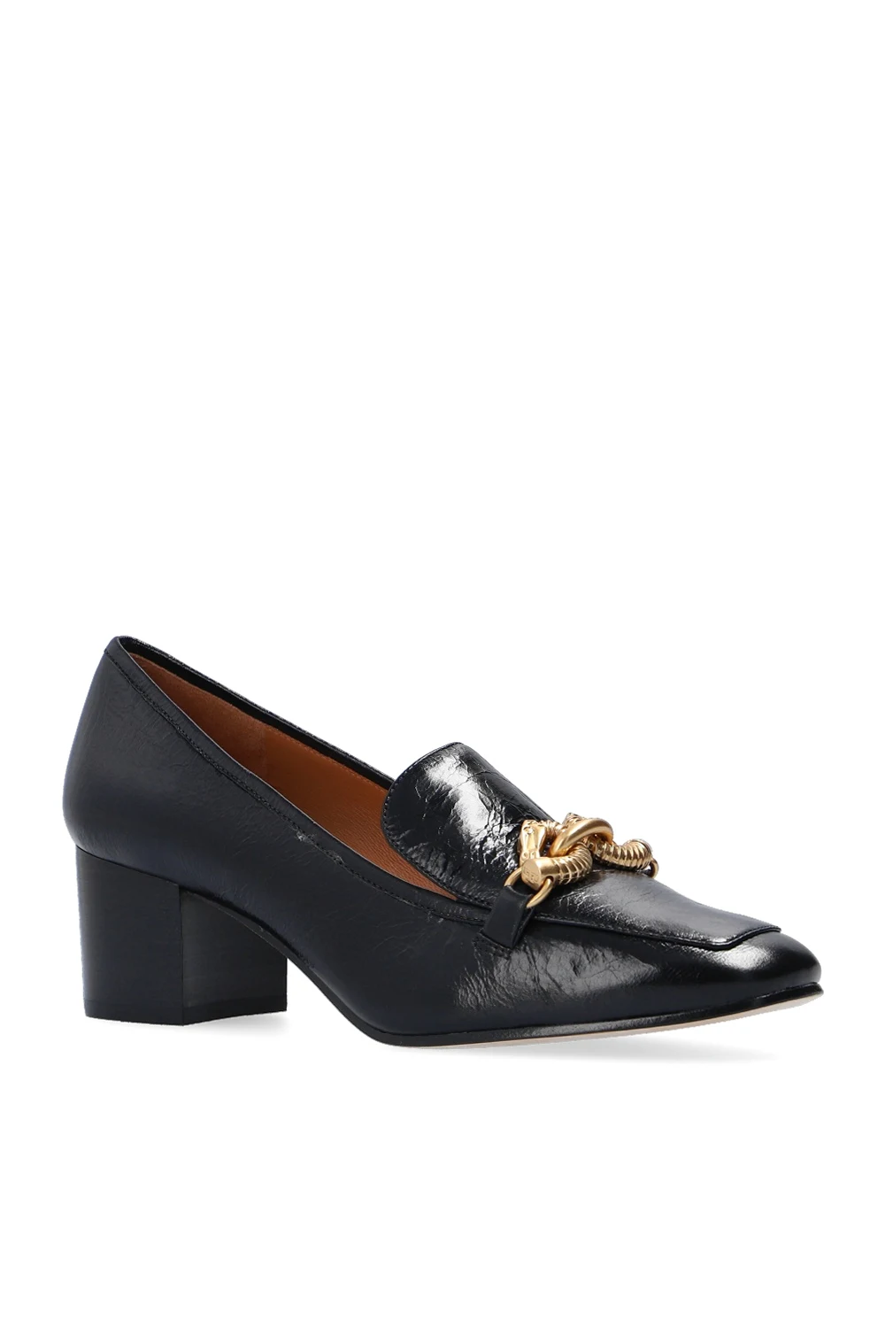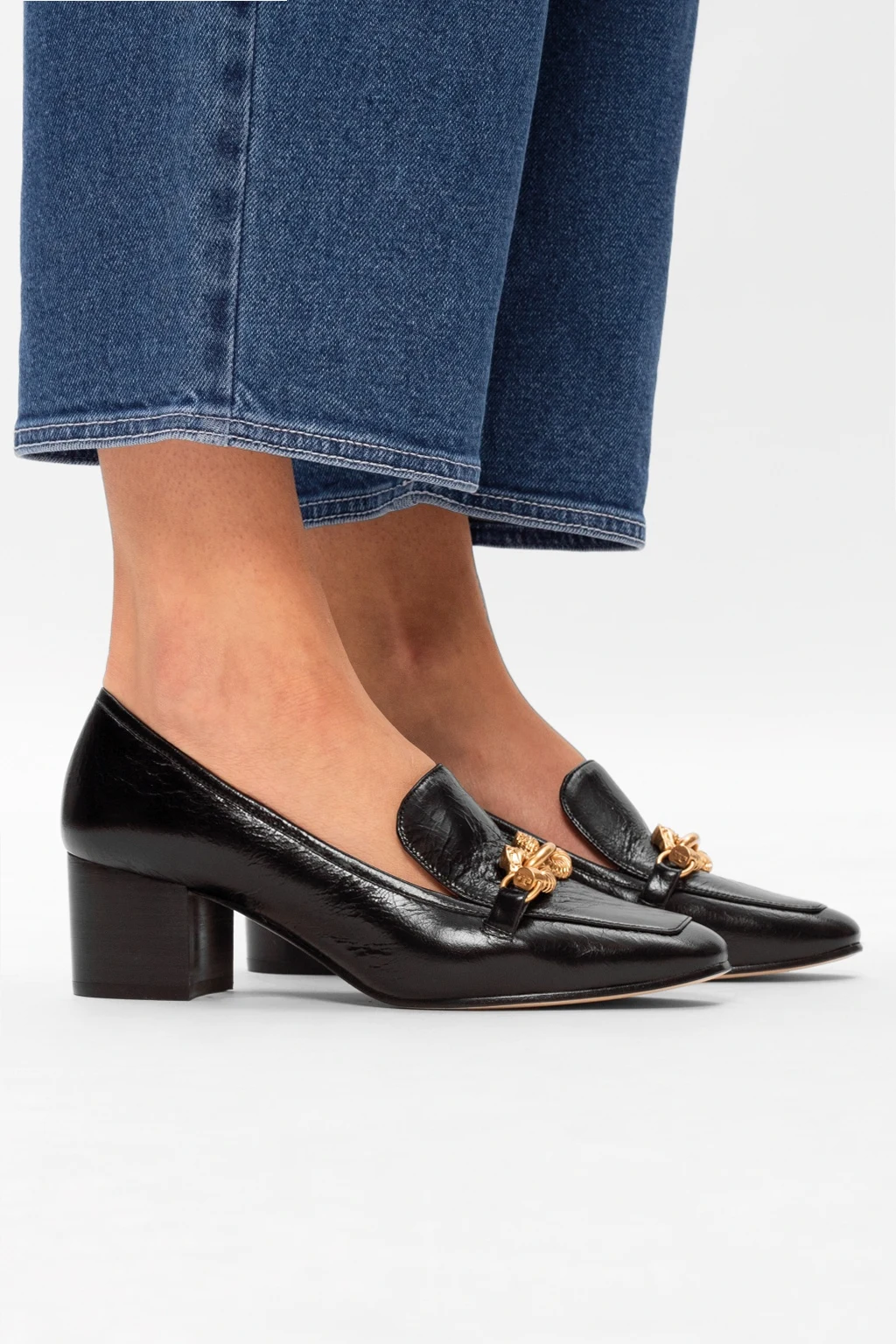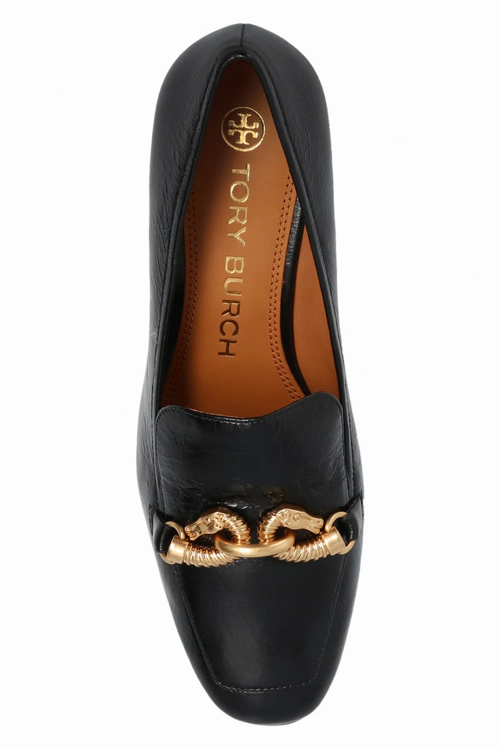 Czarne mokasyny Tory Burch. Wykonane z połyskującej skóry. Ozdobione metalową aplikacją z logo w kolorze złotym. Beżowo-czarna podeszwa.