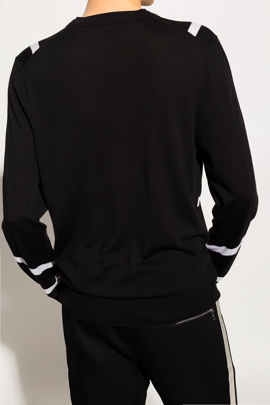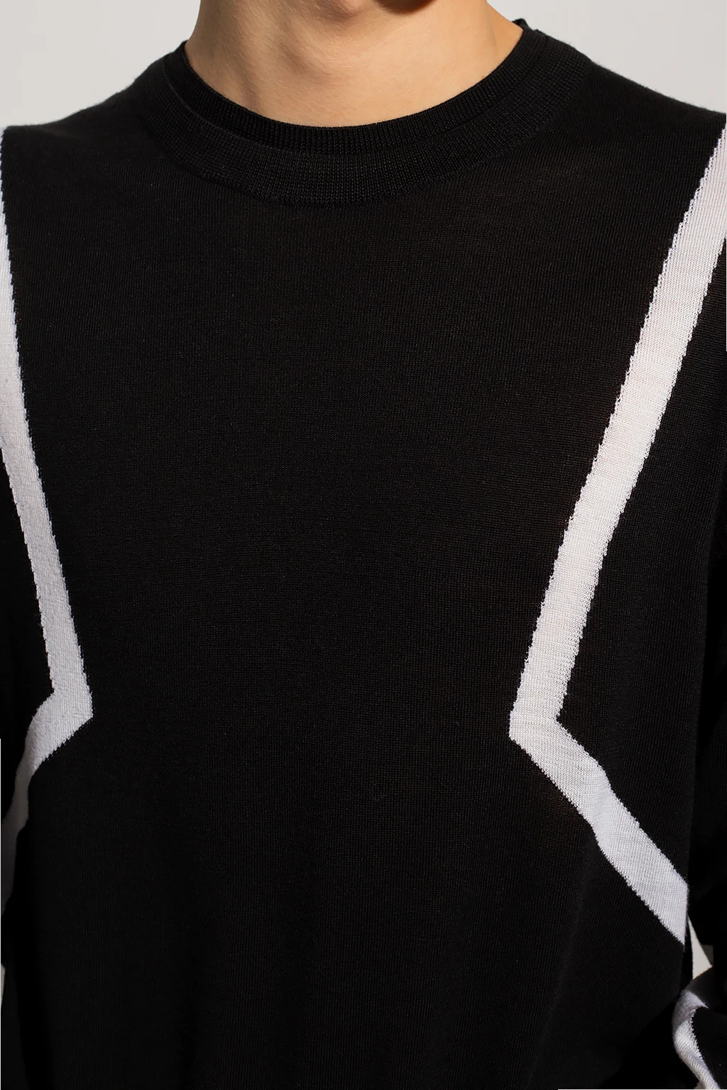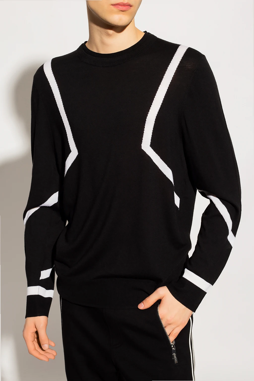 Czarny sweter Neil Barrett. Wykonany z wełny. Wyszyty wzór w kolorze białym. Okrągły dekolt, rękawy i dół zakończone ściągaczem.