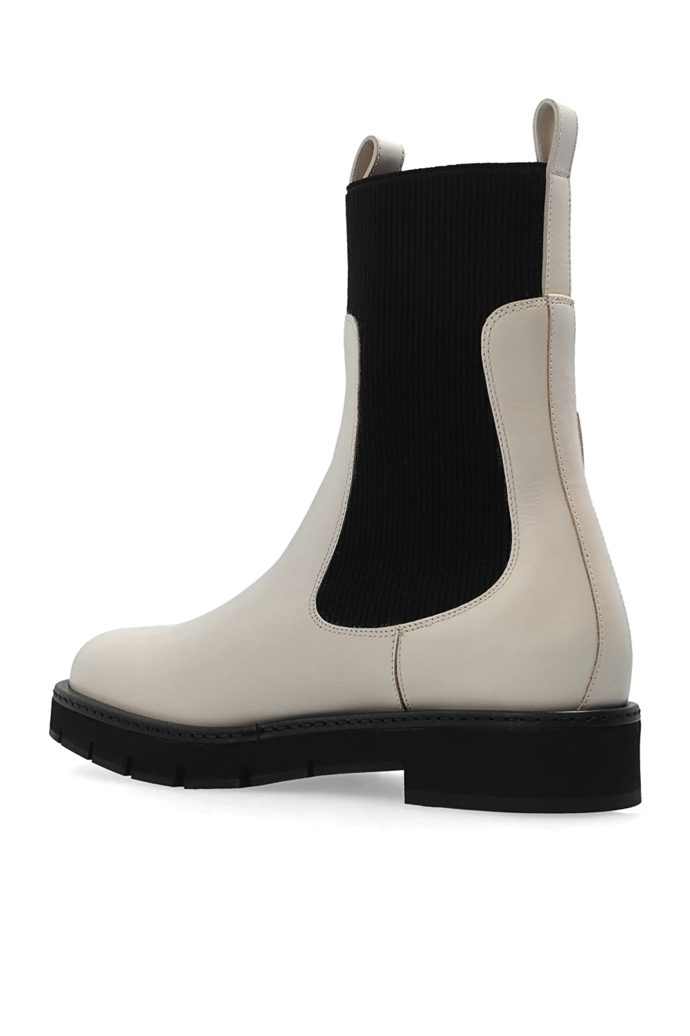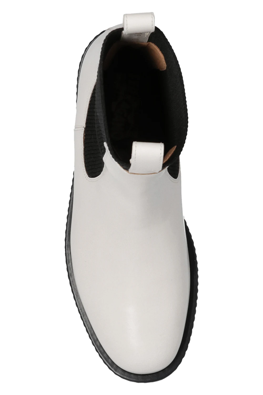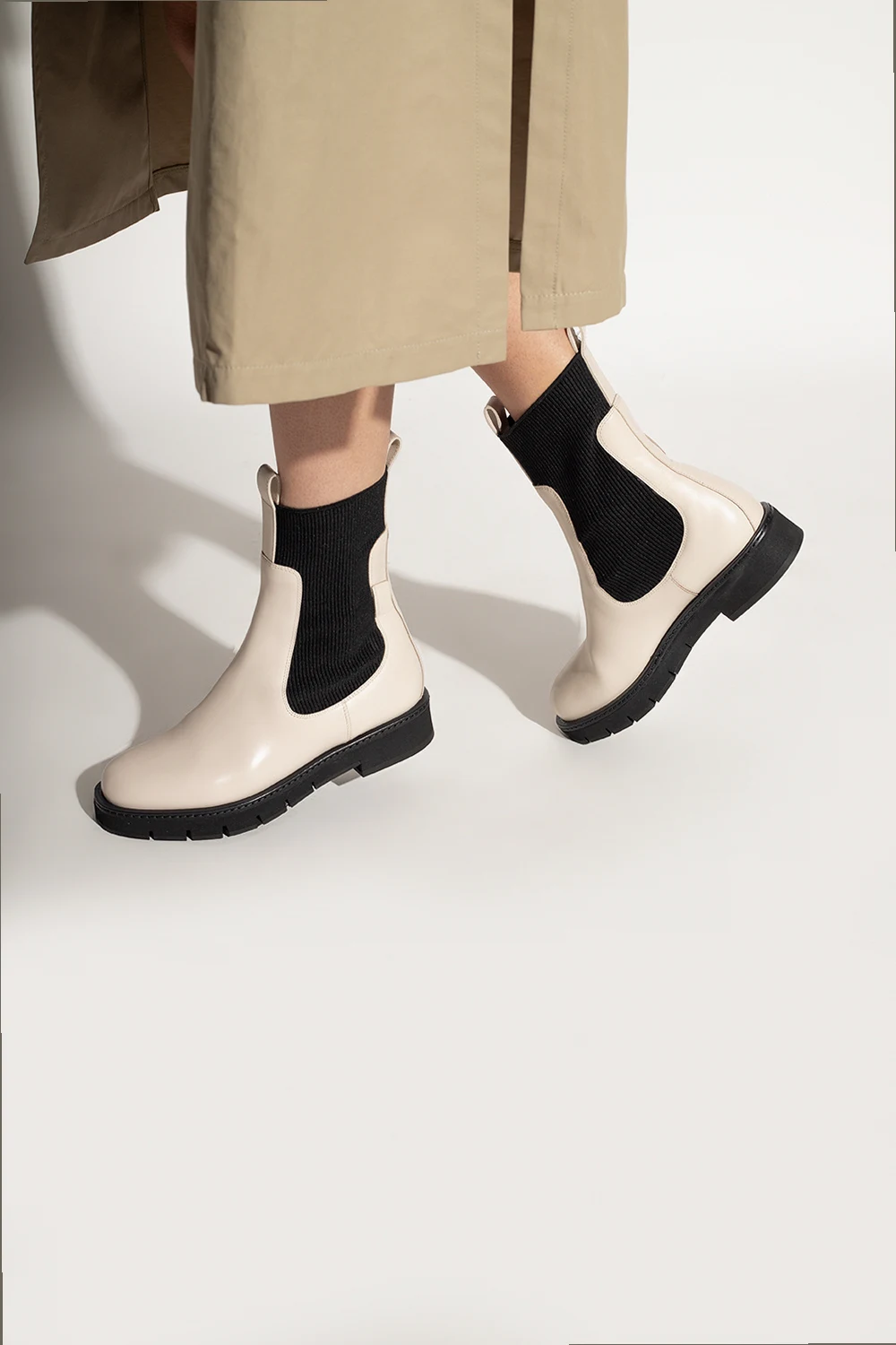 Kremowo-czarne botki, model ‘Rook’ Salvatore Ferragamo. Wykonane z cielęcej skóry. Po bokach wszyta taśma elastyczna. Czarna, gumowa podeszwa.