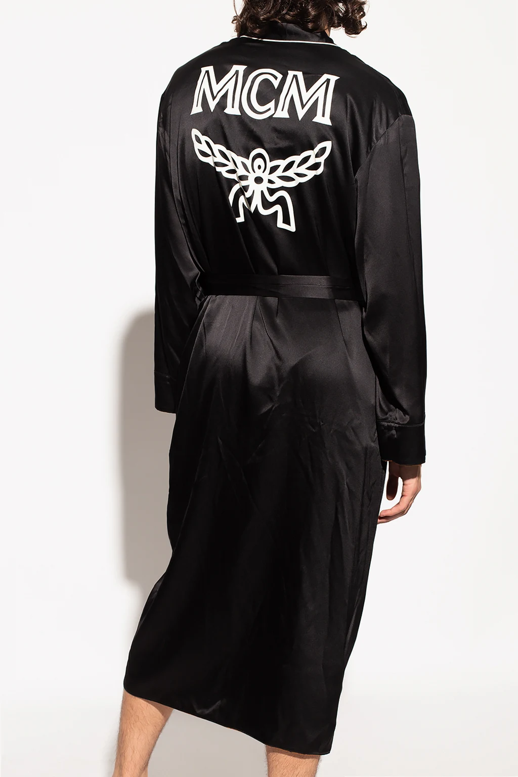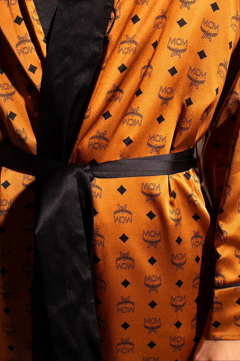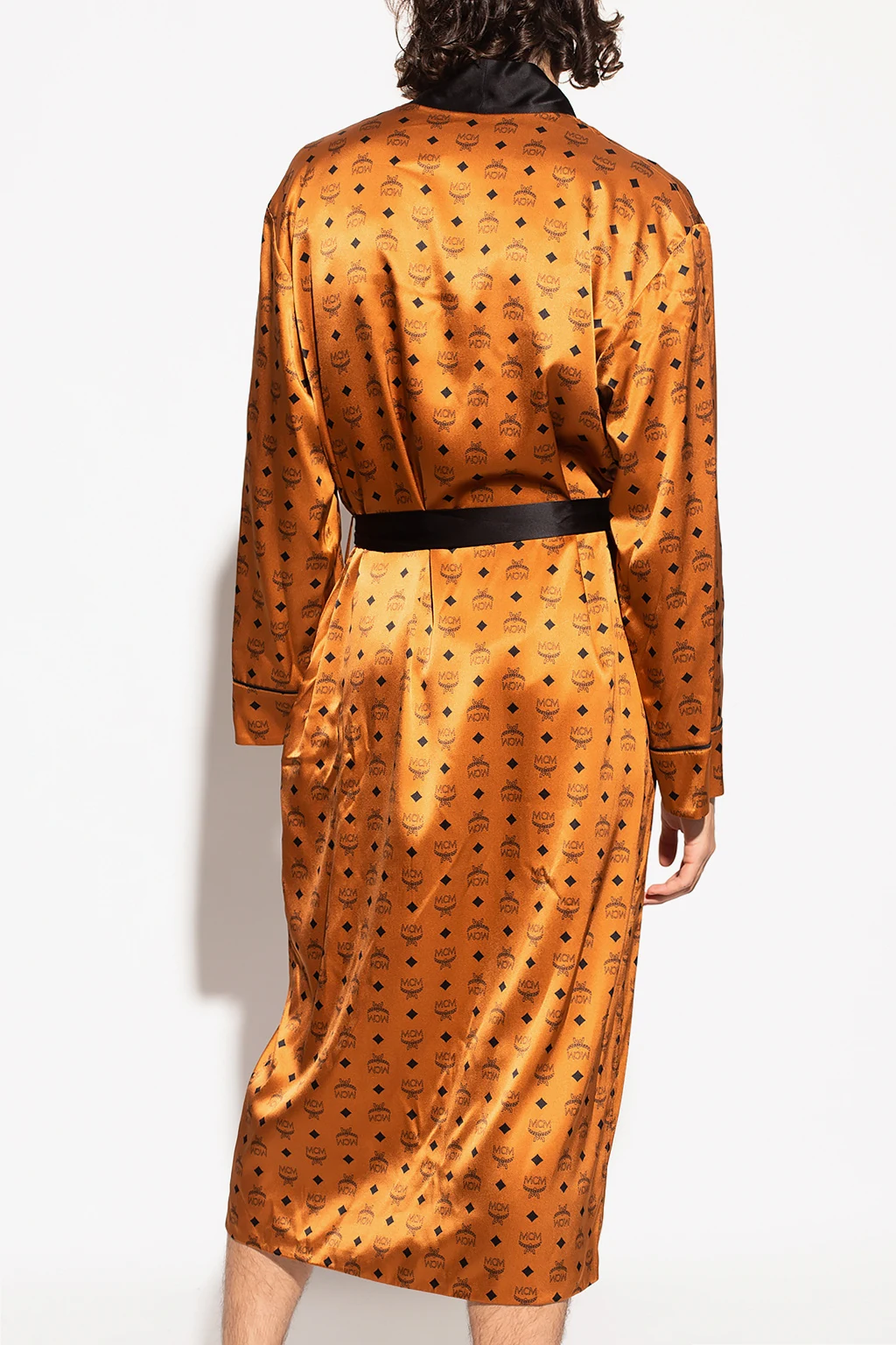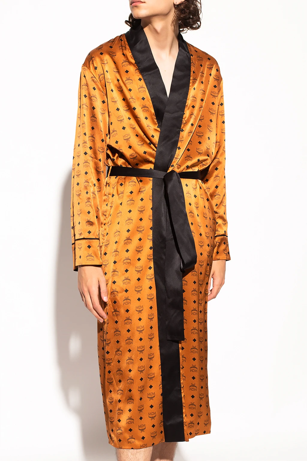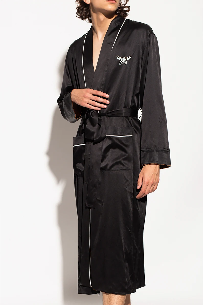 Brązowo-czarny, dwustronny szlafrok MCM. Wykonany z jedwabiu. Ozdobiony wzorem z logo. Dwie wsuwane kieszenie. Wiązany w pasie. Strona wewnętrzna w kolorze czarnym.