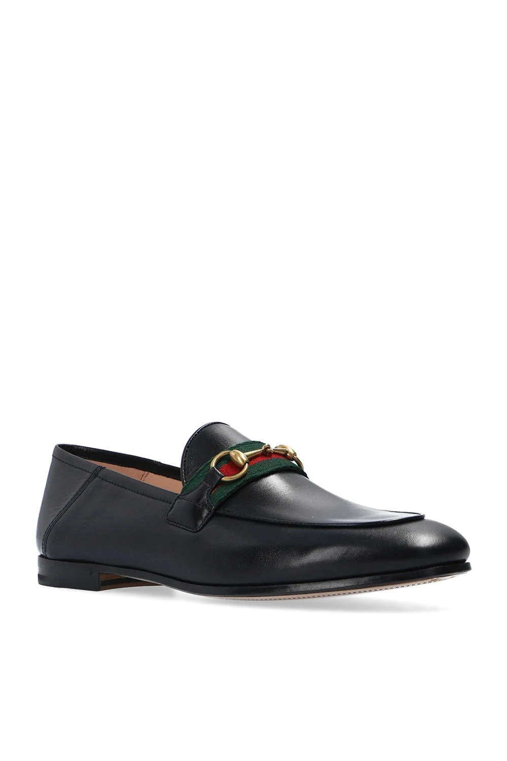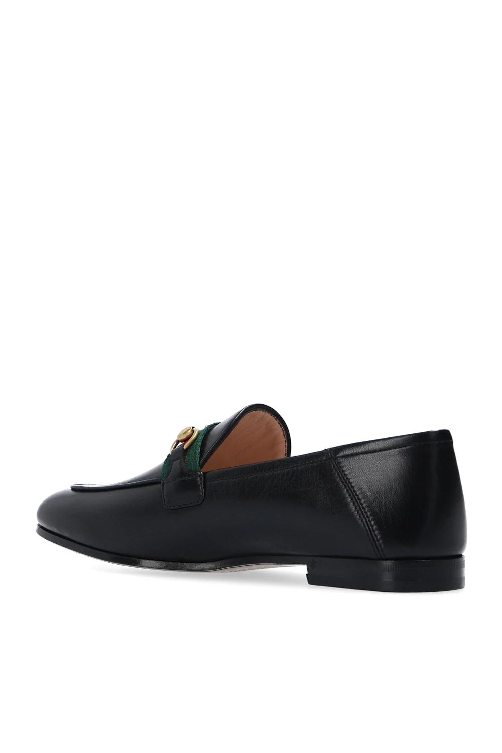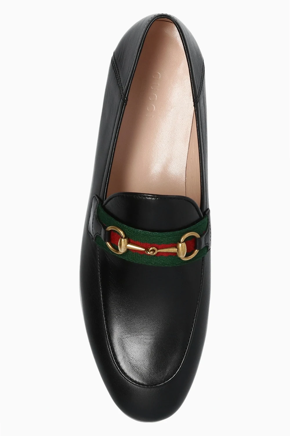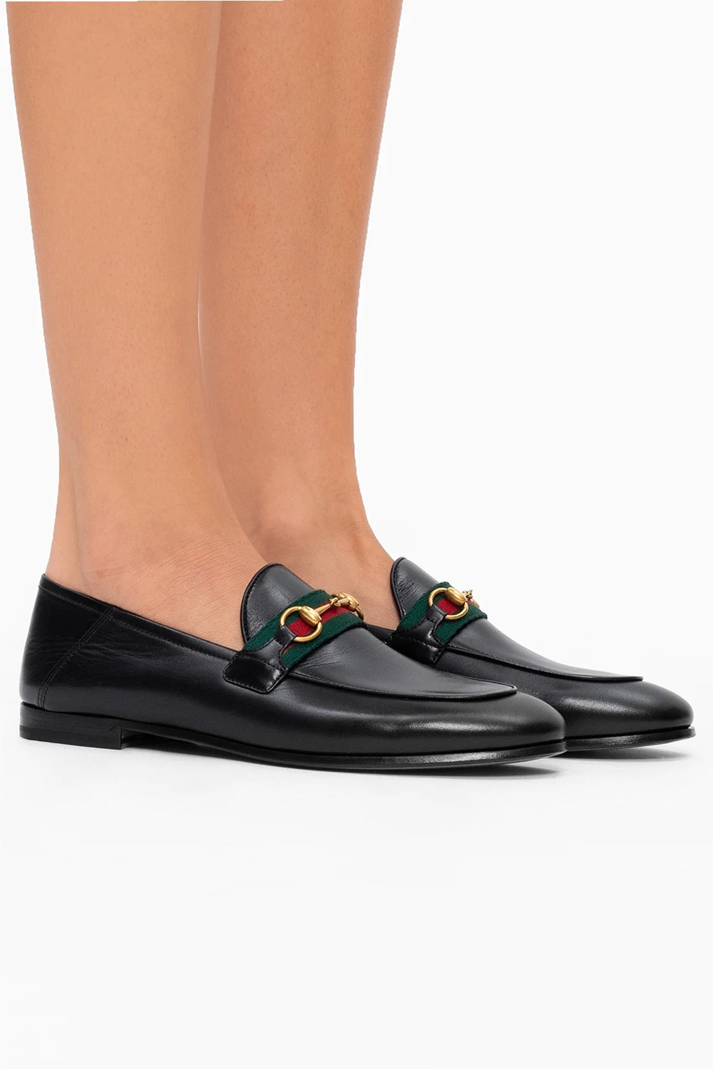 Czarne mokasyny Gucci. Wykonane ze skóry. Ozdobione charakterystycznym dla marki pasem ‘Web’ w kolorze czerwono-zielonym oraz aplikacją ‘Horsebit’. Migdałowy nosek. Beżowa, skórzana podeszwa.