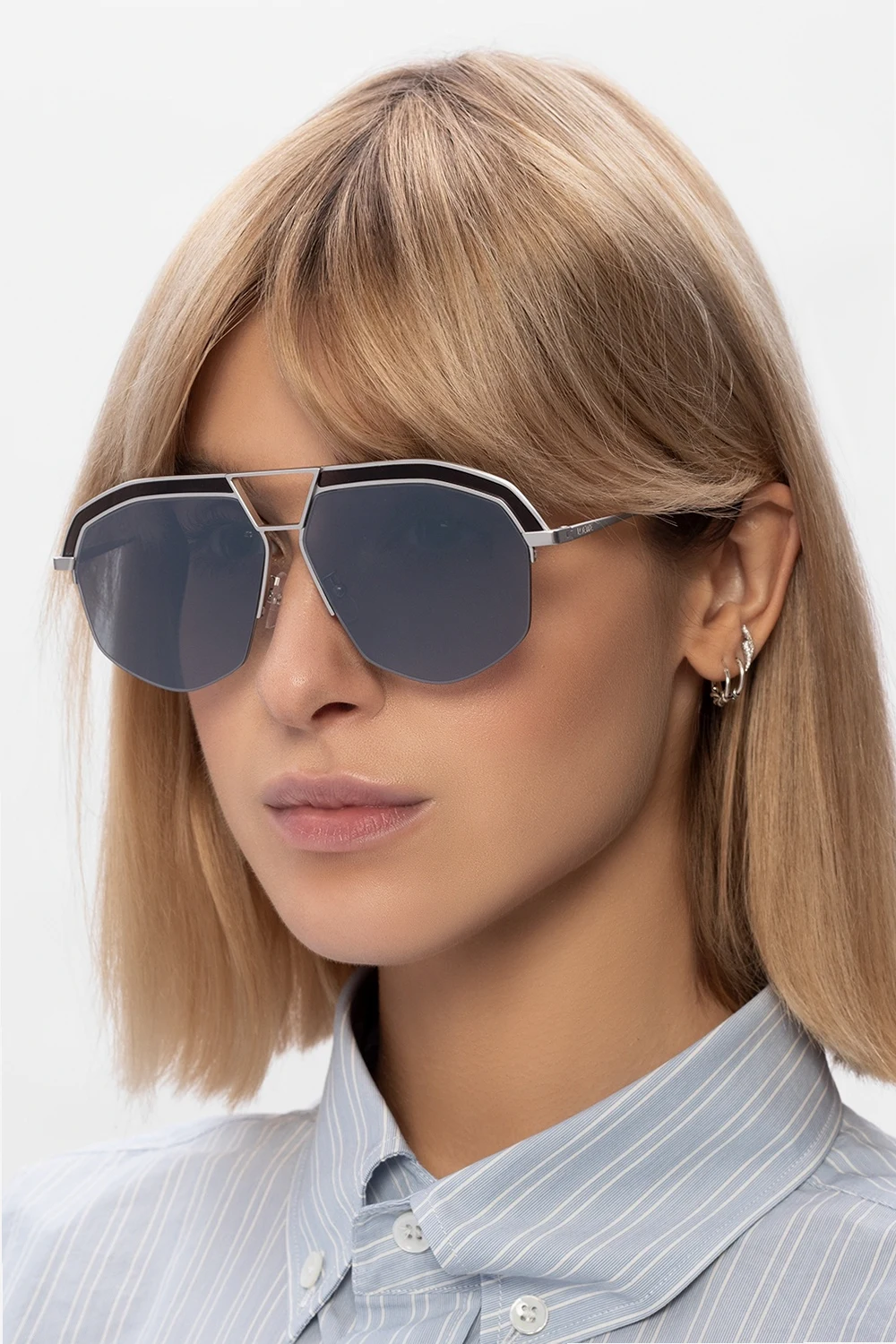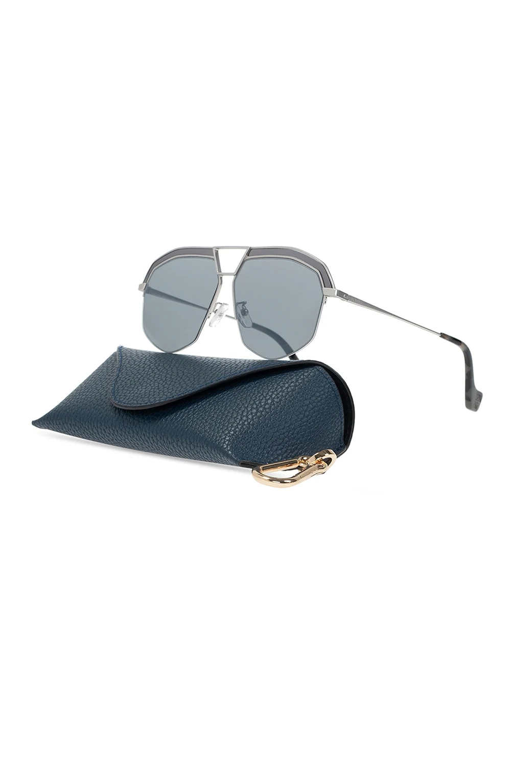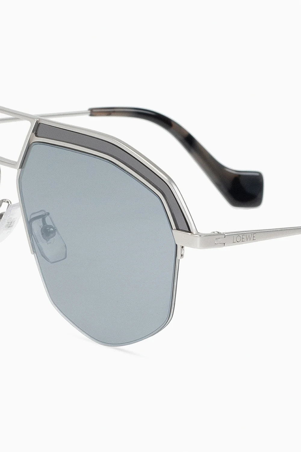Okulary przeciwsłoneczne w kolorze srebrnym Loewe. Zauszniki z wytłoczonym logo. Czarne, certyfikowane soczewki 100% UVA i UVB.