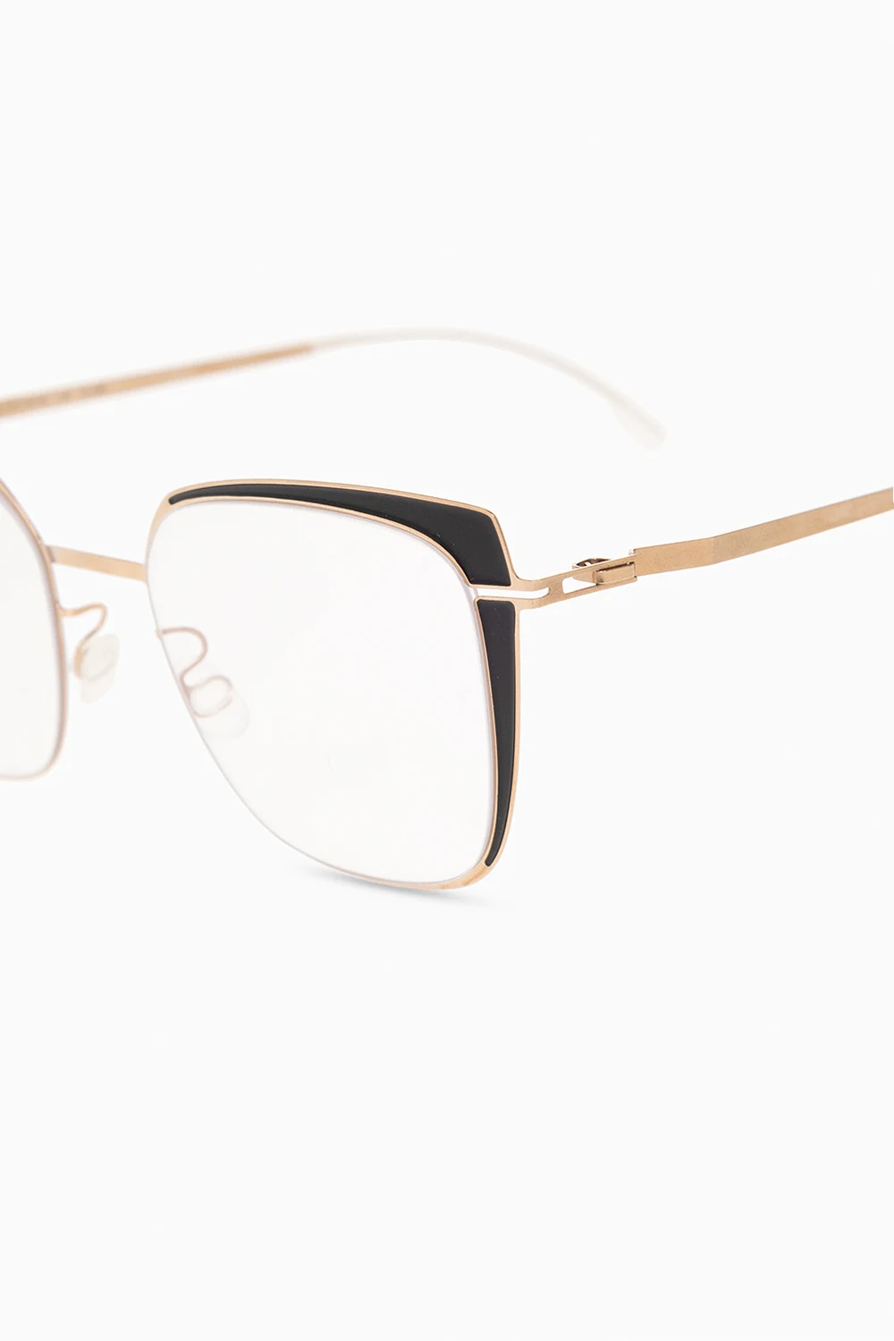 Okulary korekcyjne w kolorze czarno-złotym, model ‘Viola’ Mykita. Wykonane z lekkiej stali nierdzewnej. Zauszniki z opatentowanym zawiasem spiralnym. Półtransparentne, silikonowe końcówki zauszników i nosków. Ręcznie wykonane z Berlinie.