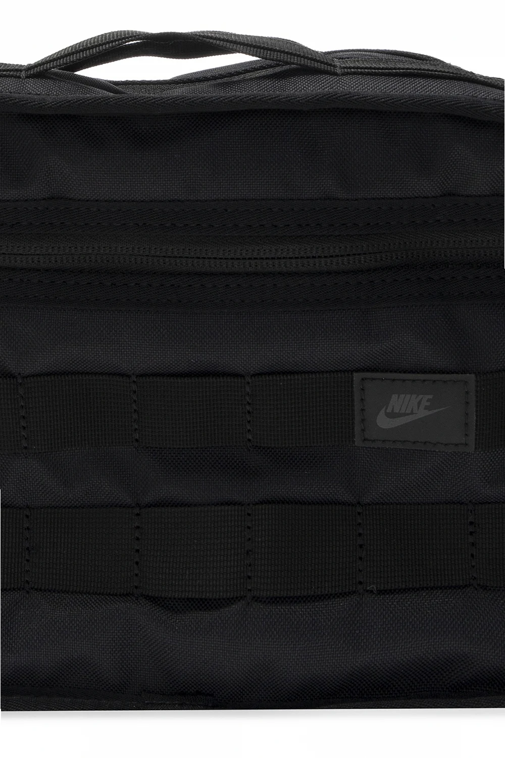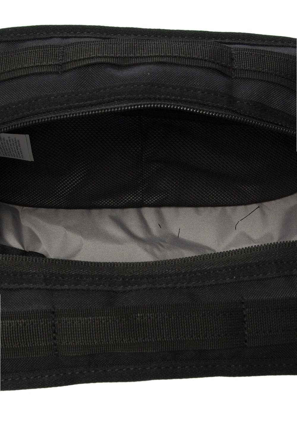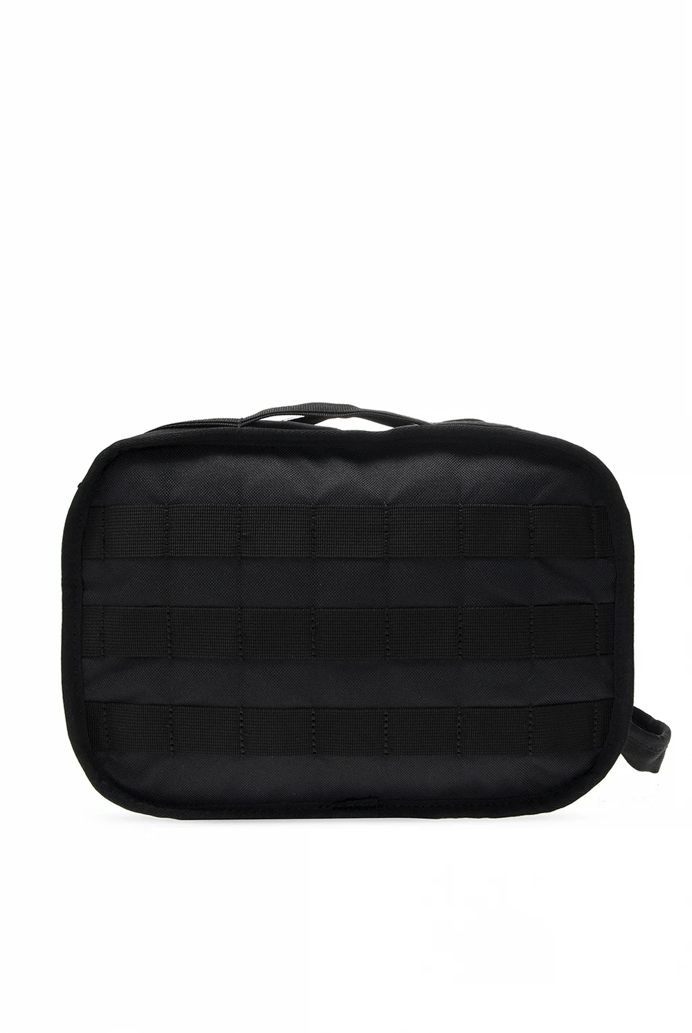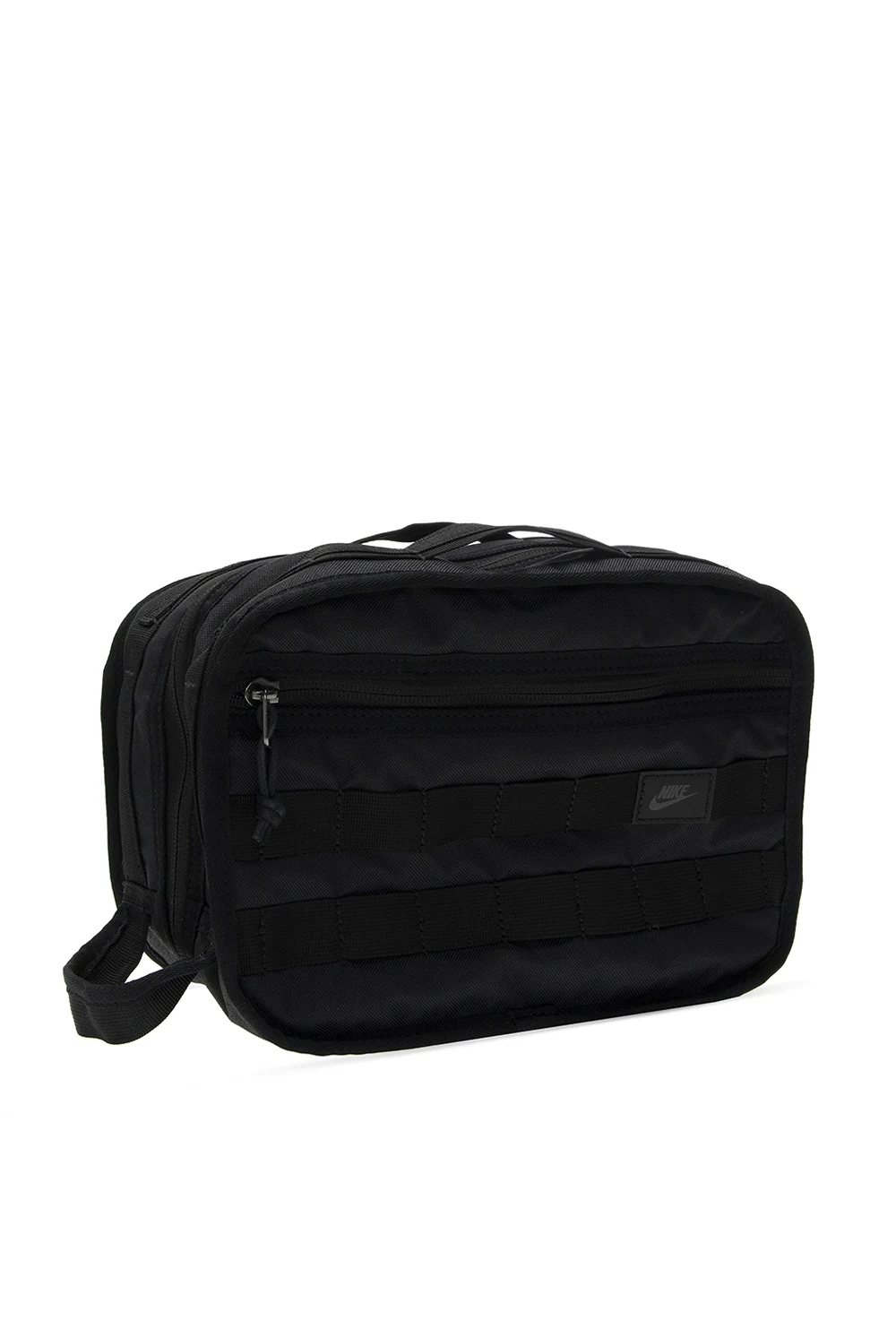 Czarna kosmetyczka Nike. Zapinana na zamek. Naszywka z nadrukowanym logo. Z przodu kieszeń zapinana na zamek. Półokrągły pasek na nadgarstek. Wewnątrz komora, dwie kieszenie zapinane na zamki oraz dwie wsuwane kieszenie wykonane z siatki.