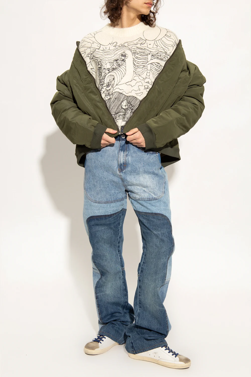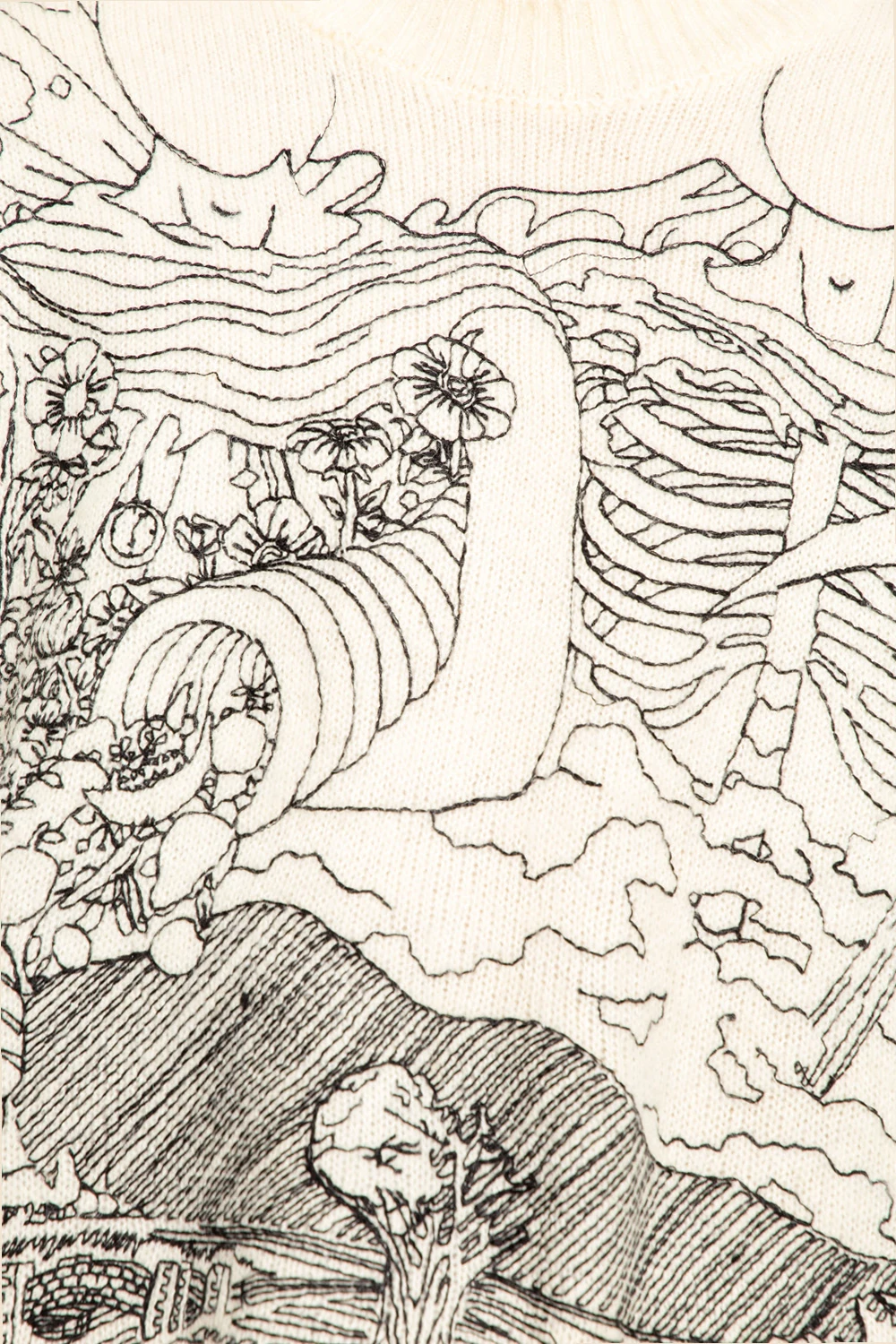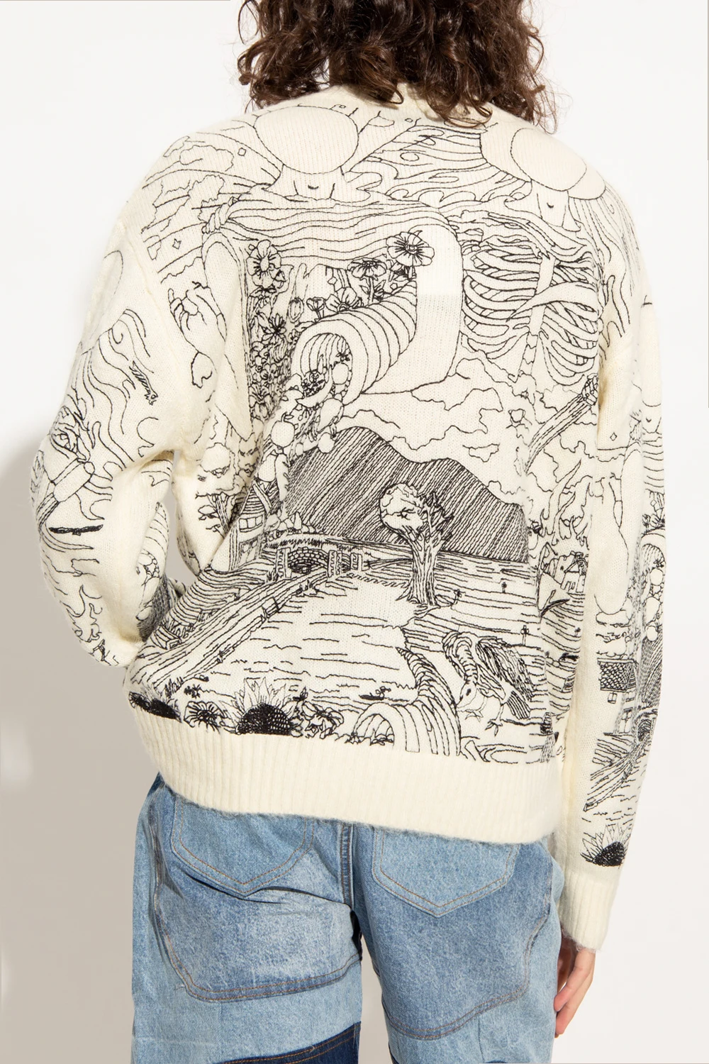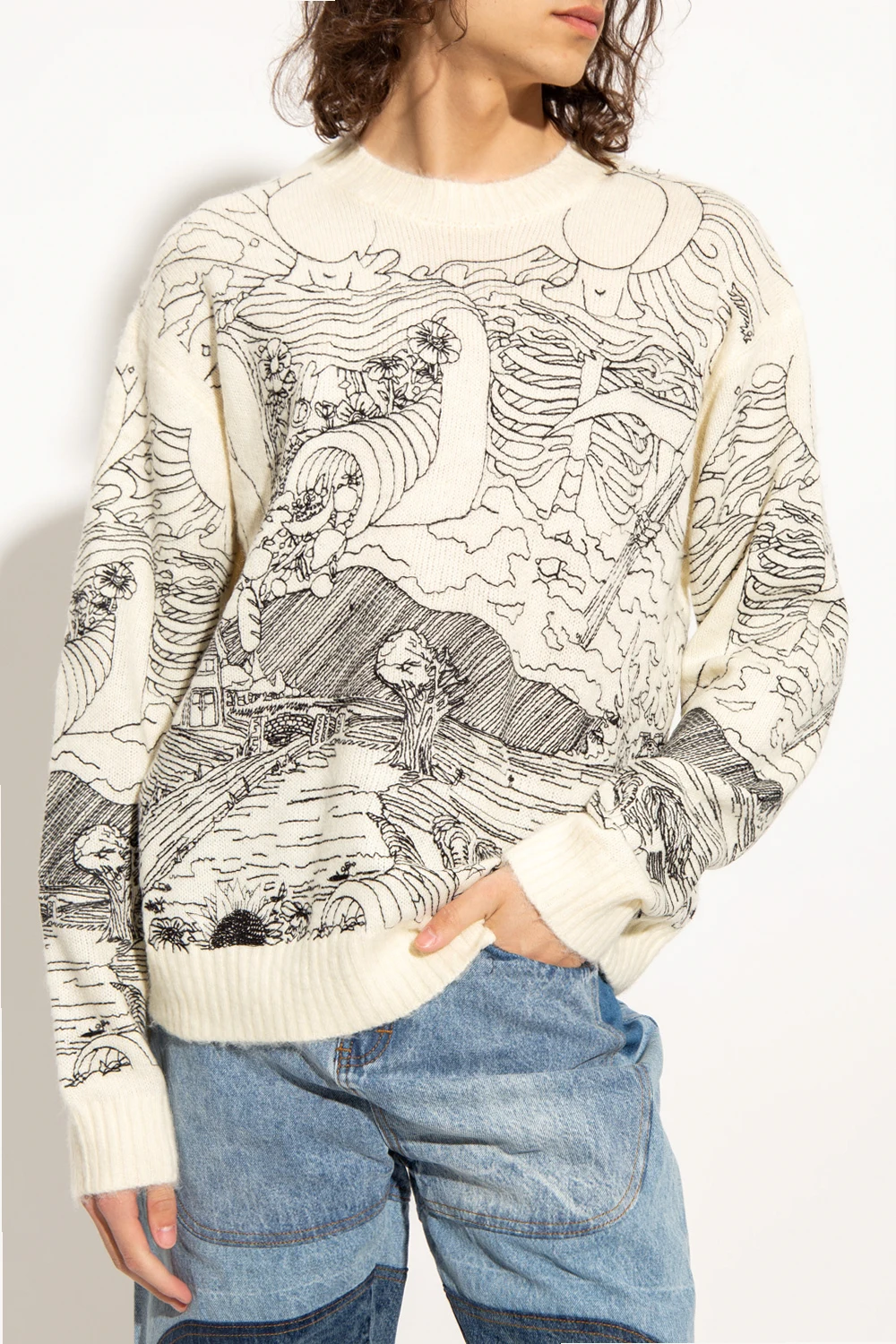Kremowy sweter, model ‘Duality’ Who Decides War. Ozdobiony wyszytym czarną nicią wzorem. Okrągły dekolt, długie rękawy oraz dół wykończone ściągaczem.