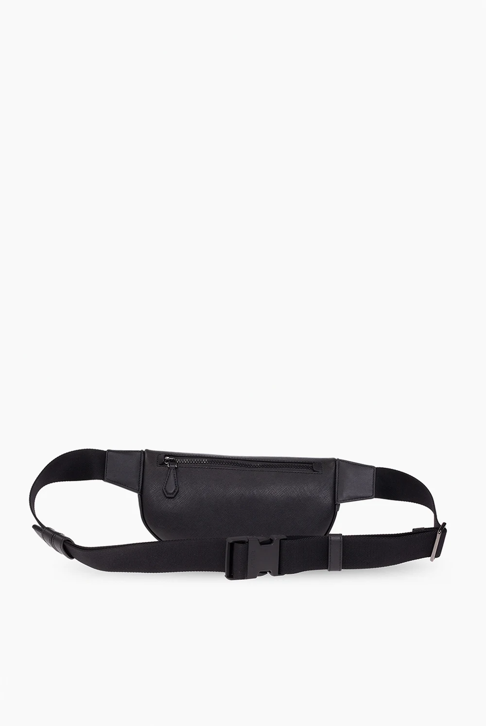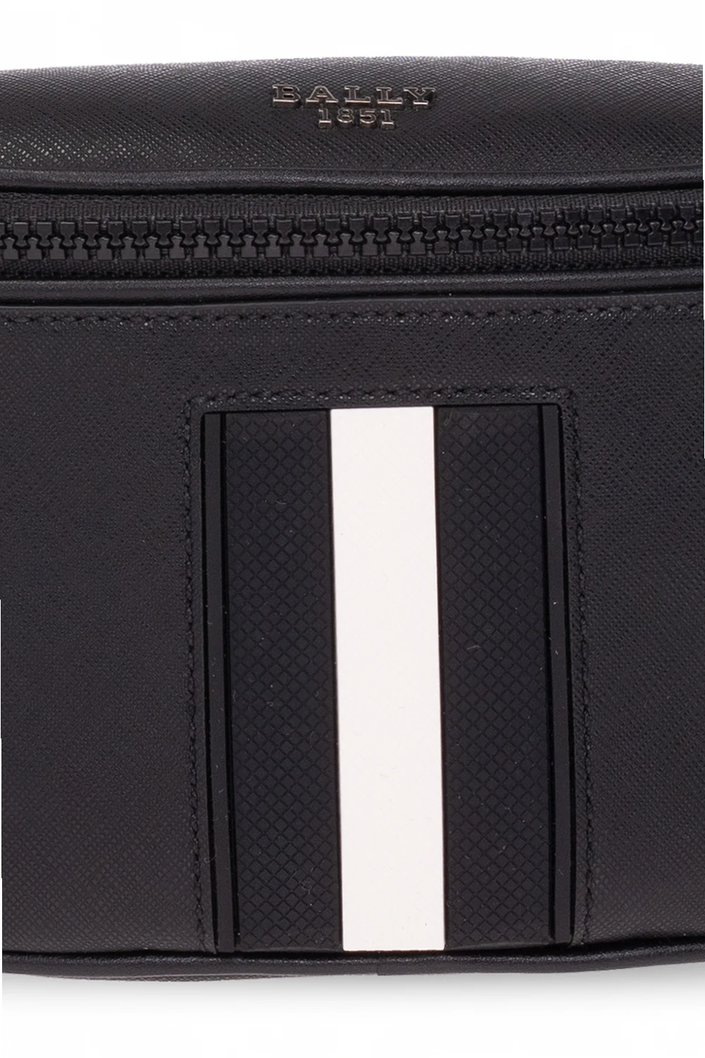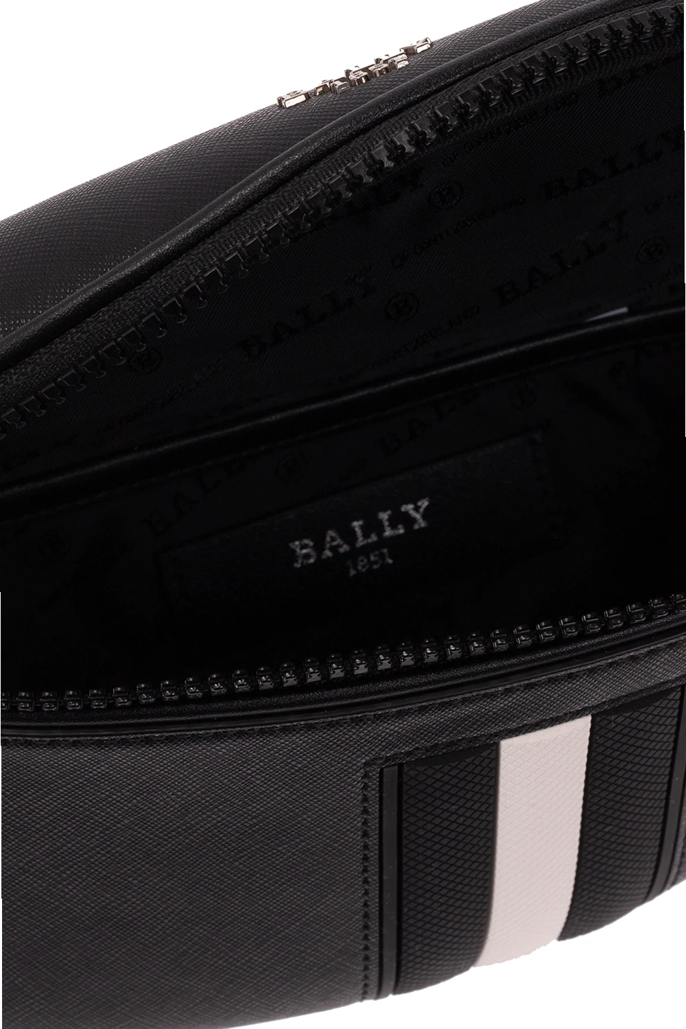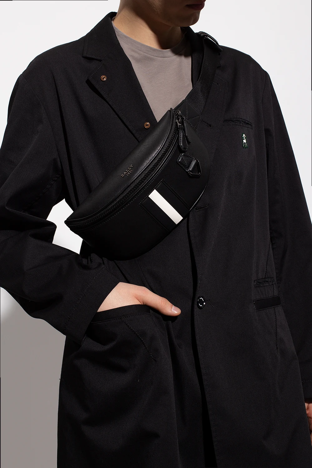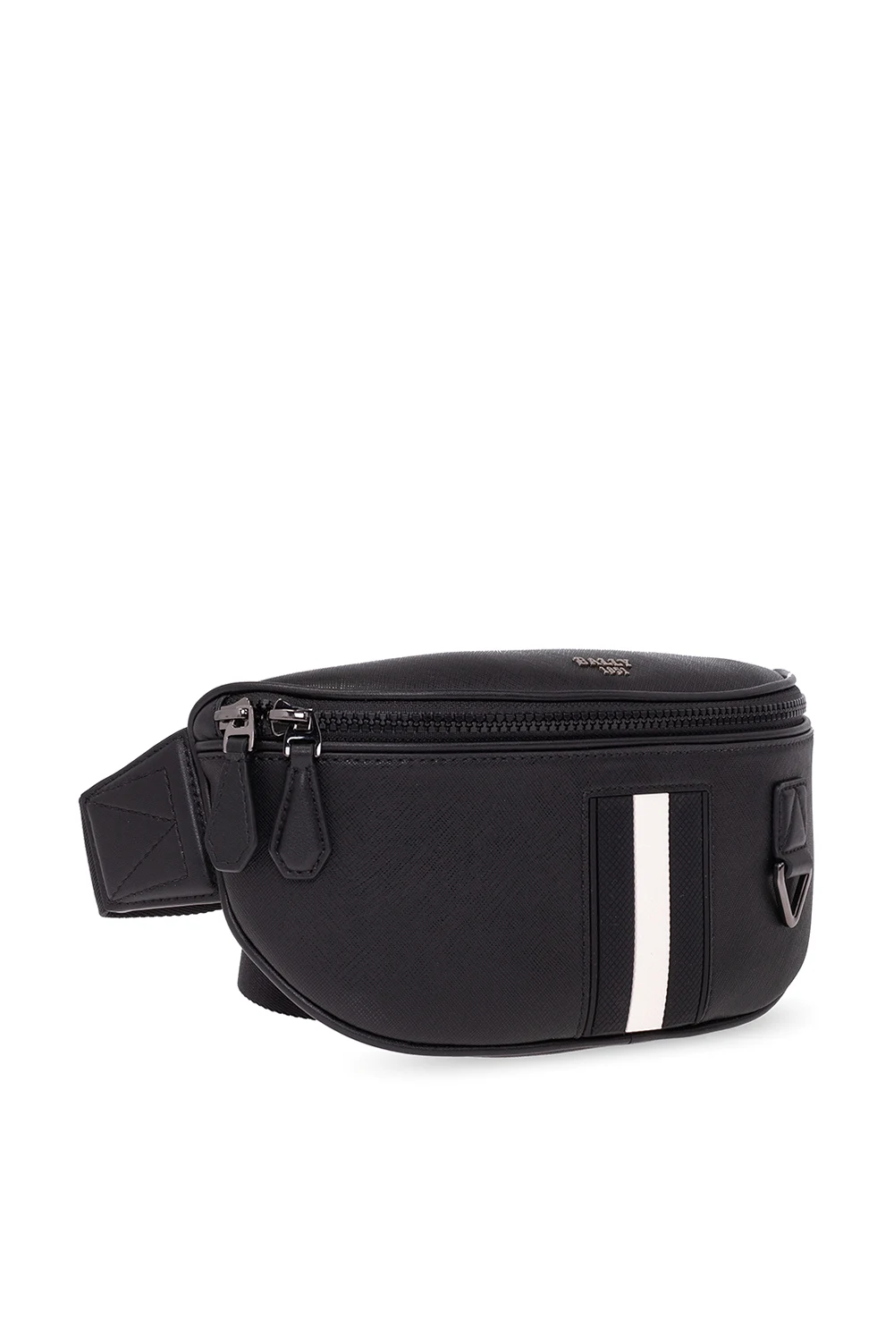 Czarna torba na pas, model ‘Matey’ Bally. Wykonana z bydlęcej skóry. Zamykana na dwubiegunowy zamek. Ozdobiona wszytym, gumowym pasem w kolorze czarno-biało-czarnym oraz metalowym logo. Z tyłu kieszeń zamykana na zamek. Pas na pas z możliwością regulacji długości. Wewnątrz komora i wsuwana kieszeń. Metalowe elementy w kolorze srebrnym.