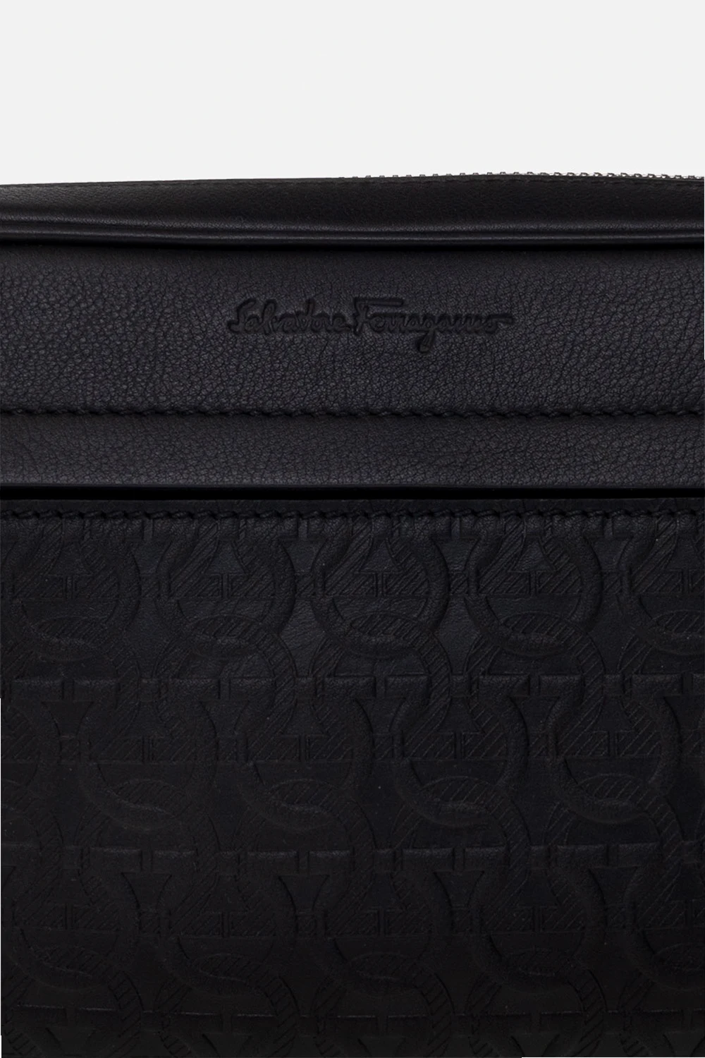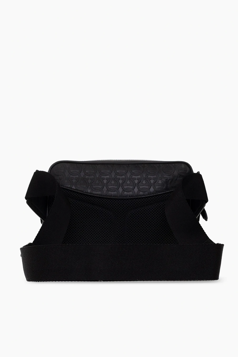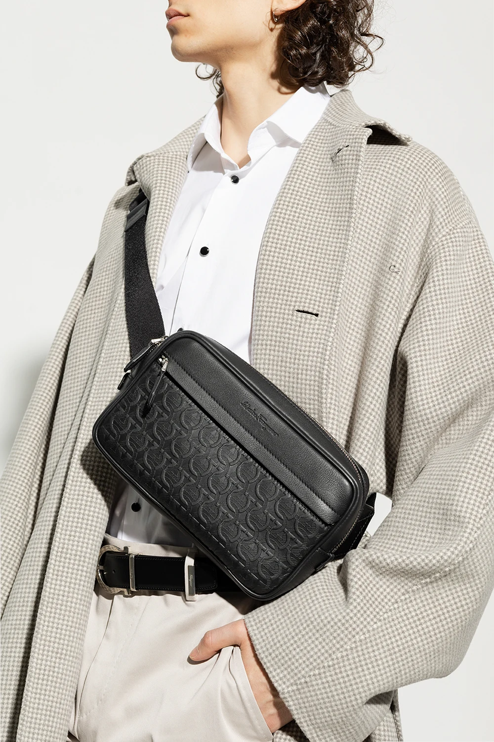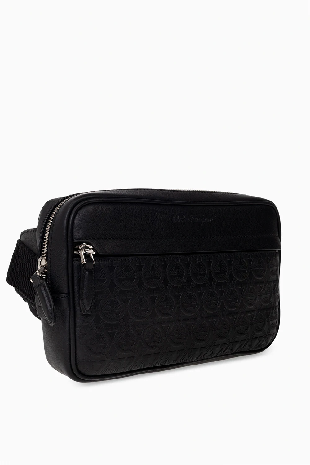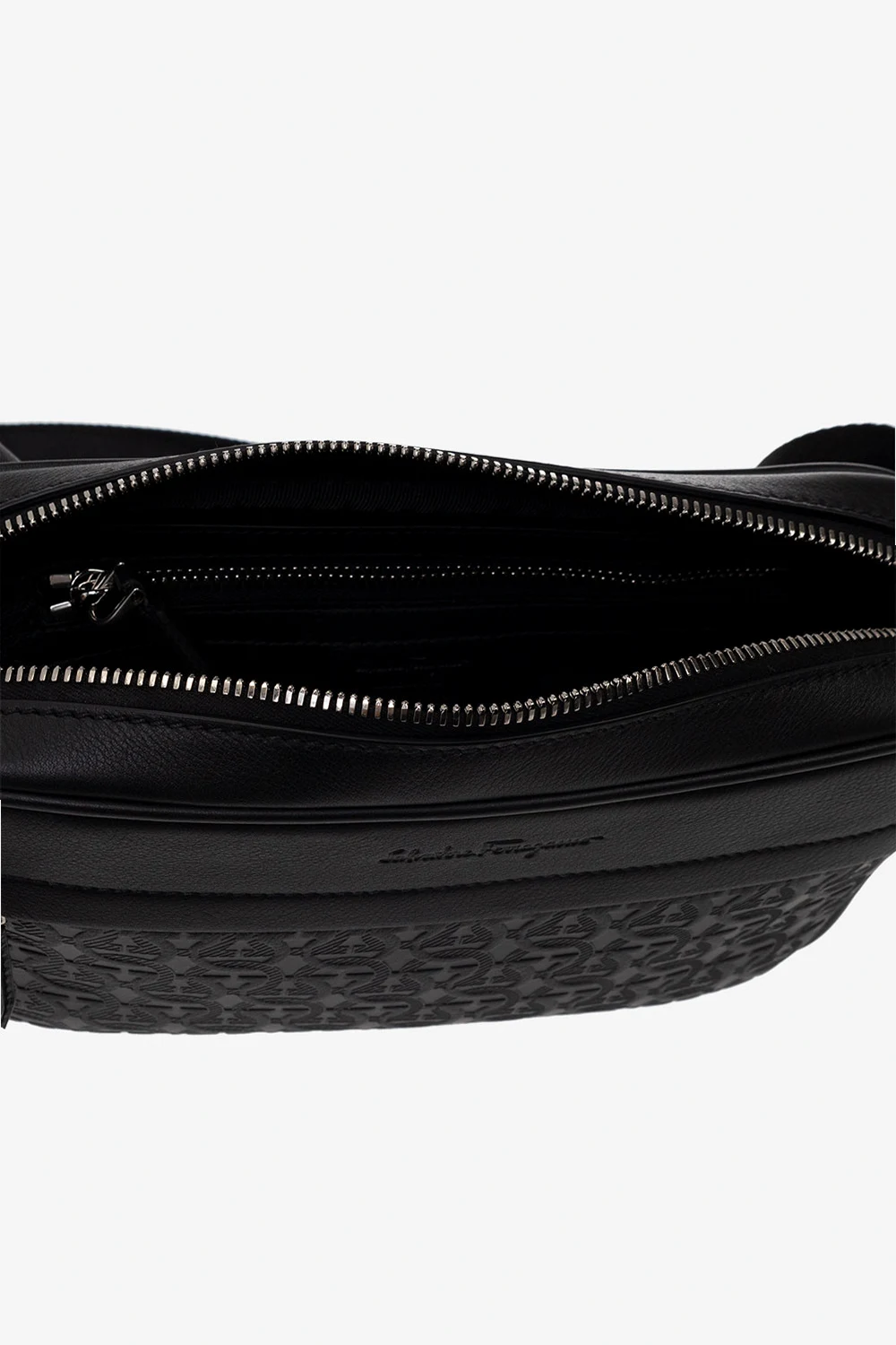 Czarna torba na pas FERRAGAMO. Wykonana ze skóry cielęcej. Zamykana na zamek. Ozdobiona wytłoczonym wzorem z motywem ‘Gancini’ oraz logo. Z przodu kieszeń z zamknięciem na zamek. Regulowany pas. Wewnątrz komora z kieszenią zamykaną na zamek. Metalowe wykończenie w kolorze srebrnym.