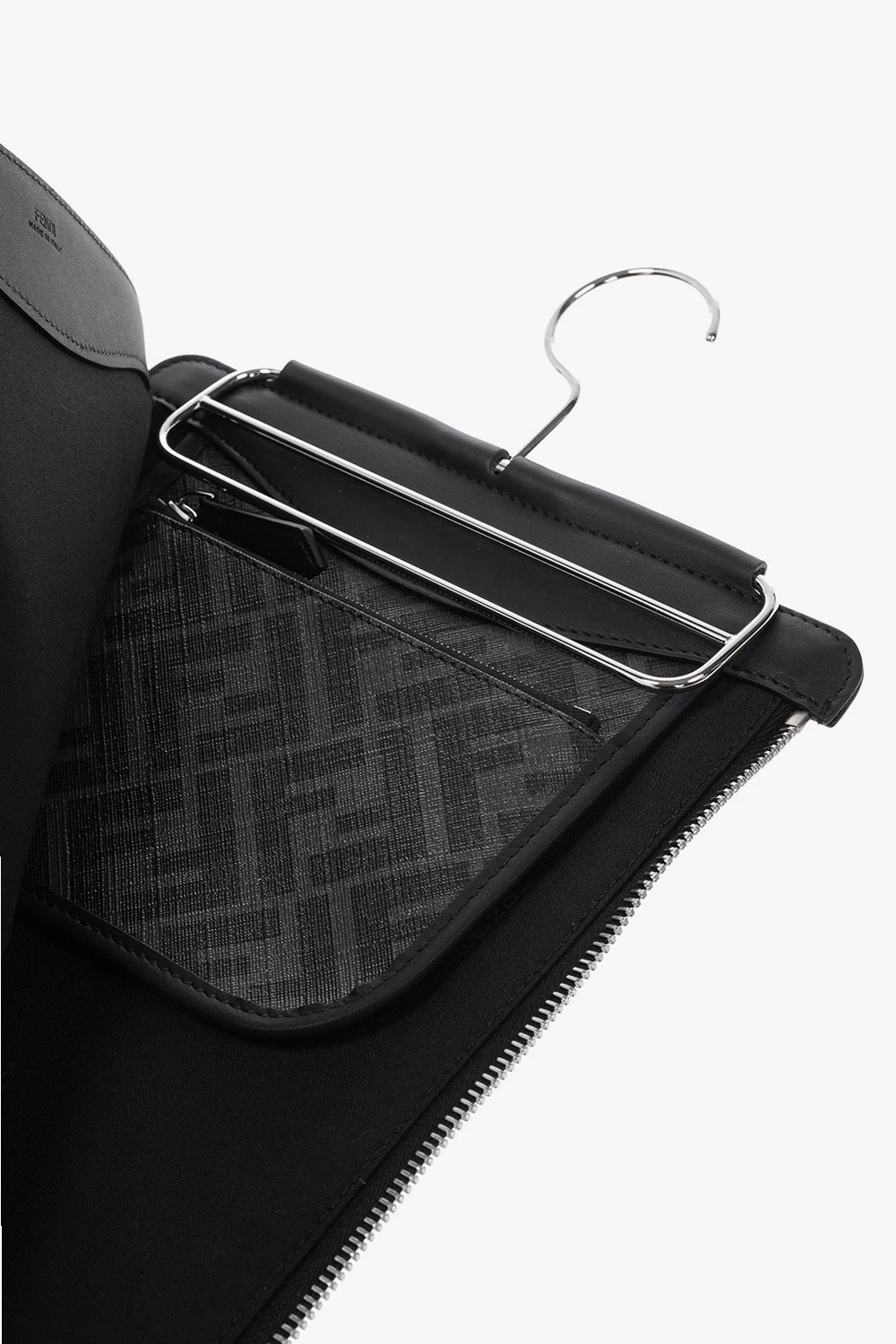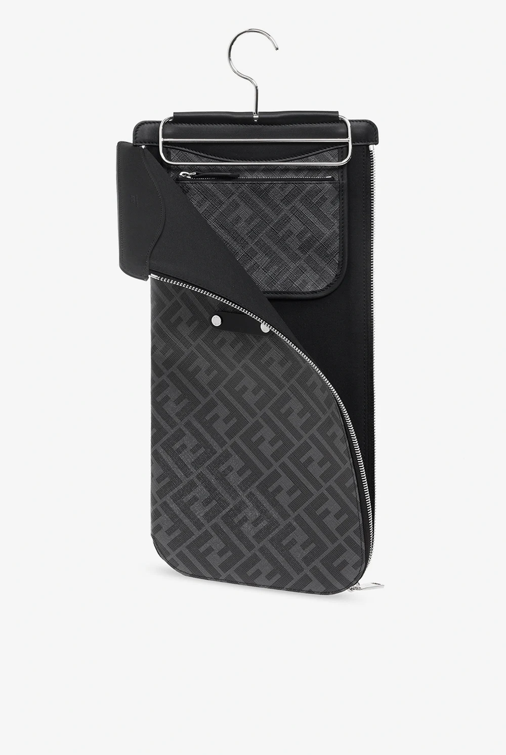 Szaro-czarne etui na krawaty Fendi. Wykonane z materiałów imitujących skórę. Zamykane na zamek. Ozdobione monogramem ‘FF’. Wykończone wieszakiem. Wewnątrz komora oraz kieszeń zamykana na zamek. Metalowe wykończenie w kolorze srebrnym.