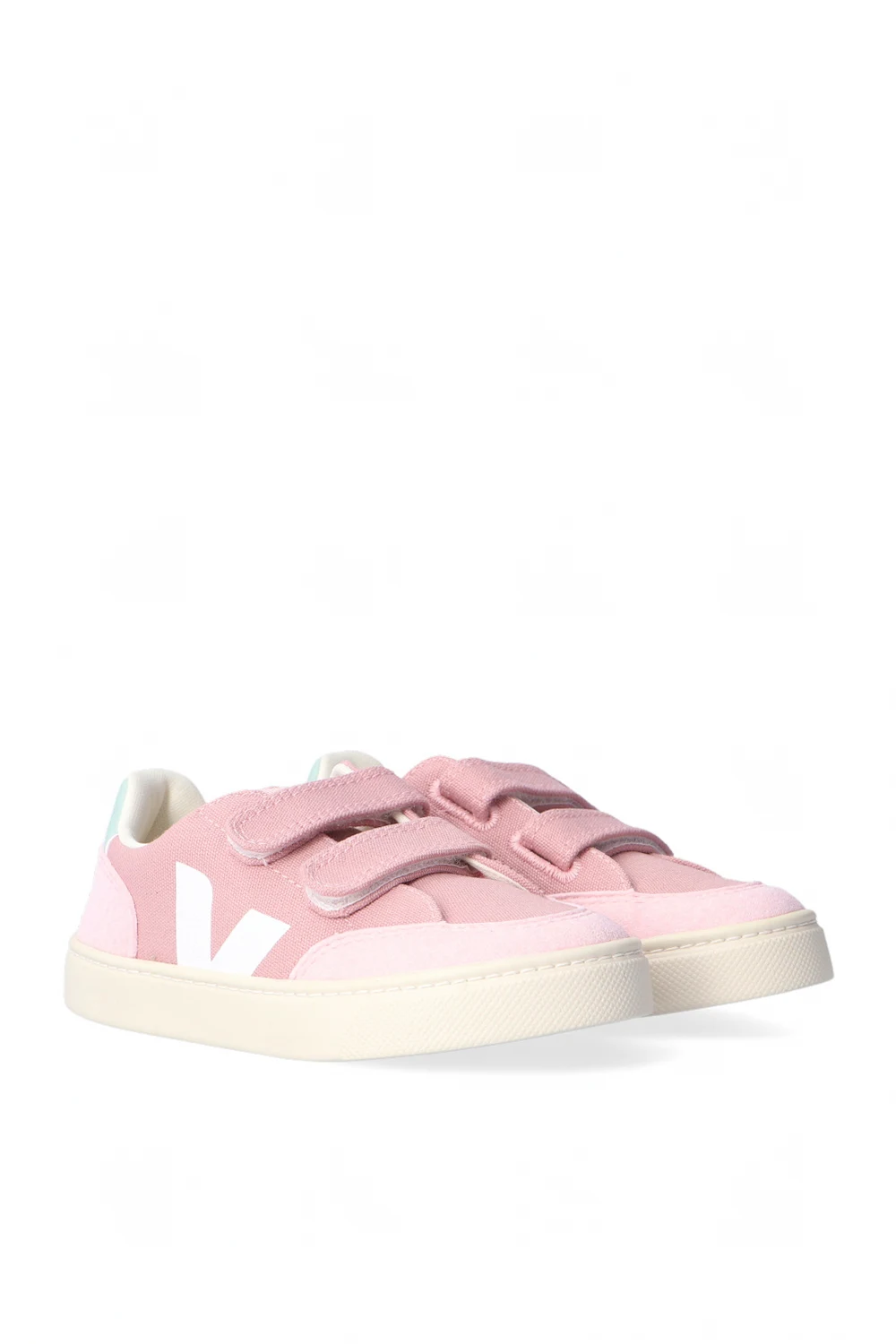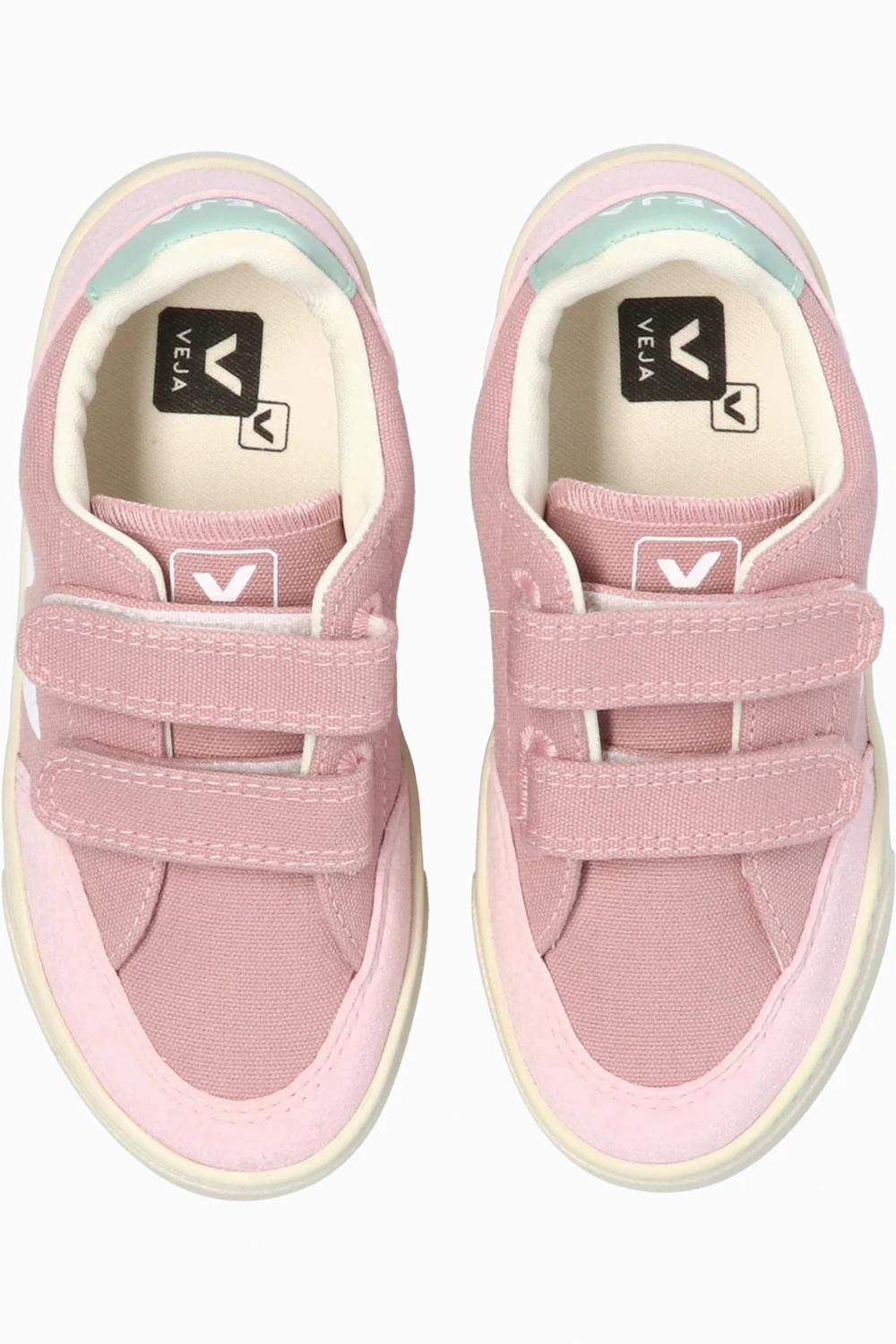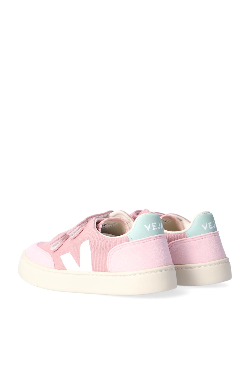 Różowe, sznurowane buty sportowe, model ‘V-12’ Veja Kids. Wykonane z organicznej bawełny. Nadrukowane logo w kolorze białym. Warstwa wewnętrzna o specjalnej, siateczkowej strukturze wykonana z materiału pochodzącego z recyklingu – cechuję się wyjątkową odpornością na tarcie. Wkładka wykonana z trzciny cukrowej, gumy Amazon, bawełny organicznej i pochodzącej z recyklingu pianki EVA.