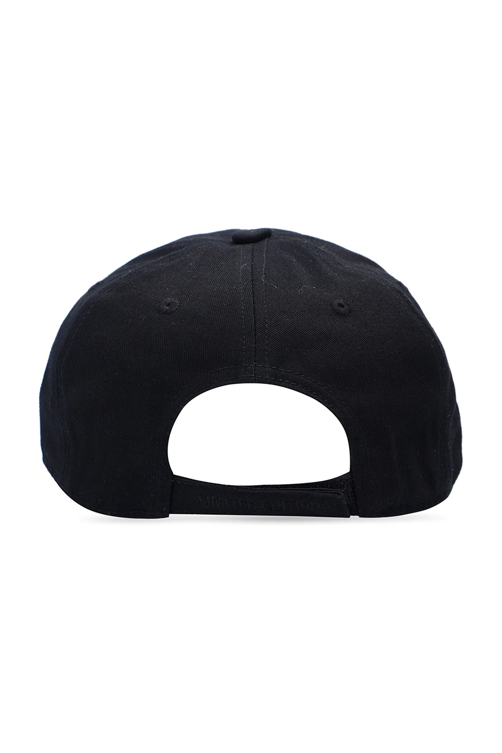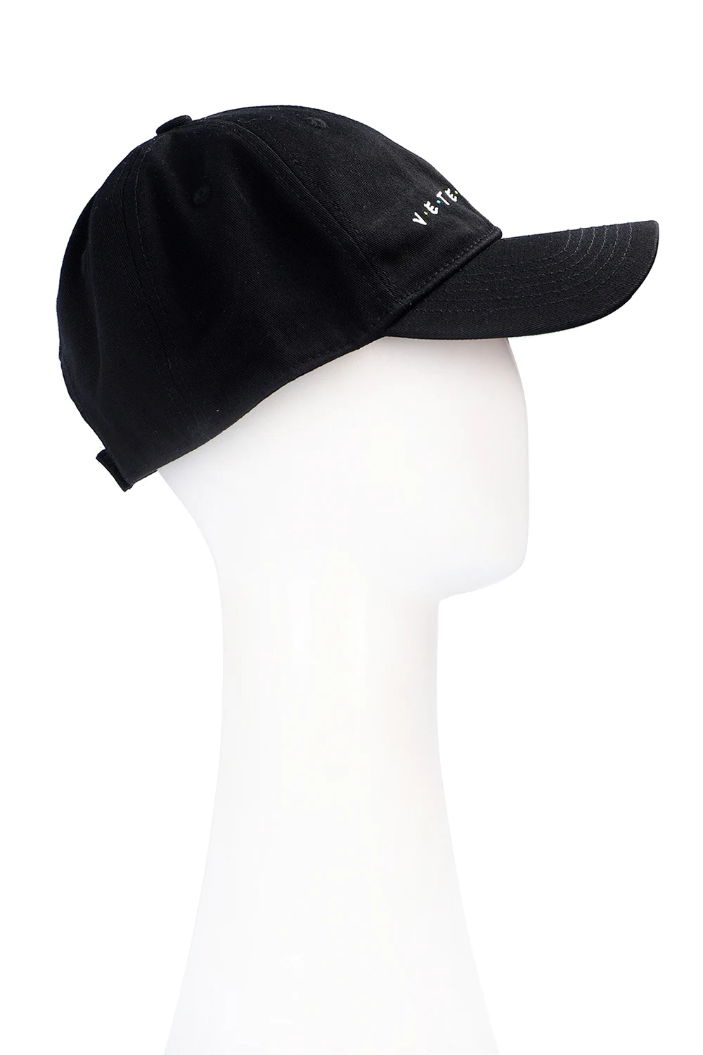 Czarna czapka z daszkiem VETEMENTS. Ozdobiona wyszytym wzorem z logo. Z tyłu zapięcie na rzep.