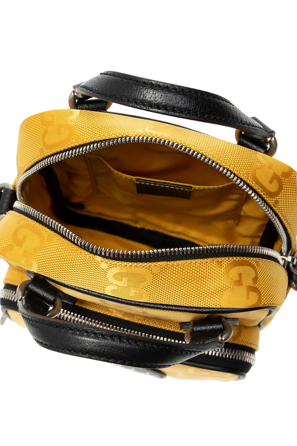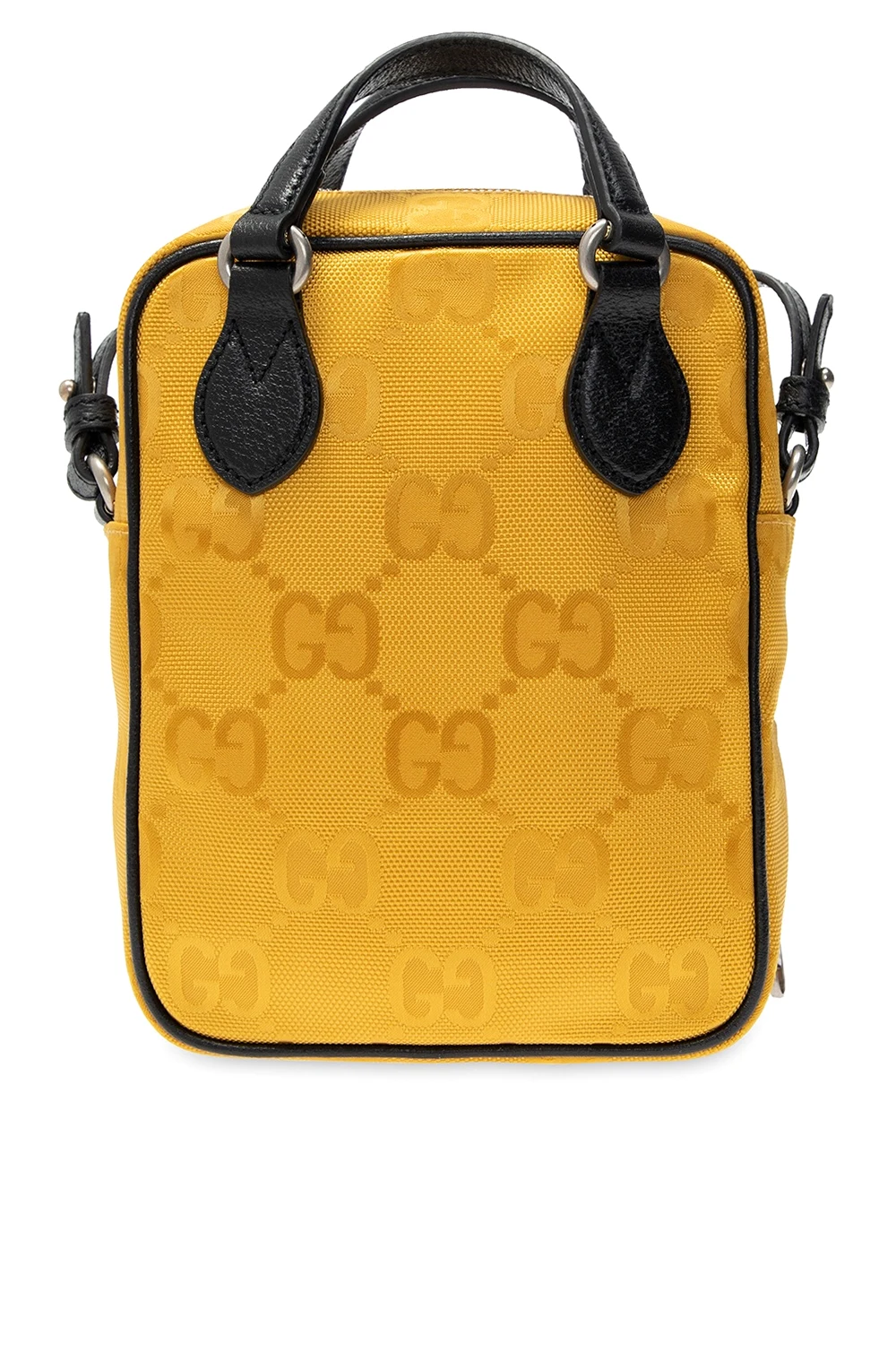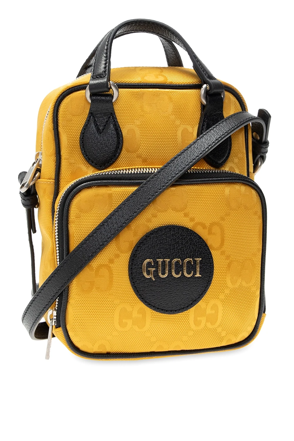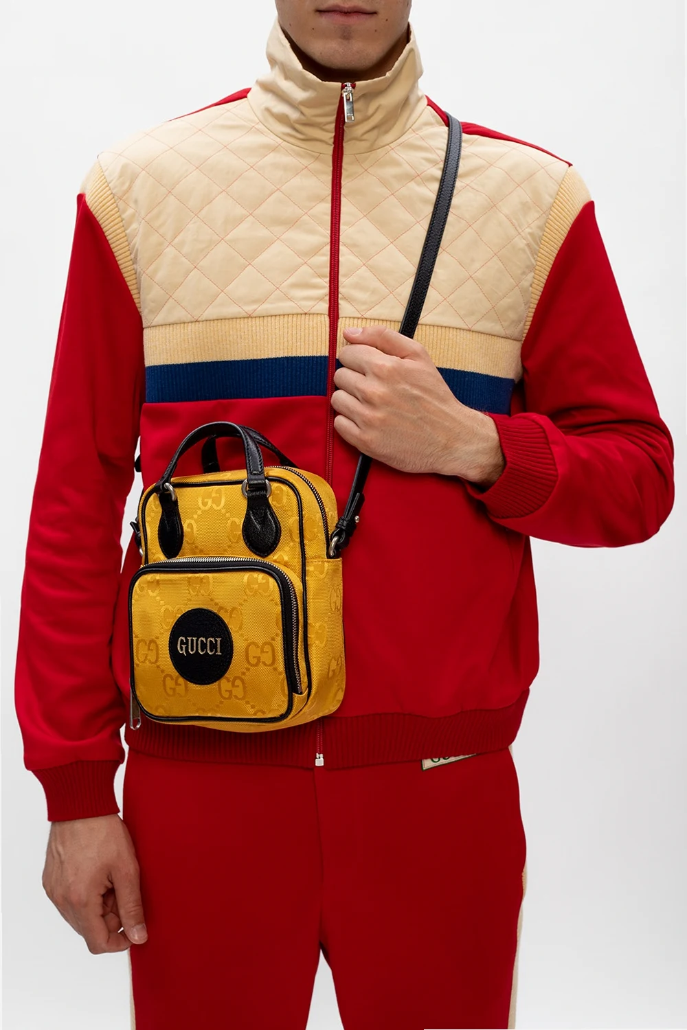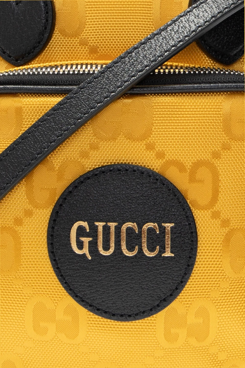 Żółto-czarny plecak, model 'Off The Grid' Gucci. Zamykany na zamek. Ozdobiony wyszytym wzorem z logo. Z przodu kieszeń zamykana na zamek. Dwie półokrągłe rączki. Pasek na ramię z możliwością regulacji długości. Wewnątrz komora oraz wsuwana kieszeń.