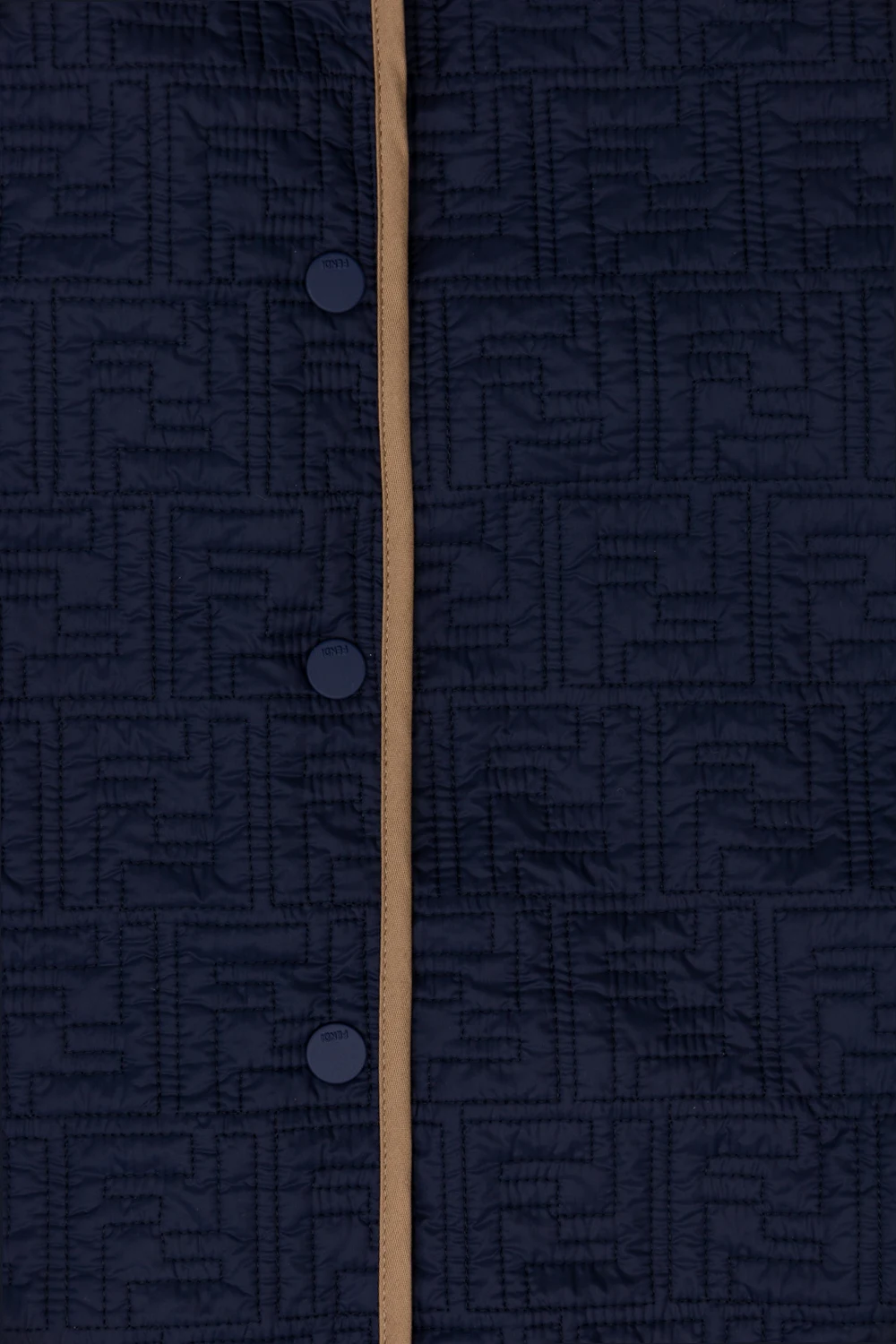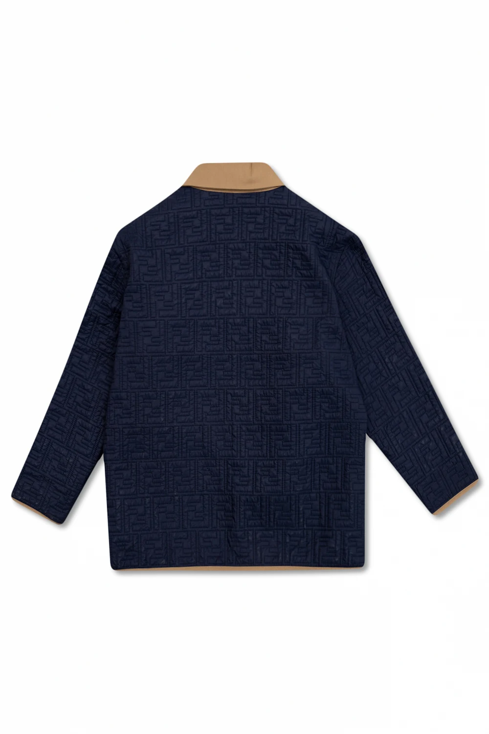 Granatowo-beżowa kurtka Fendi Kids. Zapinana na zatrzaski. Ozdobiona wyszytym wzorem z logo. Trzy kieszenie wsuwane. Długie rękawy.