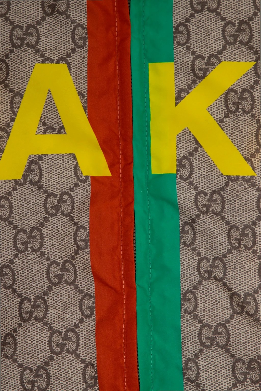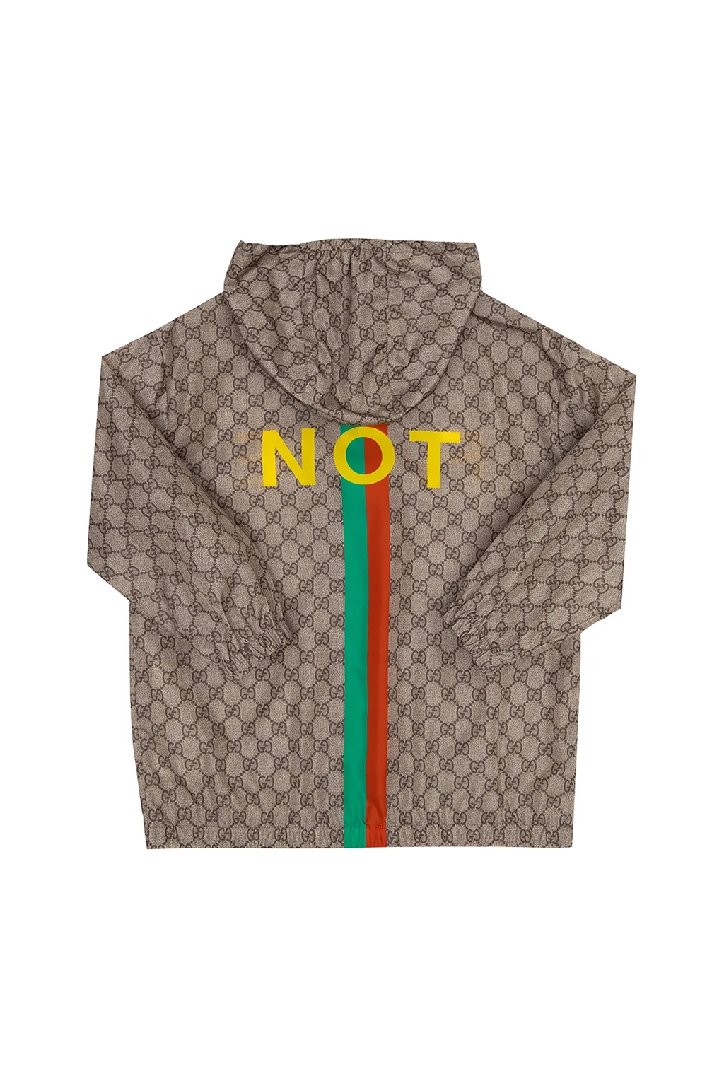Beżowo-brązowa kurtka z kapturem Gucci Kids. Zapinana na zamek. Ozdobiona charakterystycznym dla marki wzorem ‘GG’ oraz nadrukowanym wzorem w kolorze żółto-zielono-czerwonym. Dwie wsuwane kieszenie. Dół i długie rękawy zakończone ściągaczem.