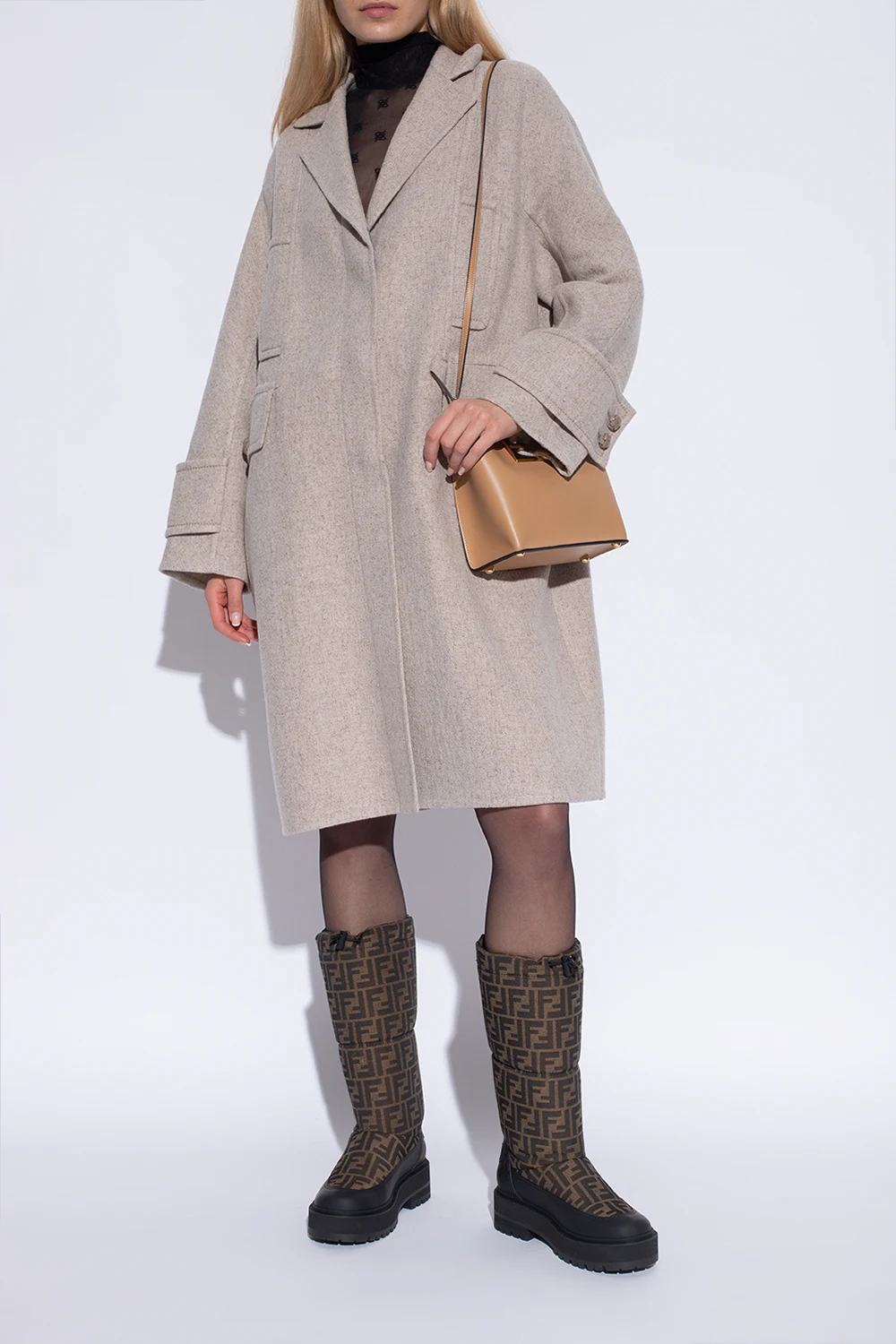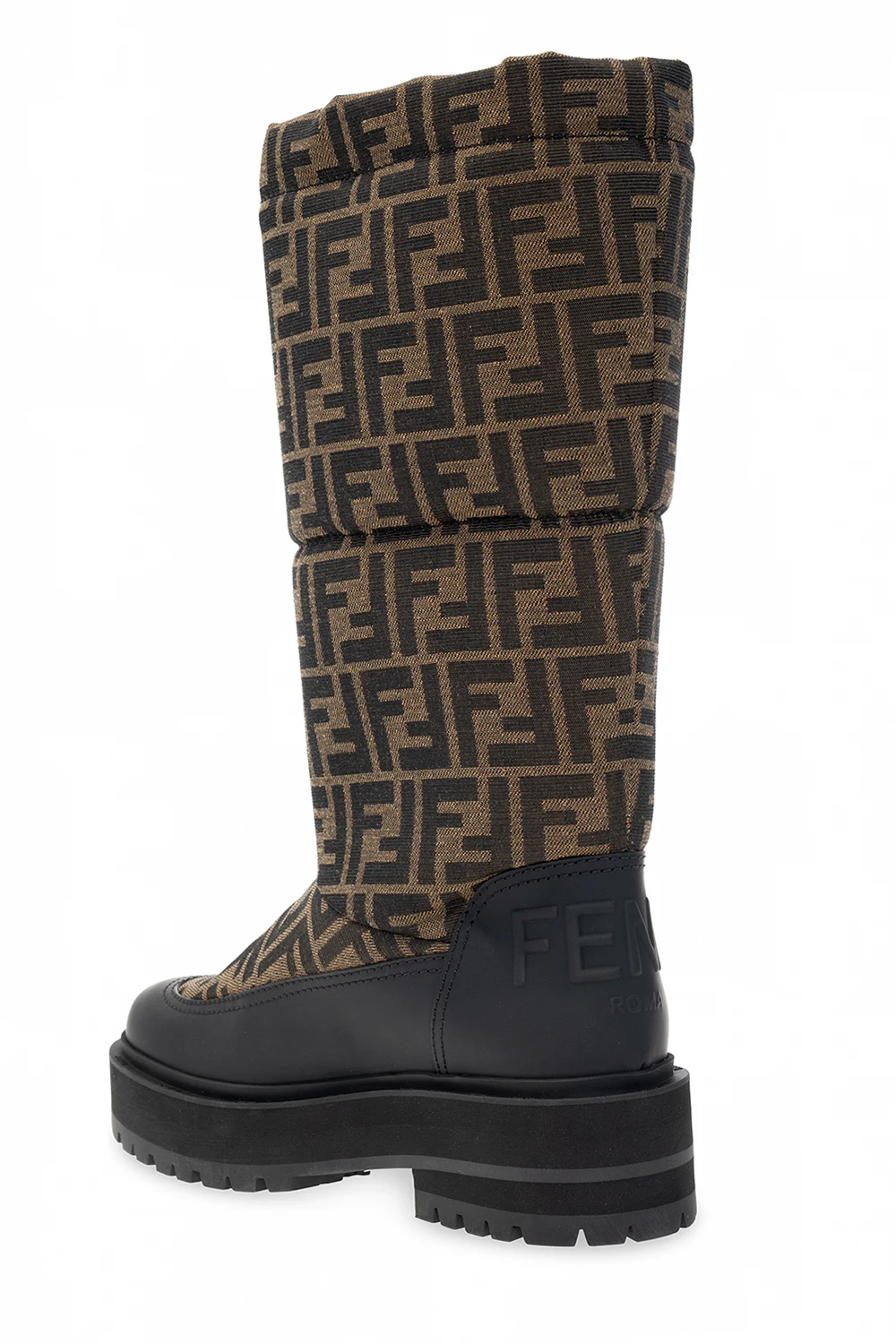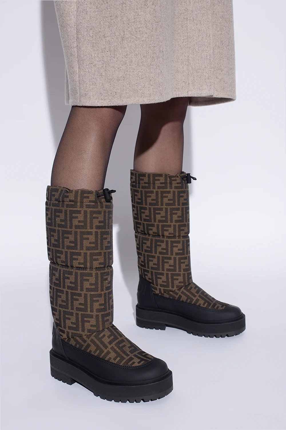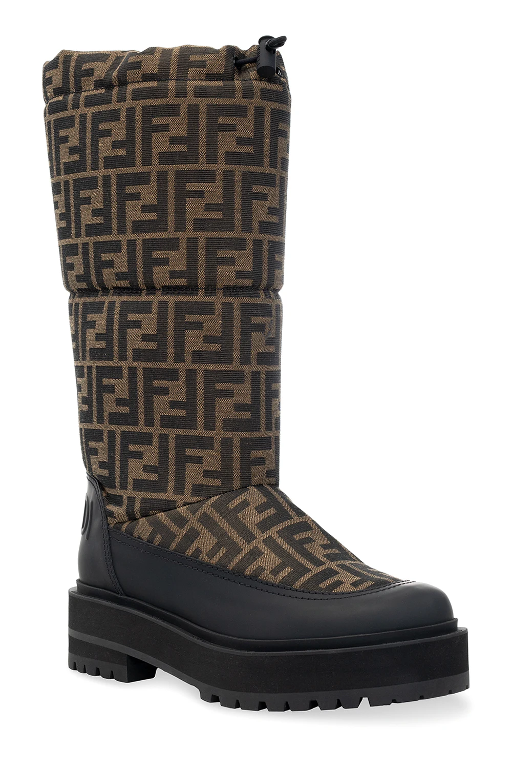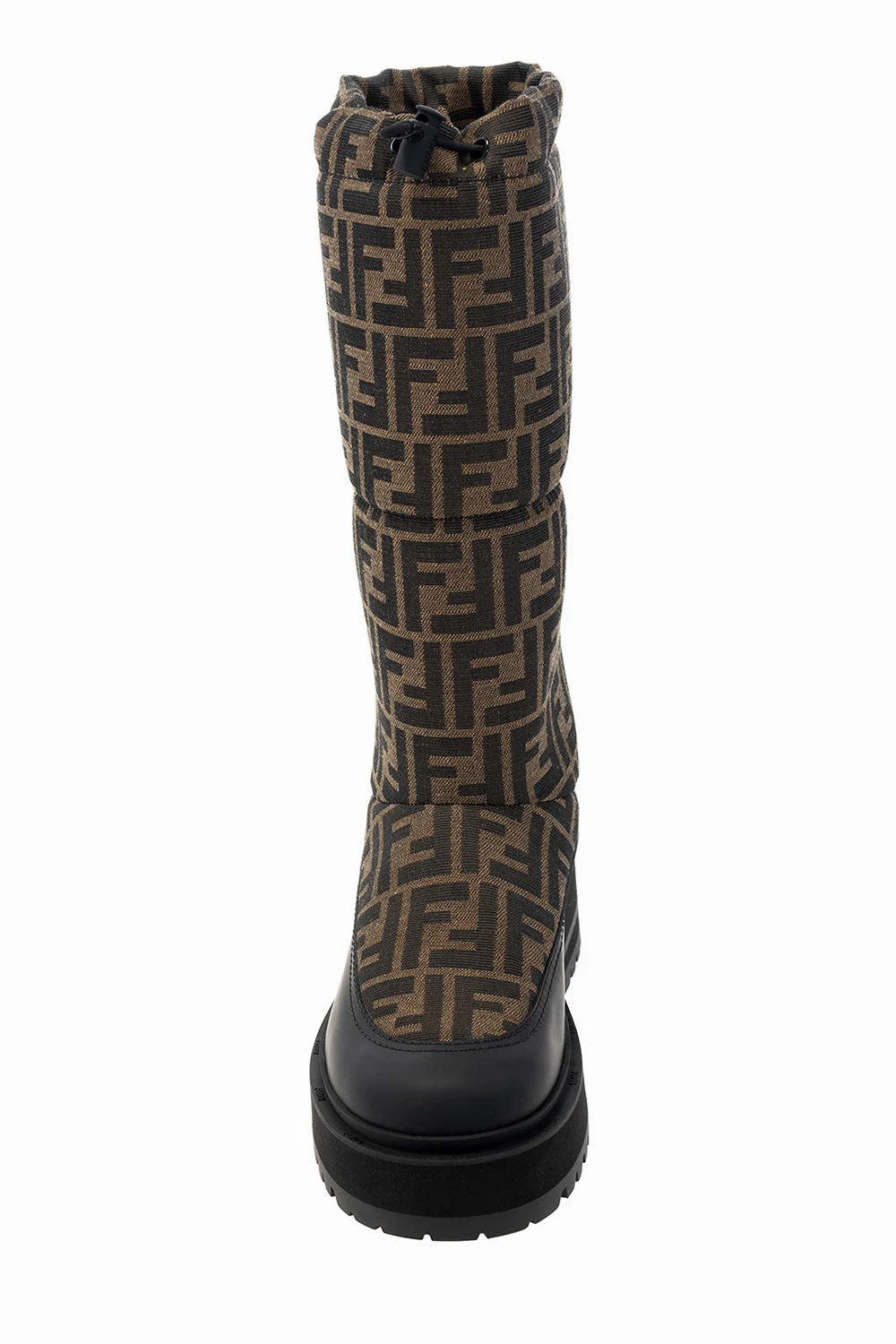 Brązowo-czarne śniegowce Fendi. Ozdobione wyszytym logo w kolorze ciemnobrązowym. Z tyłu wypukłe logo. U góry ściągane trokami. Wykończone gumą. Czarna, gumowa podeszwa.