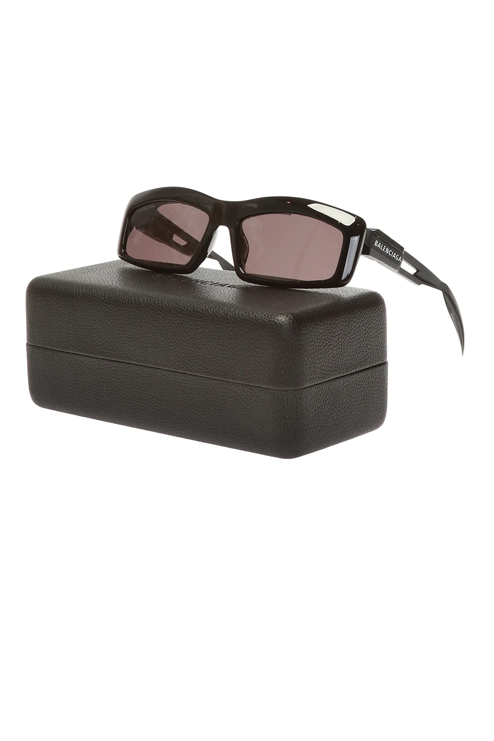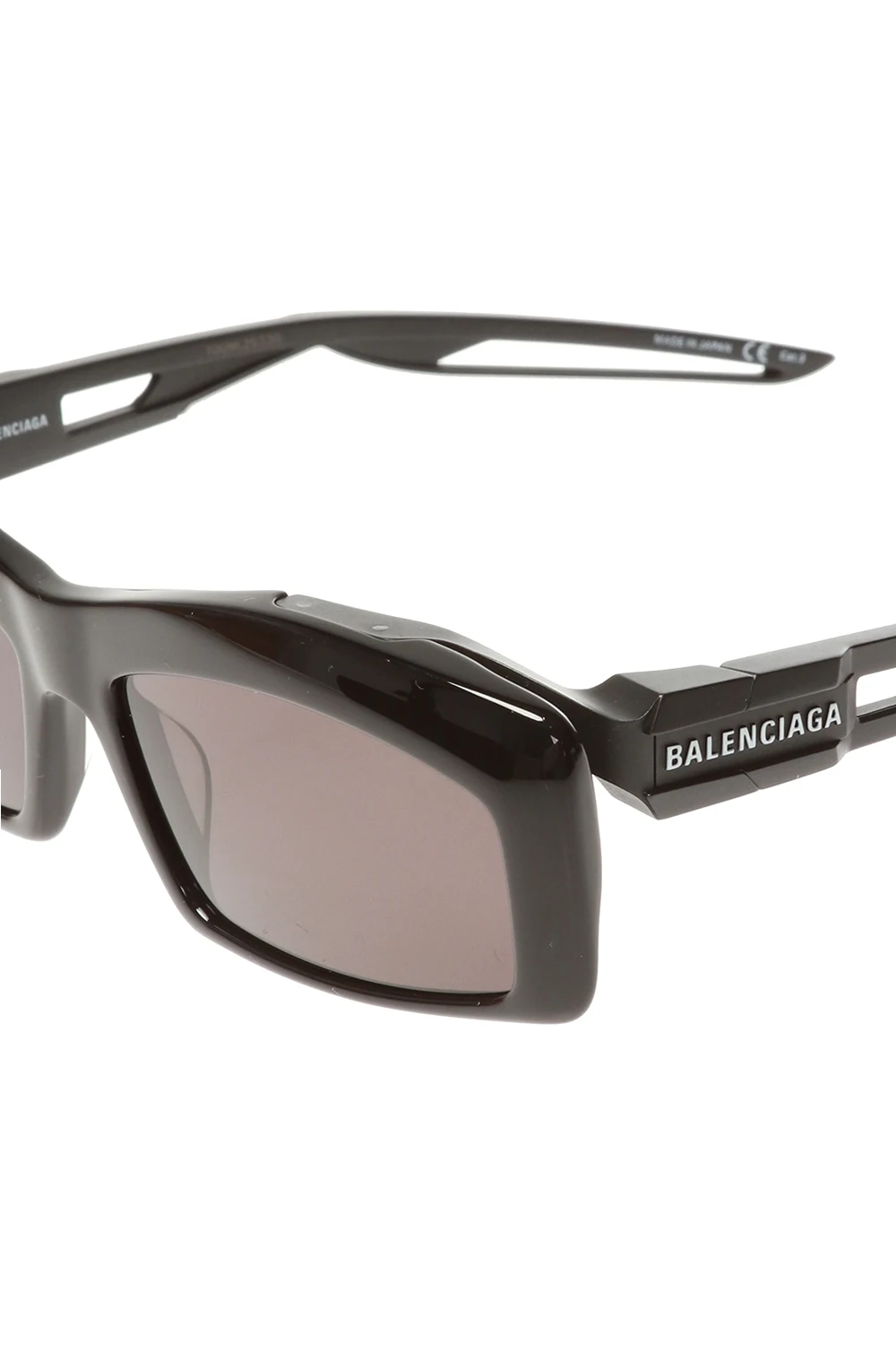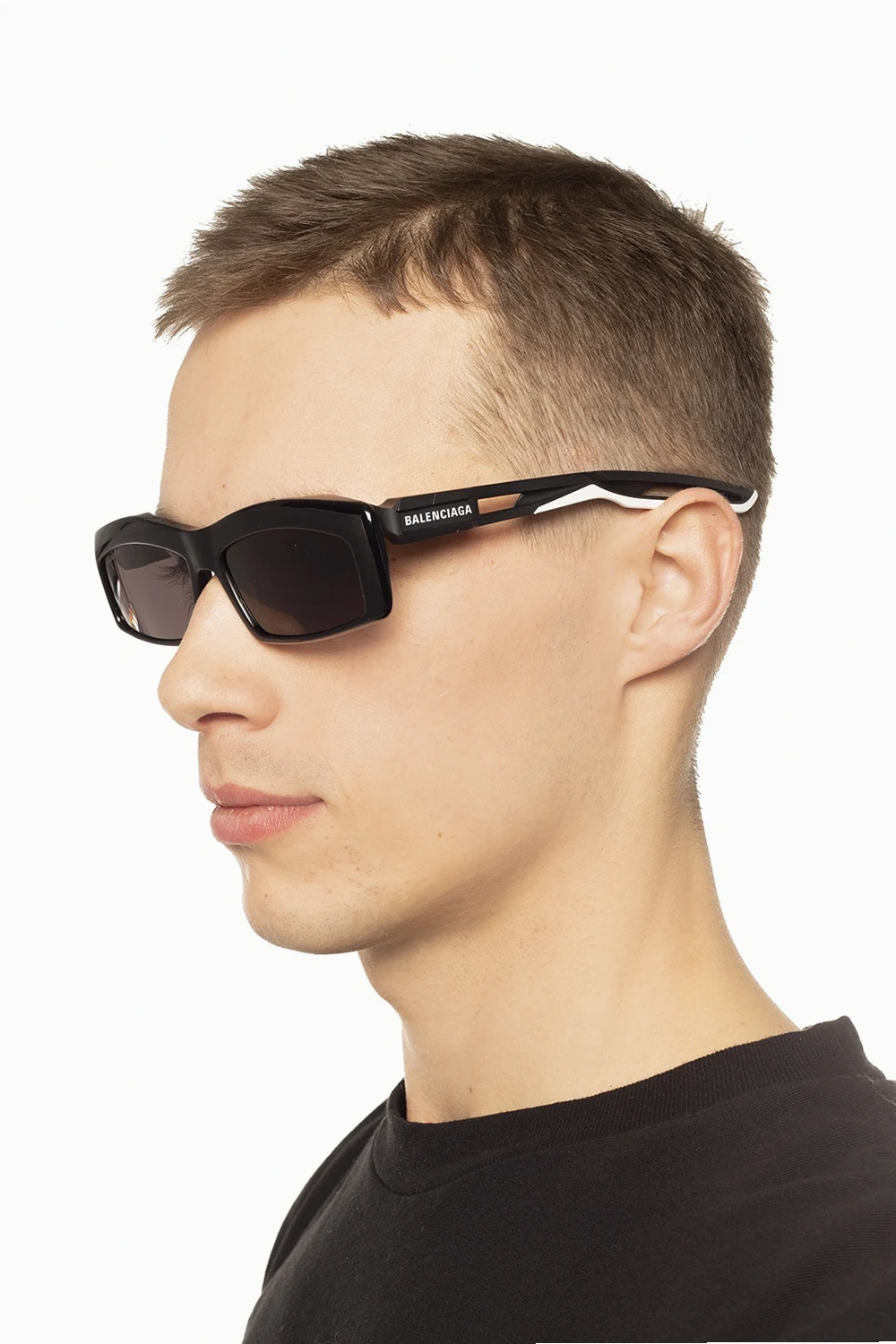 Czarno-białe okulary przeciwsłoneczne Balenciaga. Ozdobione białym nadrukiem z logo. Certyfikowane soczewki w kolorze czarnym UVA/UVB. Dołączone czarne etui z wytłoczonym logo.