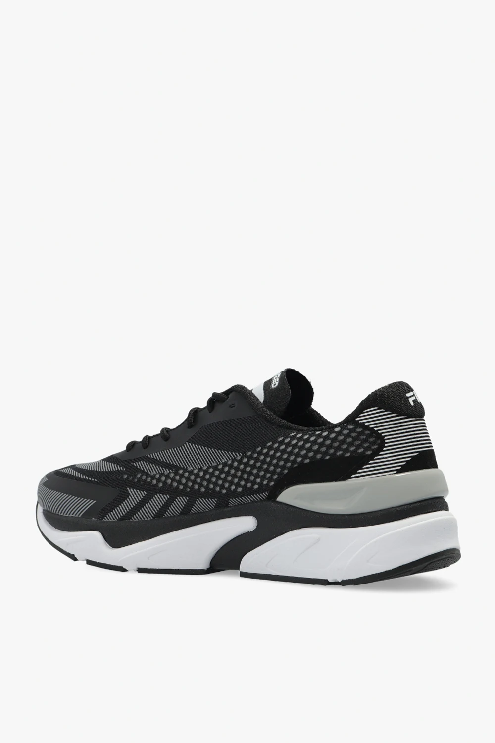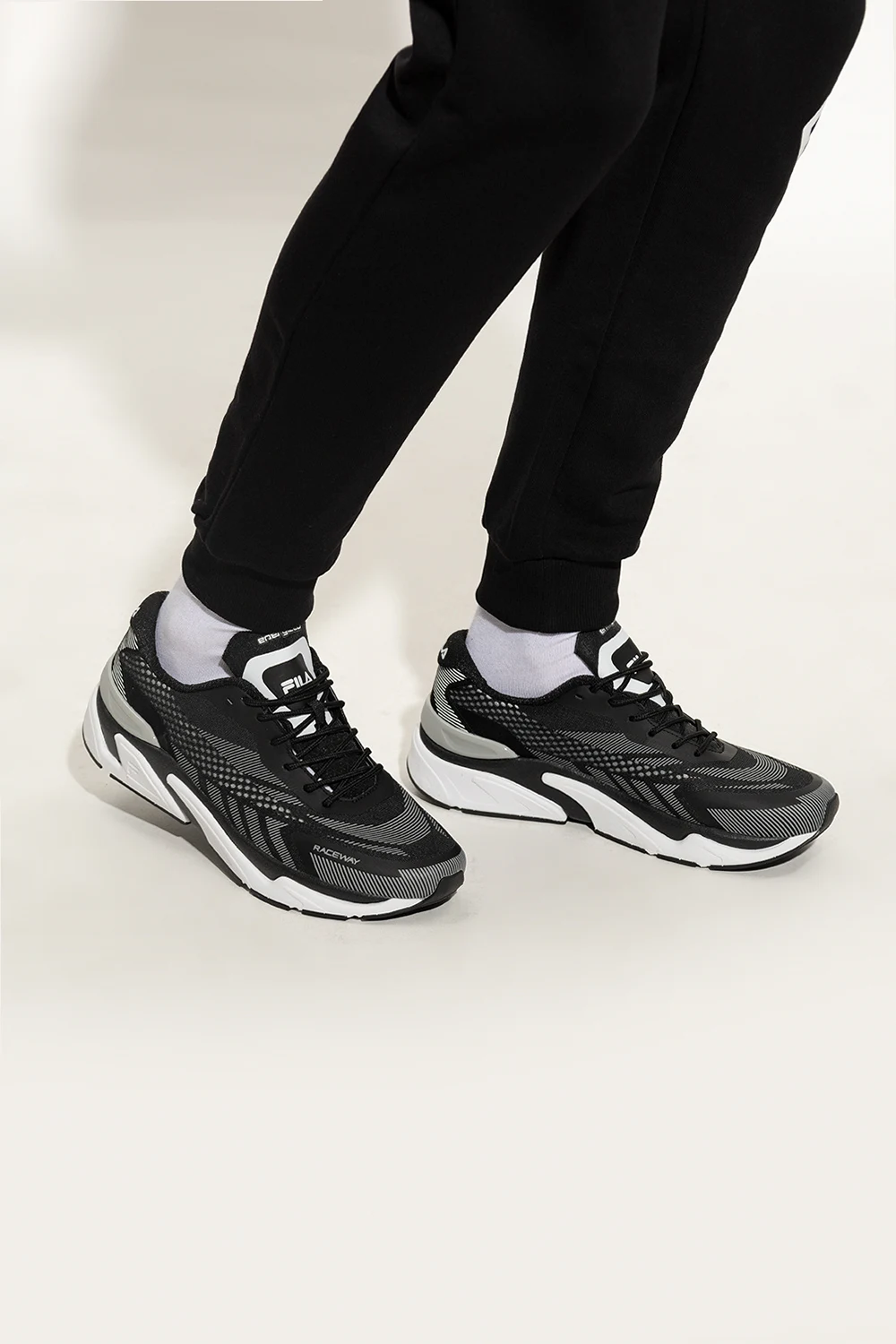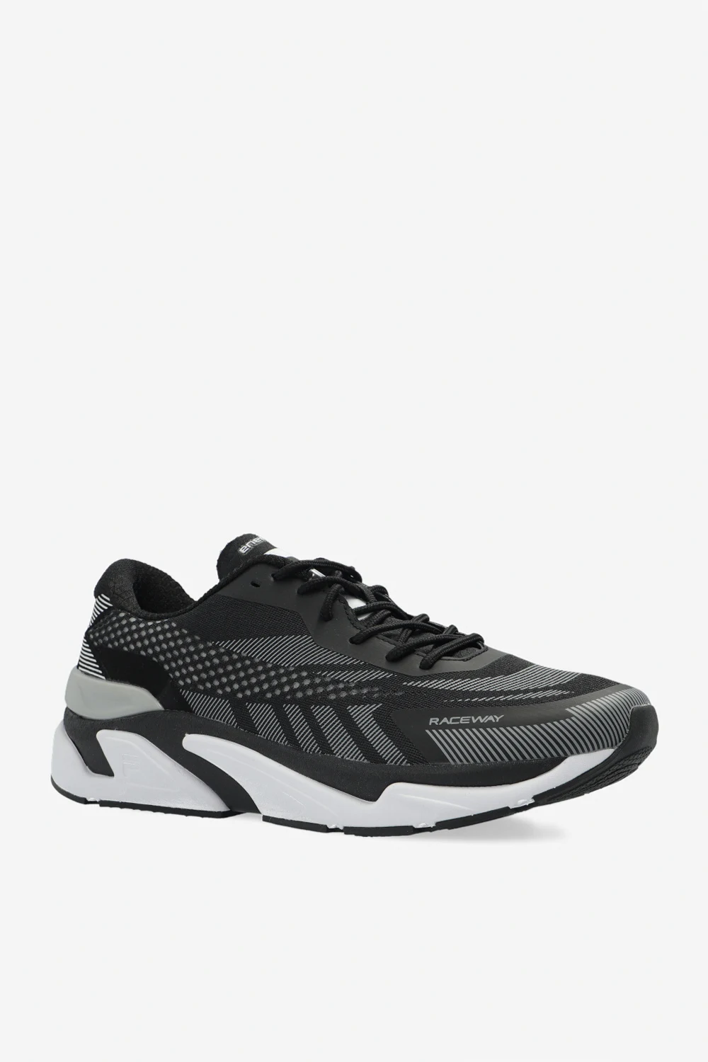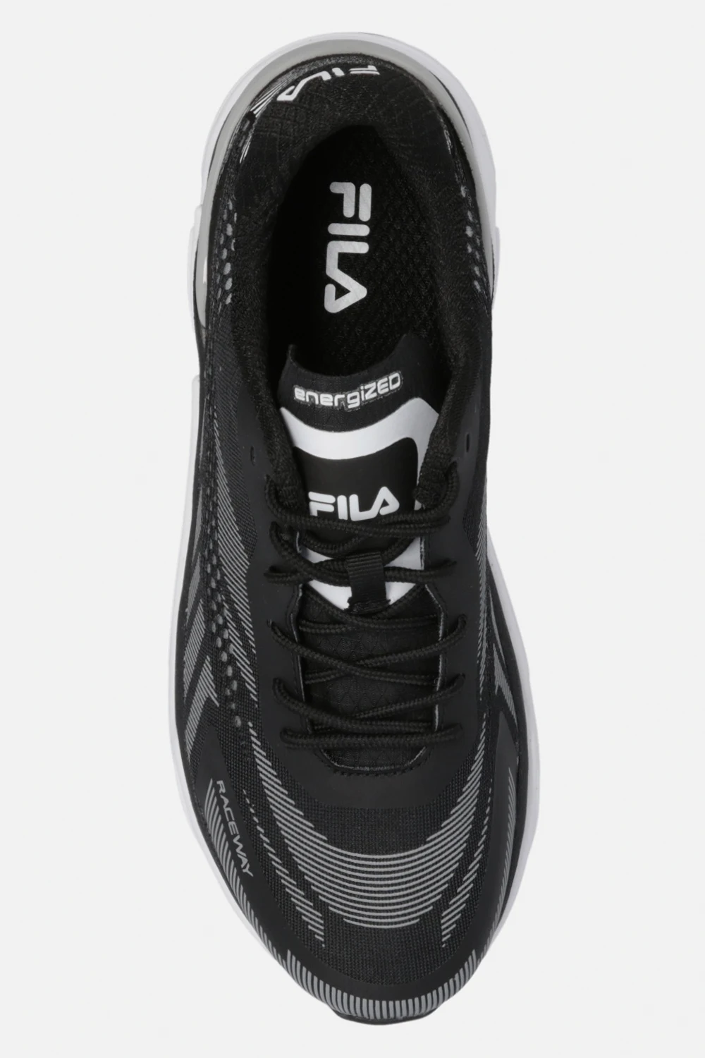 Czarno-szare, sznurowane buty sportowe, model 'Raceway' Fila. Wykonane materiału wykończonego siatką gwarantującą oddychalność obuwia. Ozdobione liniowymi nadrukami w kolorze szaro-białym. Z tyłu białe logo. Czarno-biała, gumowa podeszwa.