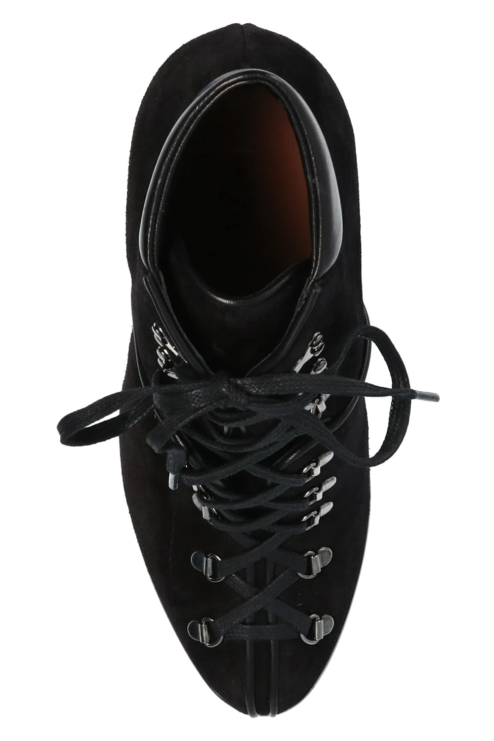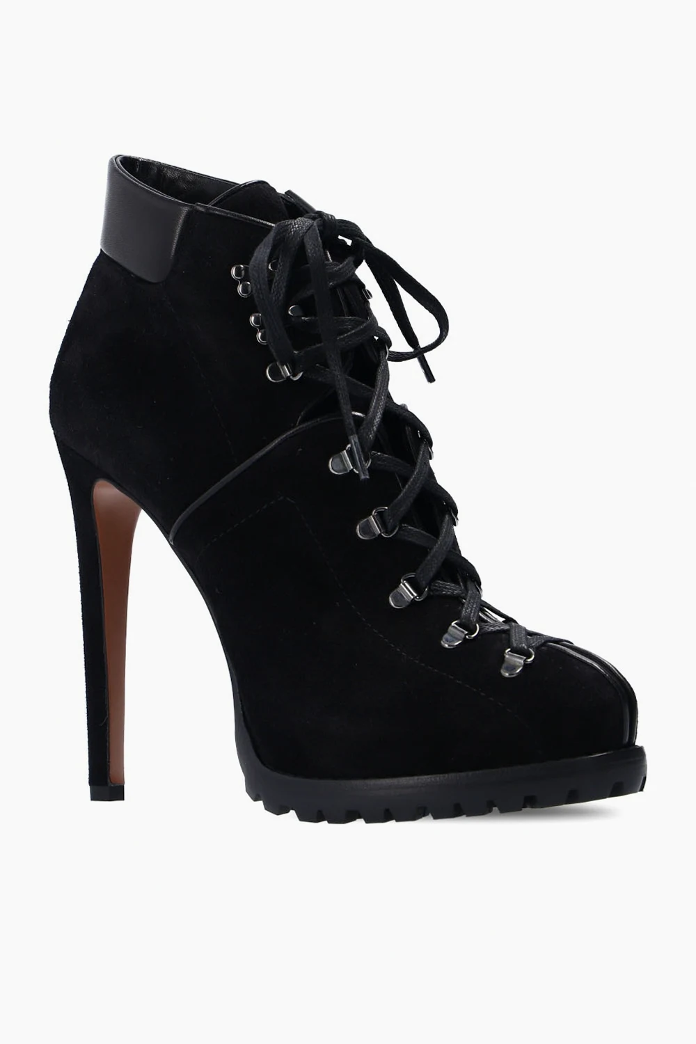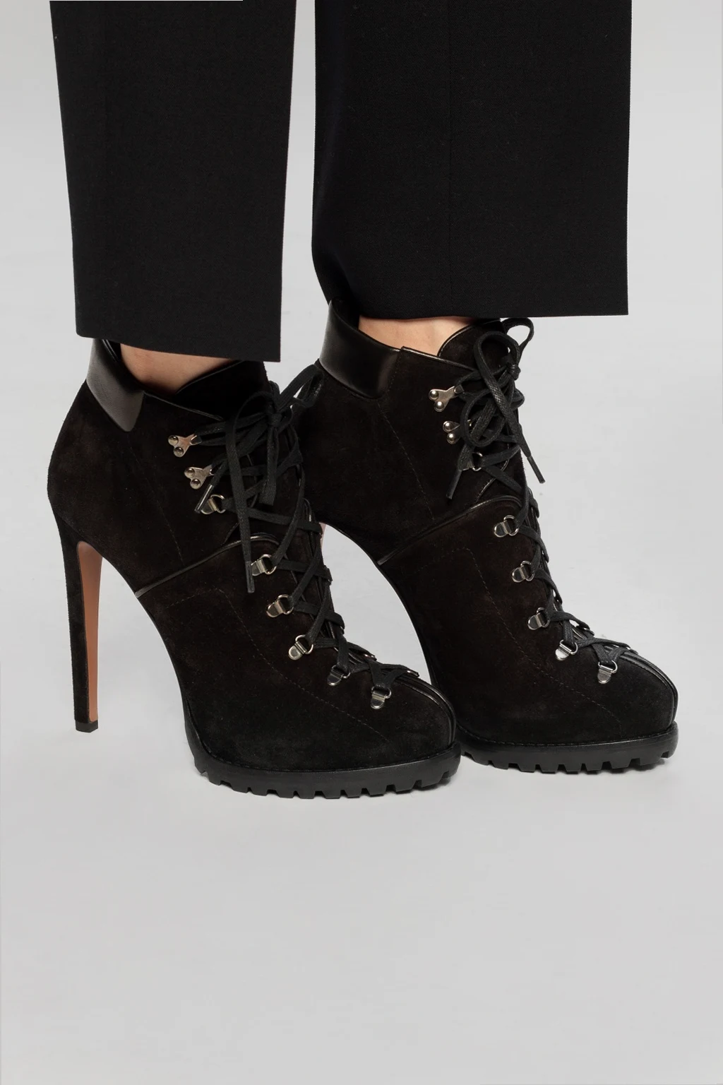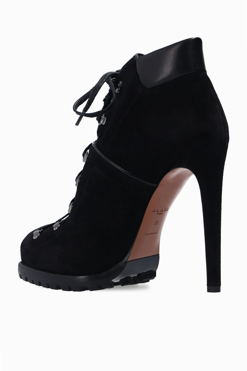 Czarne, sznurowane botki na obcasie Alaia. Wykonane z zamszu. Ozdobione wstawkami wykonanymi z połyskującej skóry. Czarno-brązowa podeszwa wykonana ze skóry z gumową, traperową podeszwą. Okrągły nosek.