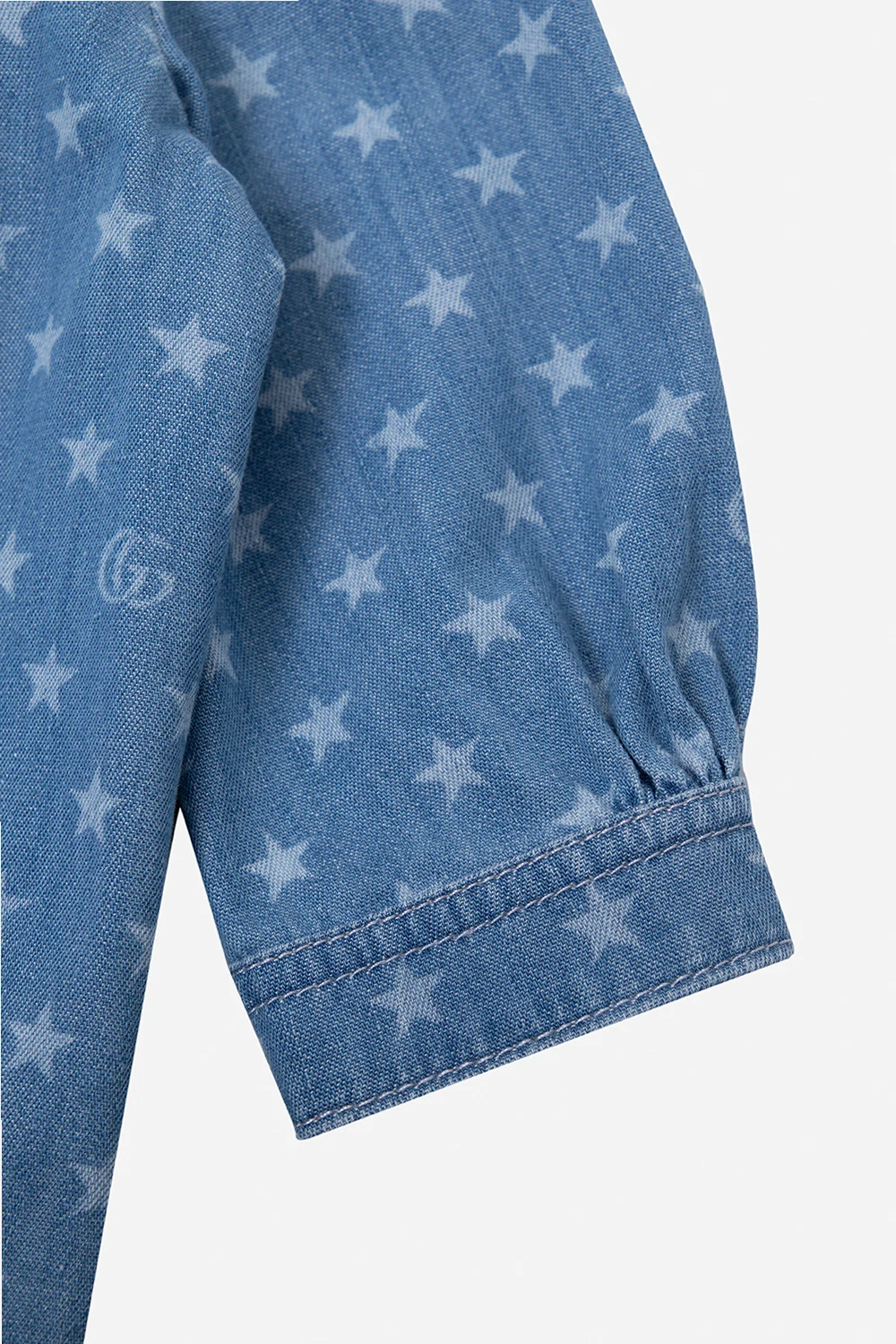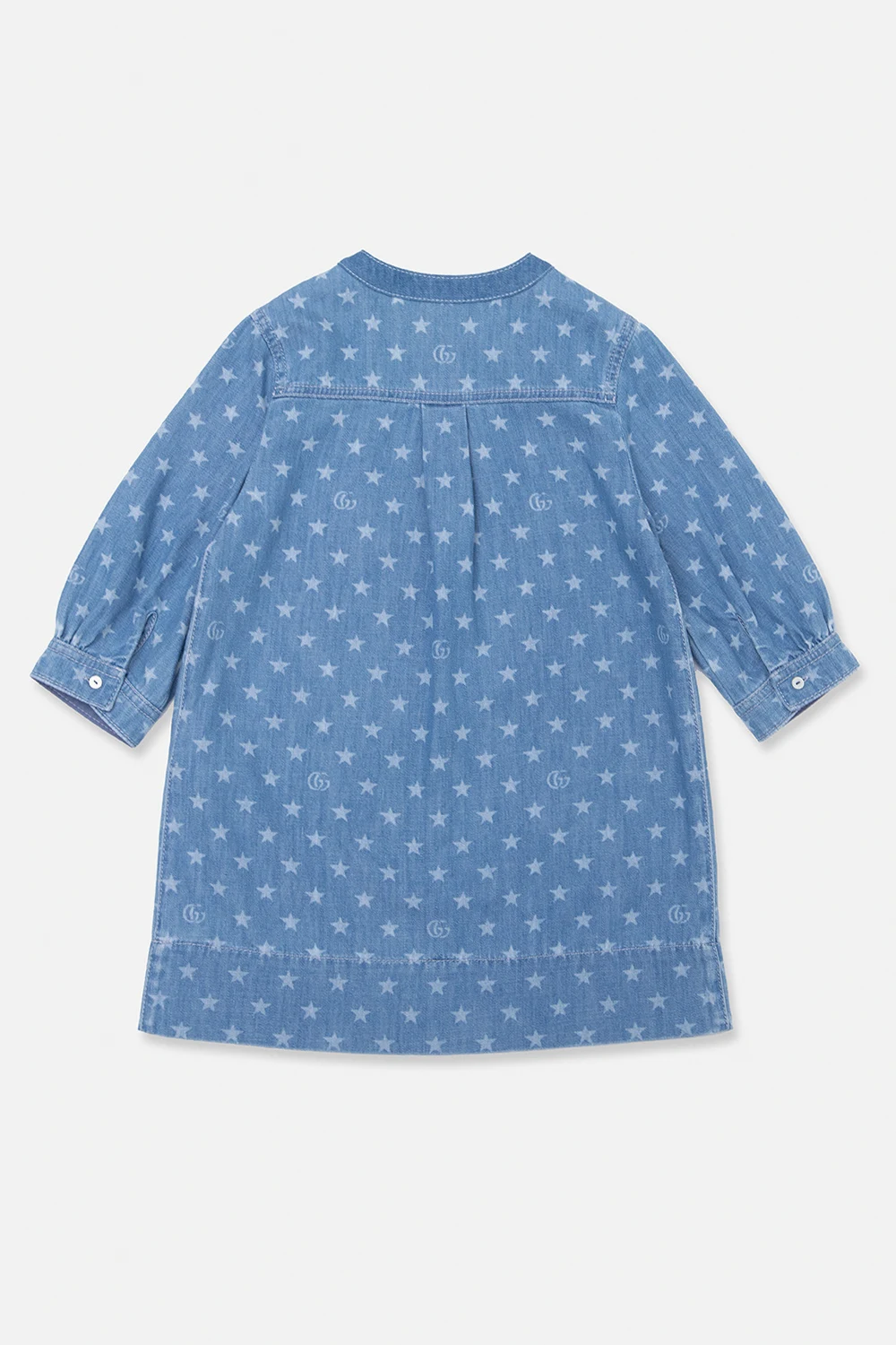 Niebieska, jeansowa sukienka Gucci Kids. Okrągły dekolt z rozcięciem zapinany na guziki. Ozdobiona wzorem z motywem gwiazd i logo. Długie rękawy.