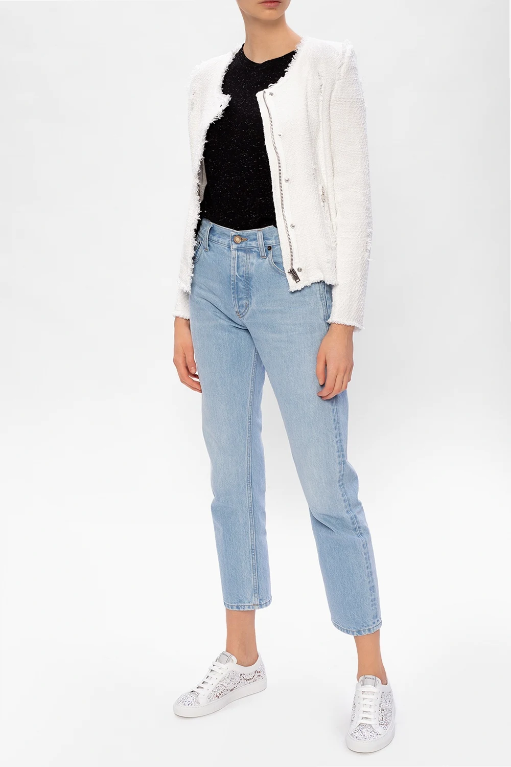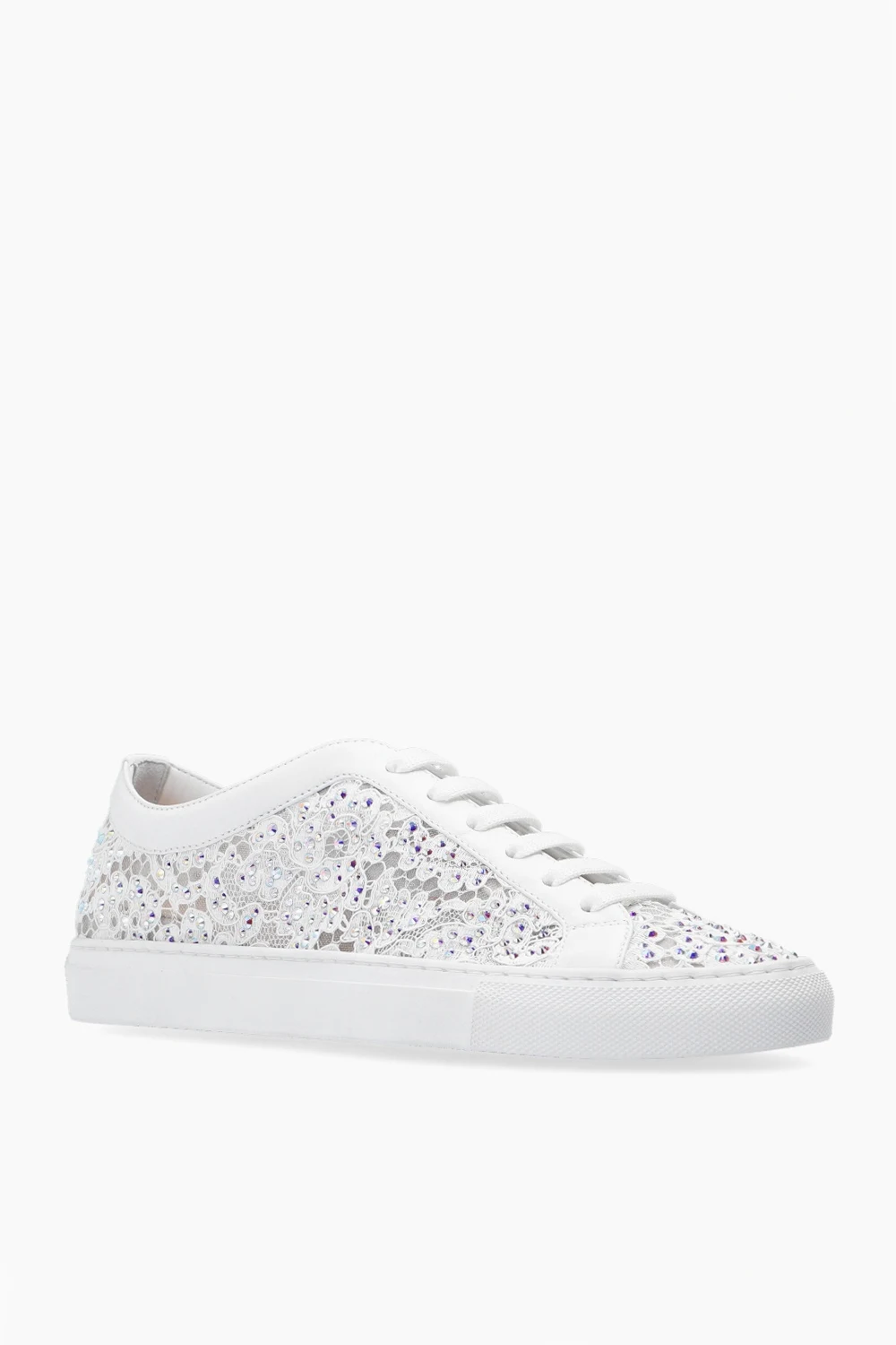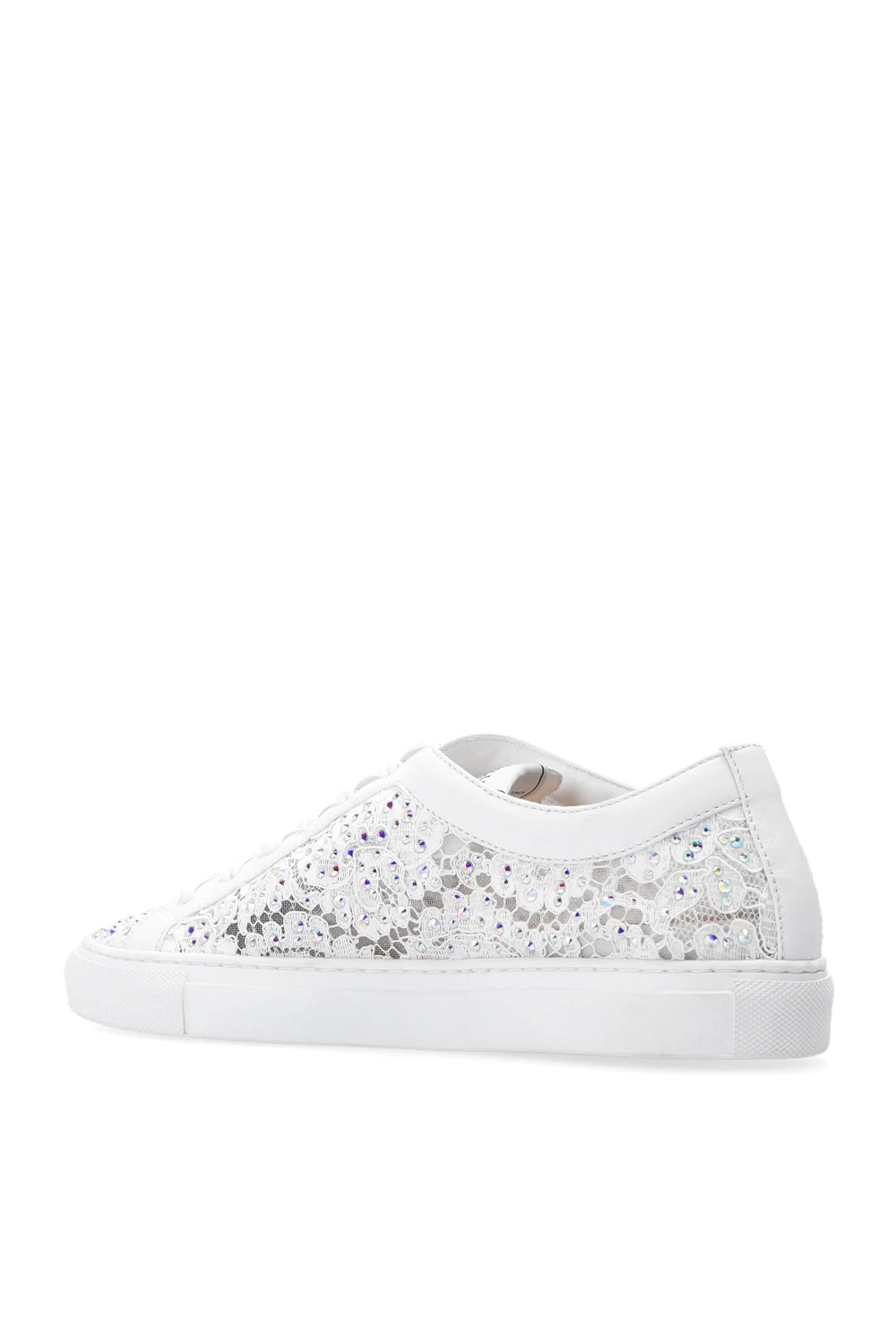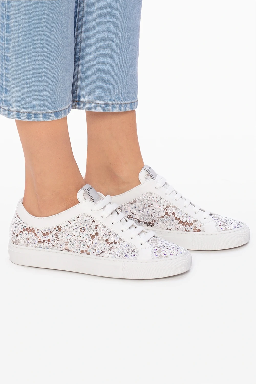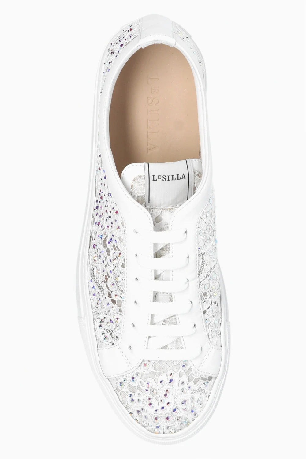 Białe, koronkowe, sznurowane buty sportowe, model 'Daisy' Le Silla. Ozdobione dekoracyjnymi elementami w kolorze srebrnym. Biała, gumowa podeszwa.