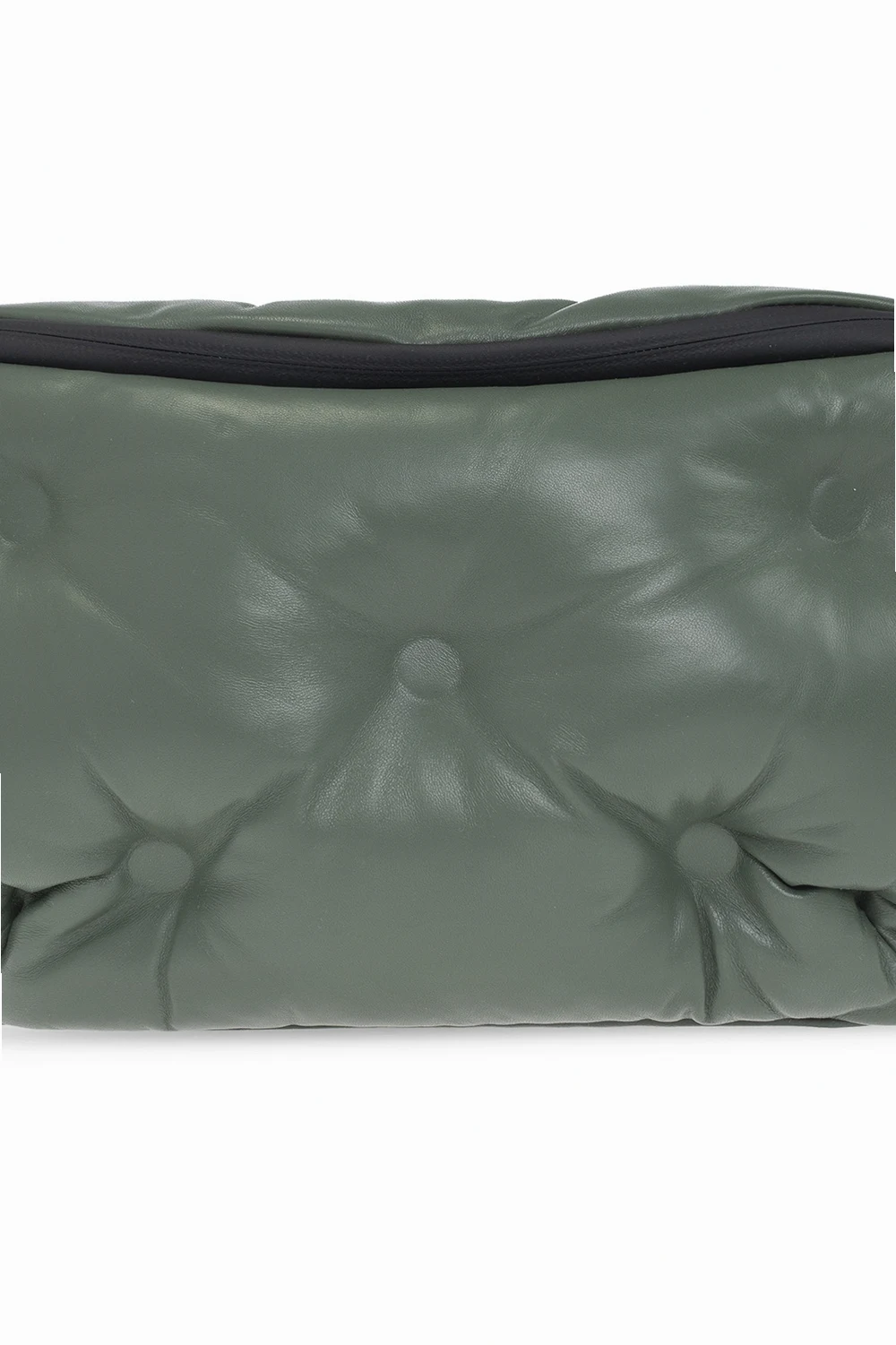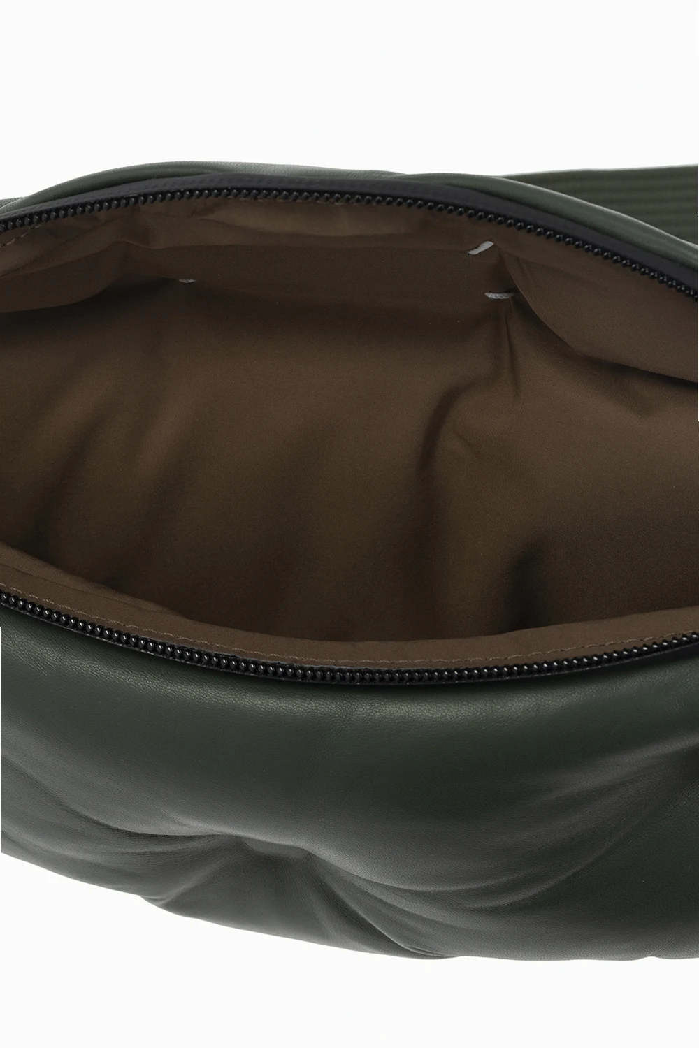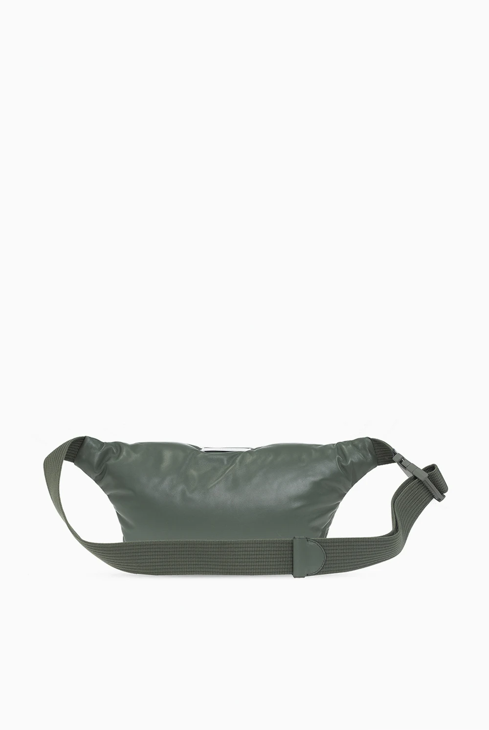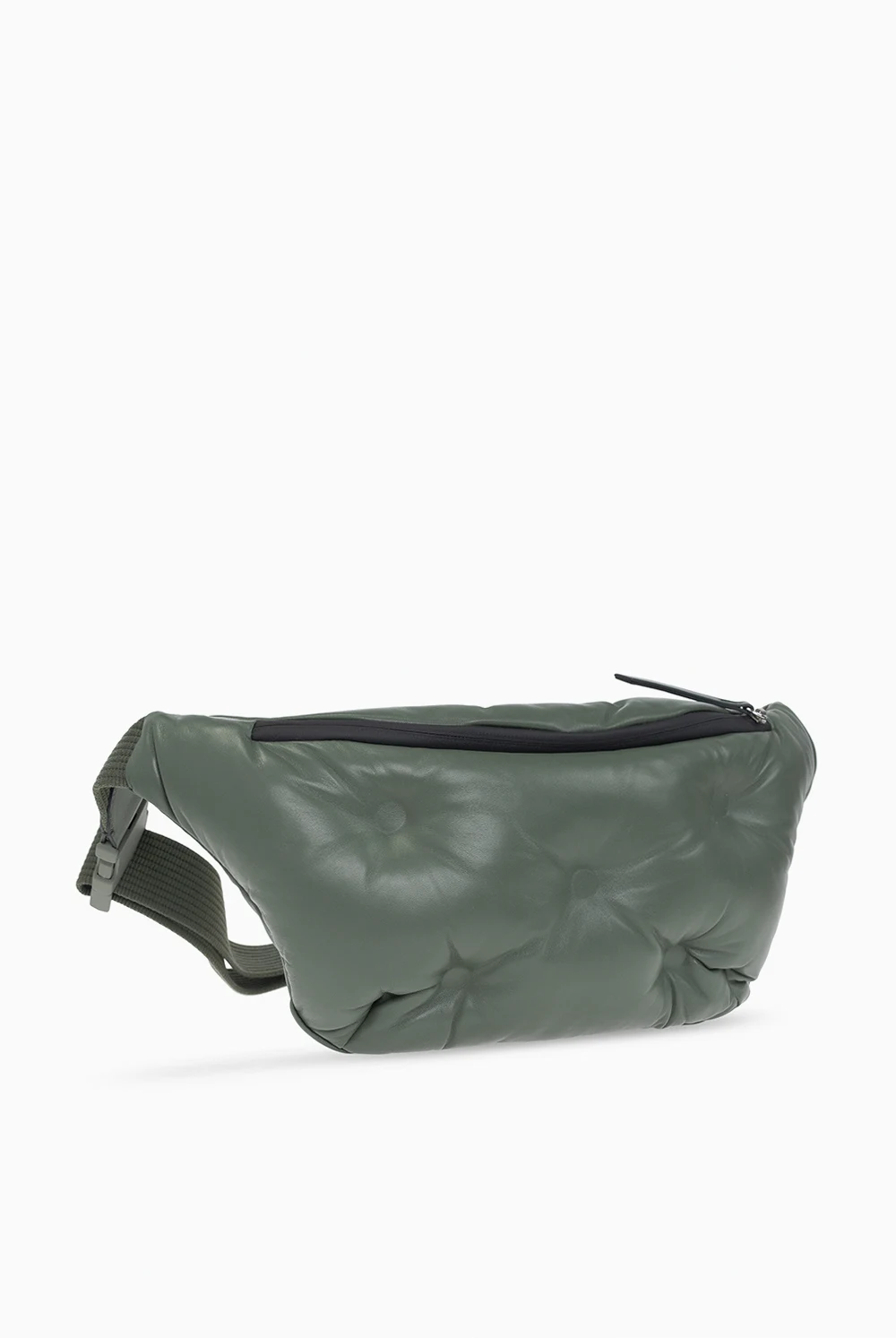 Skórzana torba na pas w kolorze khaki, model ‘Glam Slam’ Maison Margiela. Zamykana na zamek. Ozdobiona charakterystyczną dla naszywką z logo w kolorze białym. Pas z możliwością regulacji długości. Wewnątrz komora z kieszenią zamykaną na zamek.