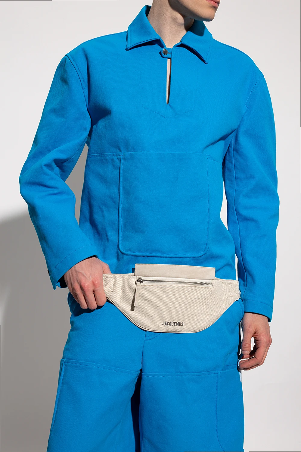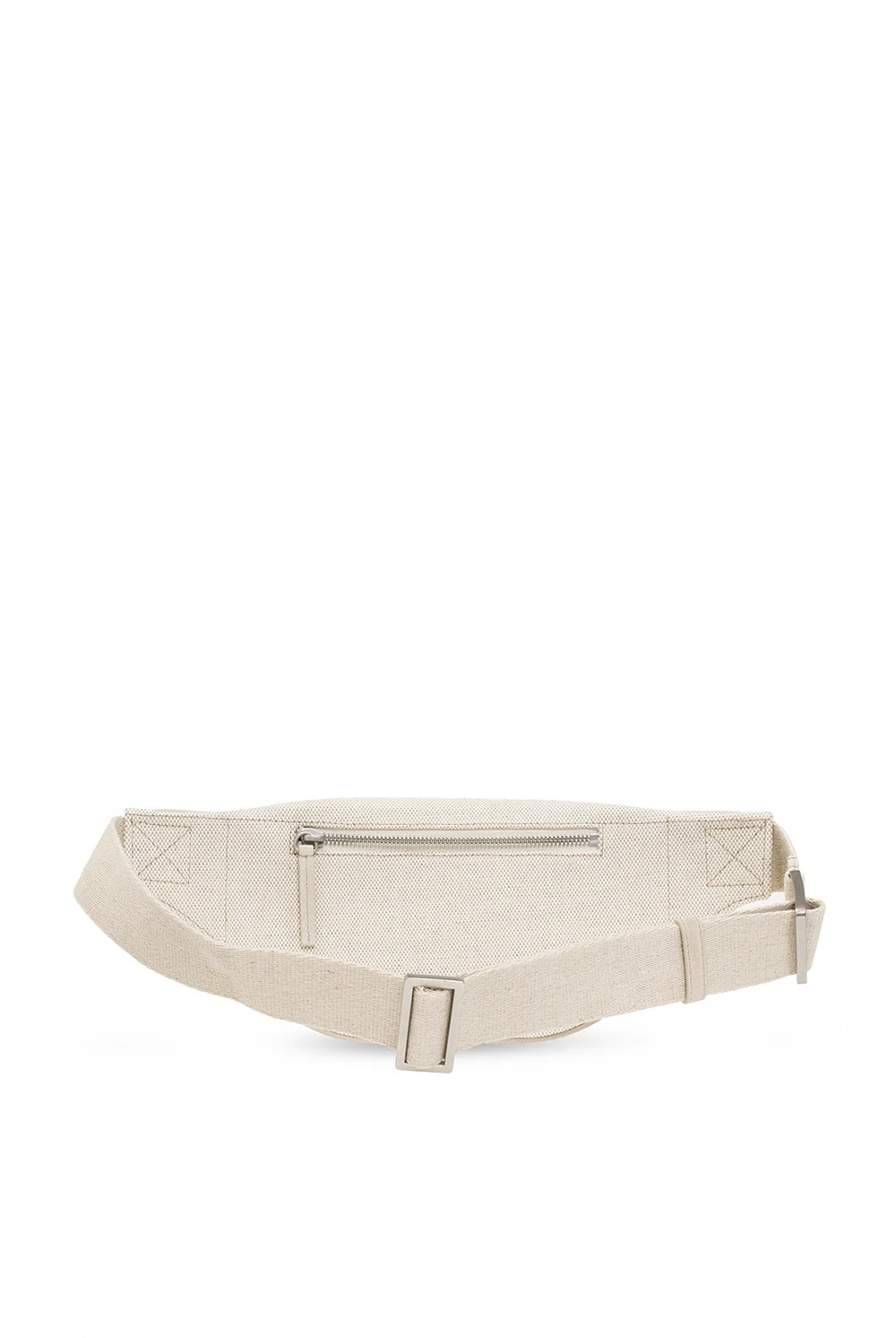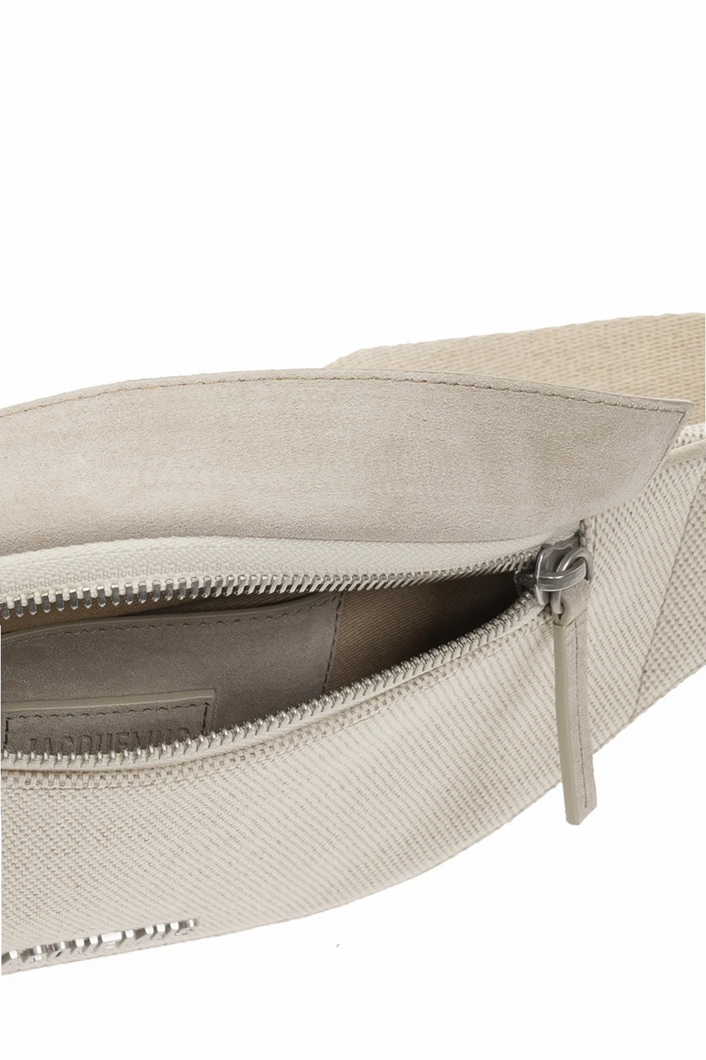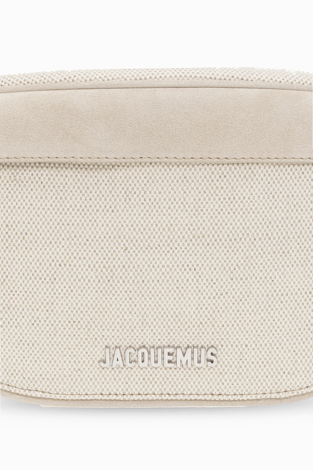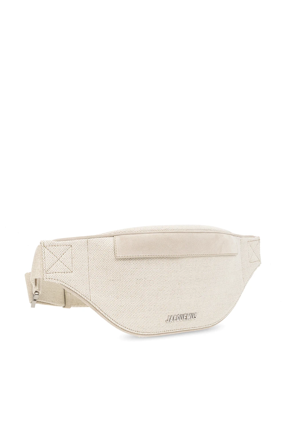 Jasnobeżowa torba na pas model ‘Le Banane Meunier’ Jacquemus. Wykonana z mieszanki lnu i bawełny oraz wykończona zamszem. Zamykana na zamek. Z przodu ozdobiona aplikacją z logo w kolorze srebrnym. Z tyłu kieszeń zamykana na zamek. Pas z możliwością regulacji długości. Wewnątrz komora z miejscem na kartę.
