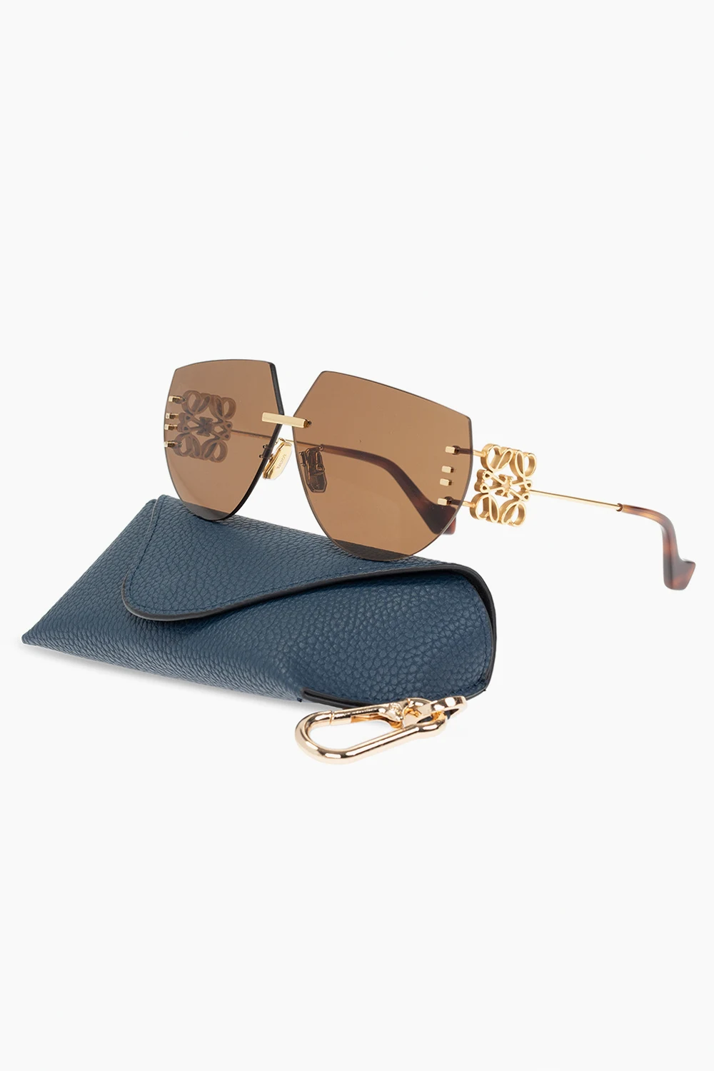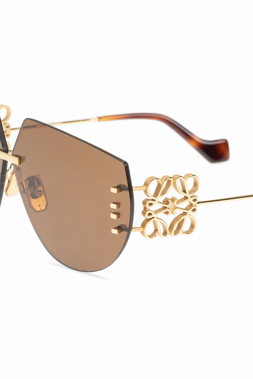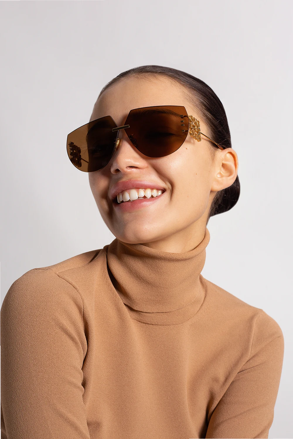Okulary przeciwsłoneczne w kolorze złotym Loewe. Ozdobione metalowym logo. Szkła w kolorze brązowym. Certyfikowane soczewki 100% UVA/UVB. Dołączone etui w kolorze niebieskim.