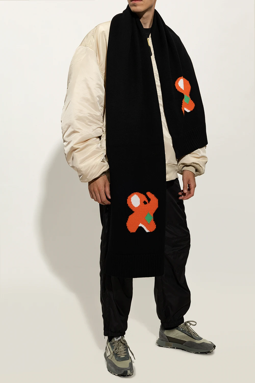 Czarny szal JW Anderson. Wykonany z wełny. Ozdobiony kolorowym wzorem z motywem zwierzęcym.