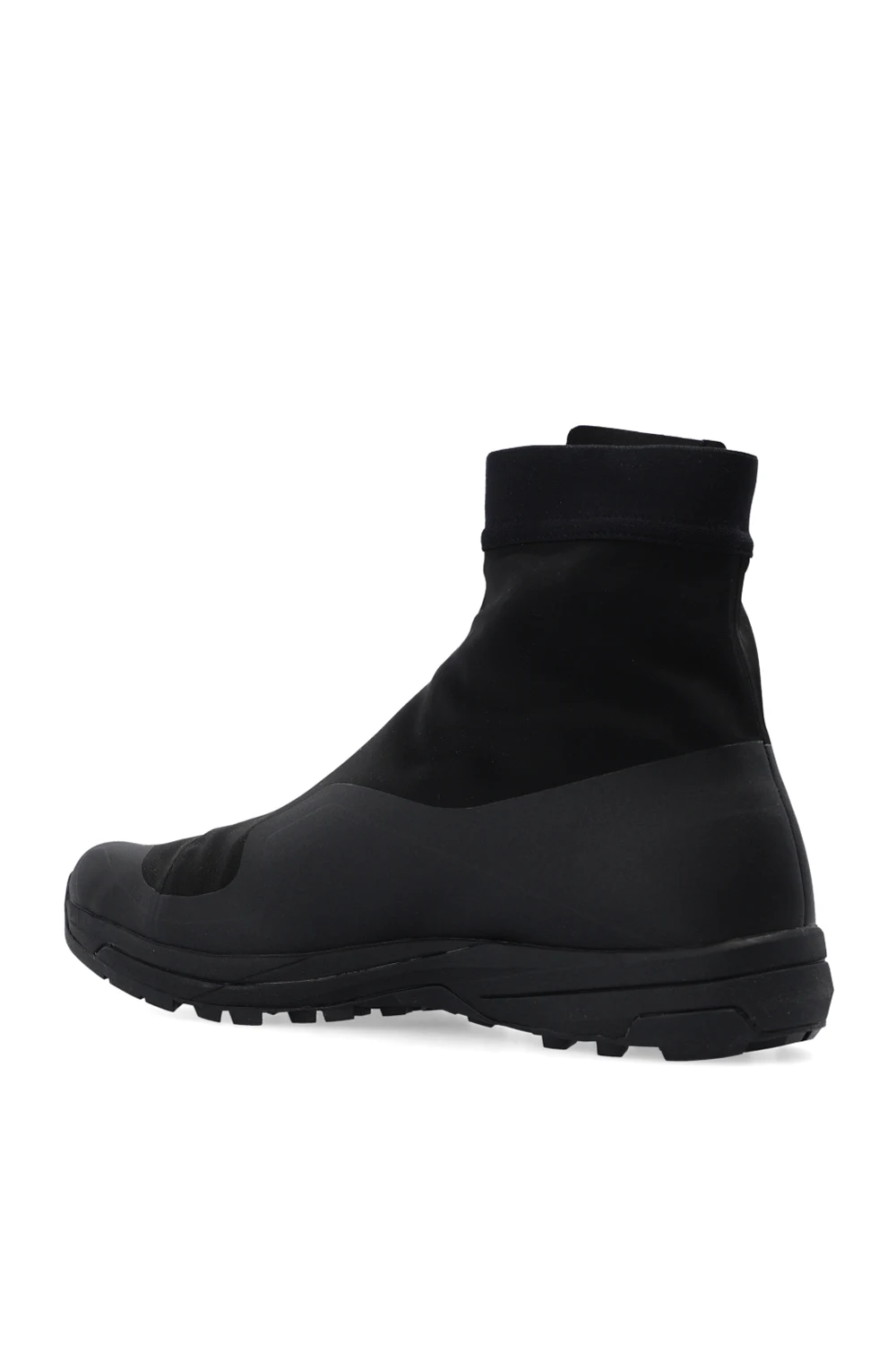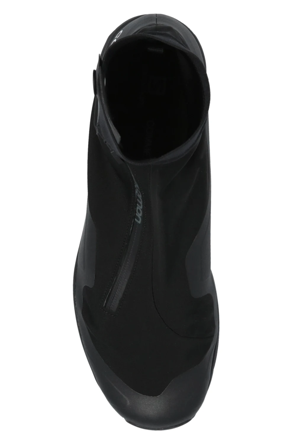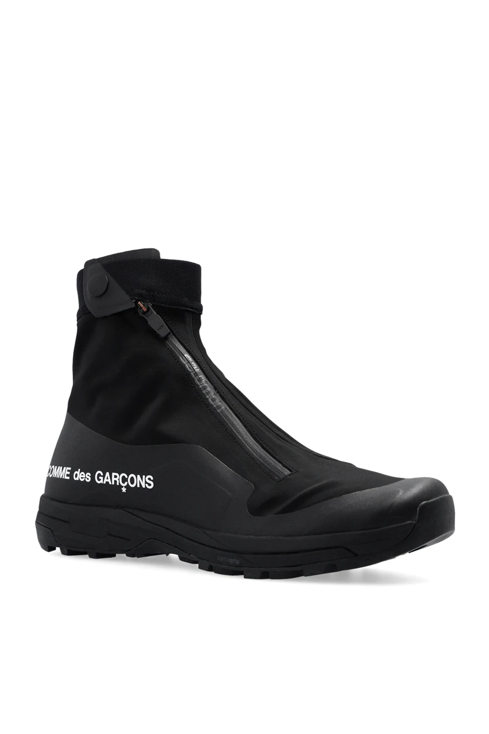 Czarne buty sportowe, model ‘XA-Alpine’ Comme des Garçons x Salomon. Zapinane na zatrzask oraz na zamek z logo. Z boku logo w kolorze białym. Czarna podeszwa z Contagrip® - zapewniającą bezpieczeństwo i przyczepność mieszanką gumy, która oferuje doskonałe właściwości trakcyjne w rozmaitym górskim terenie.