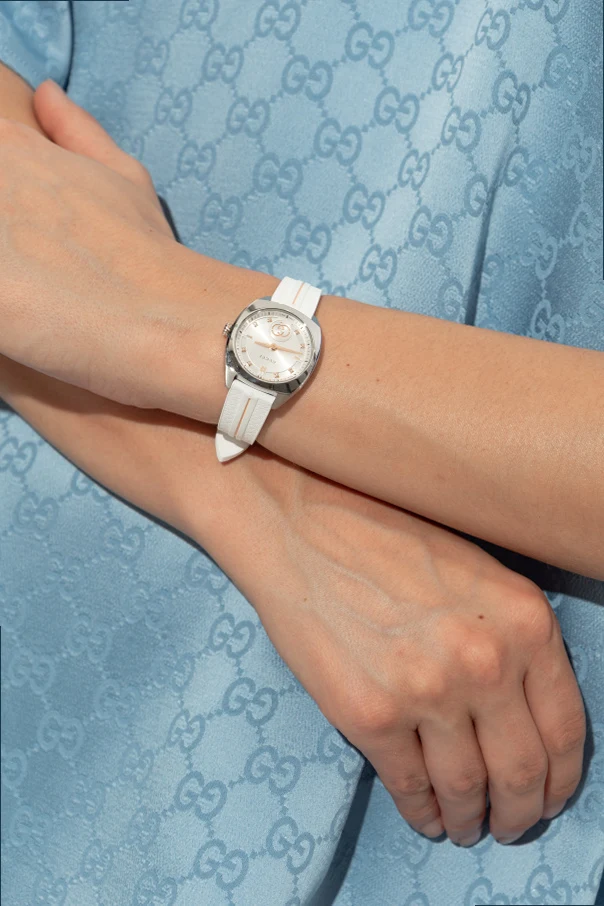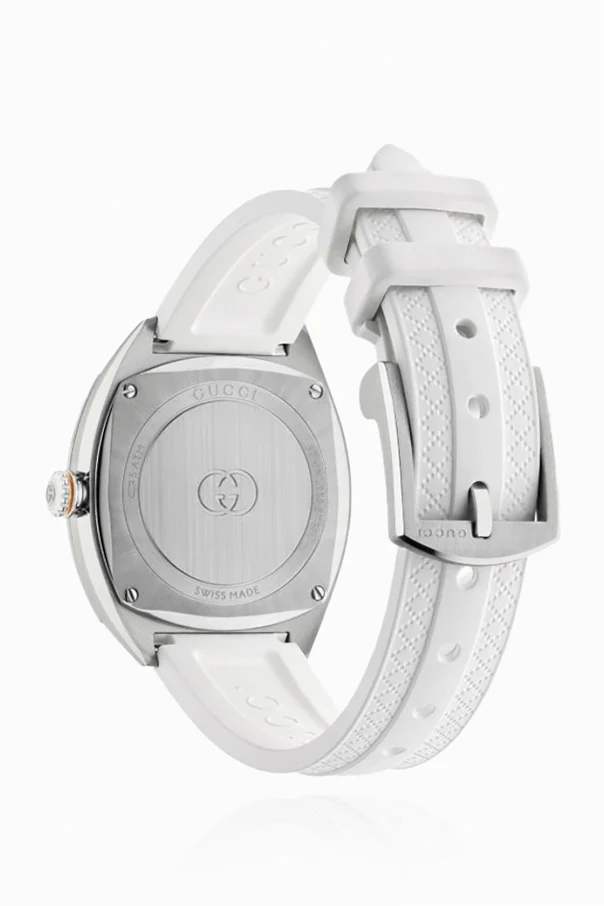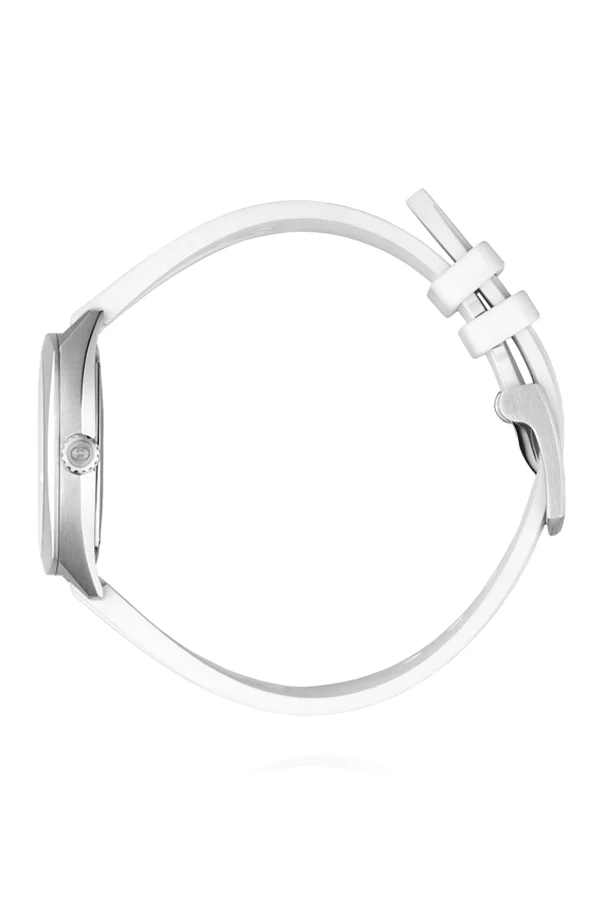 Zegarek z logo marki Gucci urzeka wyjątkową harmonią klasyki i współczesności. Okrągła tarcza, otoczona subtelnie zaokrągloną kopertą ze stali, doskonale komponuje się z białym, tłoczonym paskiem z tworzywa sztucznego, ozdobionym podwójną złotą linią. Każdy detal świadczy o kunszcie rzemiosła i prestiżu domu mody Gucci – od wyrazistego napisu „GUCCI” na tarczy, przez kultowe logo GG, aż po szczegółowe grawery na tylnej klapie ozdobione informacją o szwajcarskim pochodzeniu.