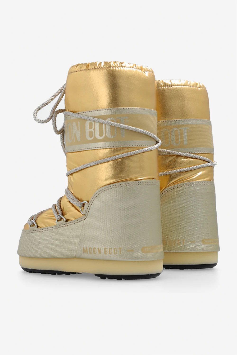 Ocieplane, sznurowane śniegowce w kolorze złotym z metalicznym efektem, model ‘Icon’ Moon Boot Kids. Wykonane z wodoodpornego materiału. Ozdobione logo. Lekka podeszwa środkowa z przyssawkami na gumowej podeszwie w kolorze czarno-kremowym z bieżnikiem, które zapewniają dobrą kontrolę nad podłożem.