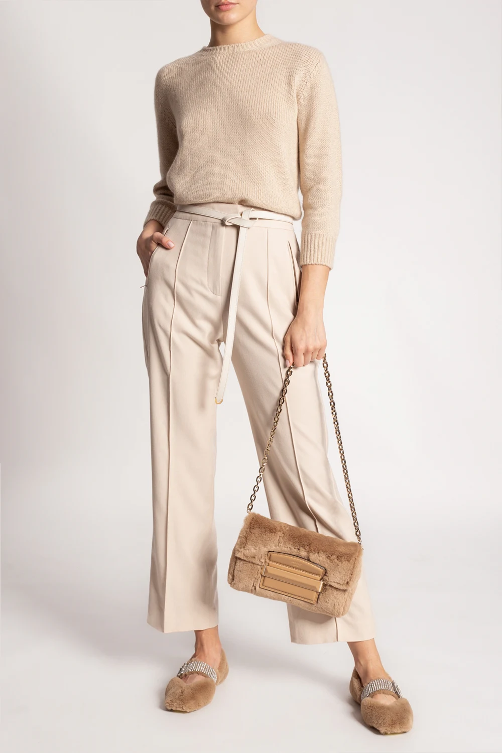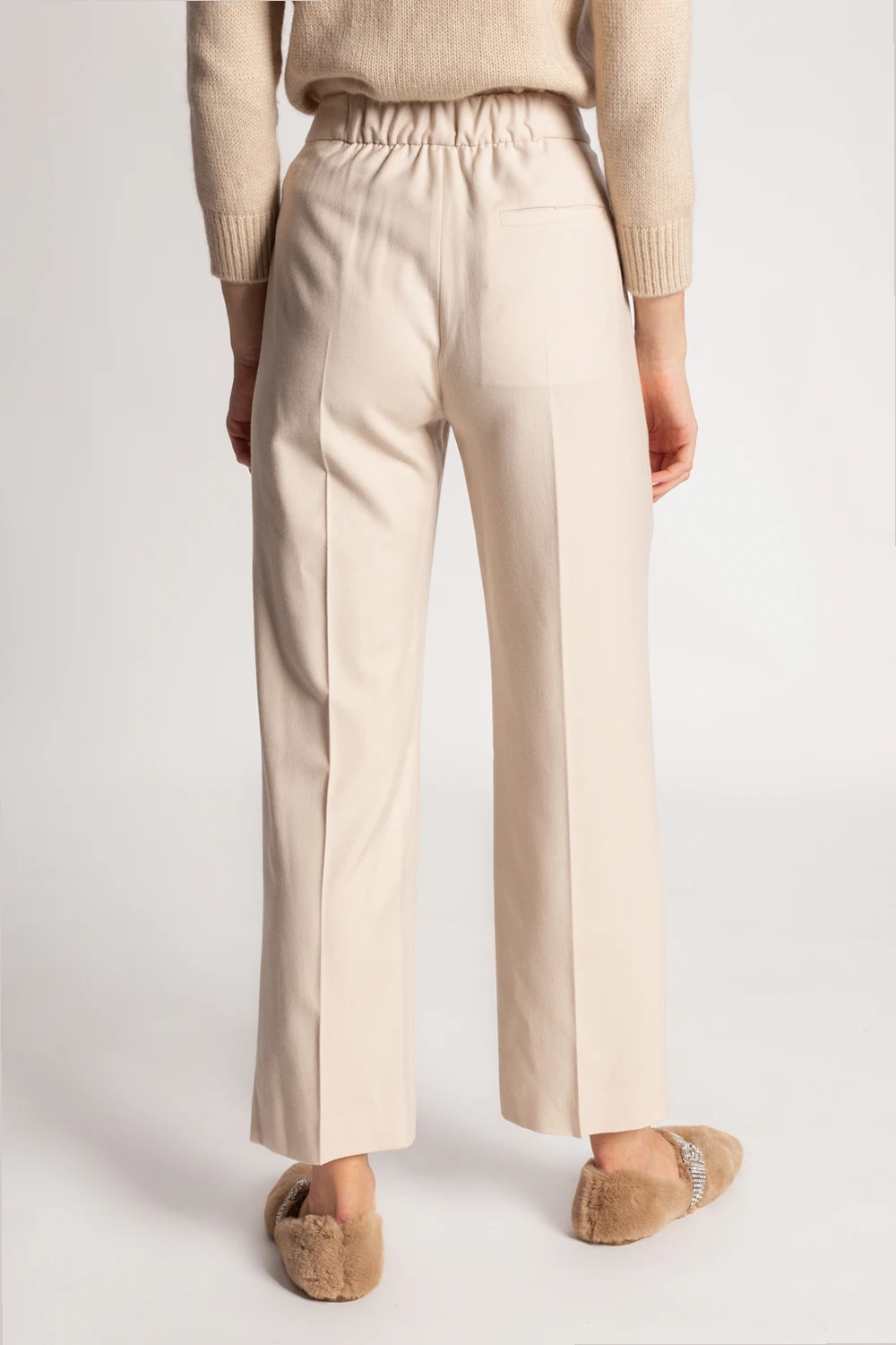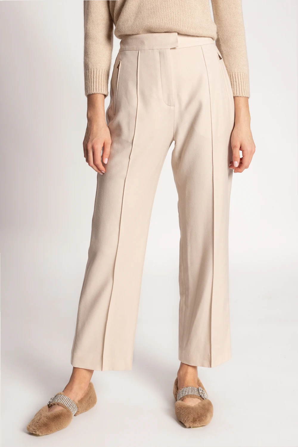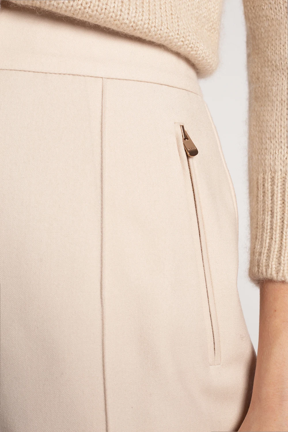 Kremowe, wełniane spodnie Agnona. Zapinane na zamek, zaczep i guzik. Proste nogawki z przeszyciem z przodu. Z przodu dwie kieszenie zapinane na zamek.