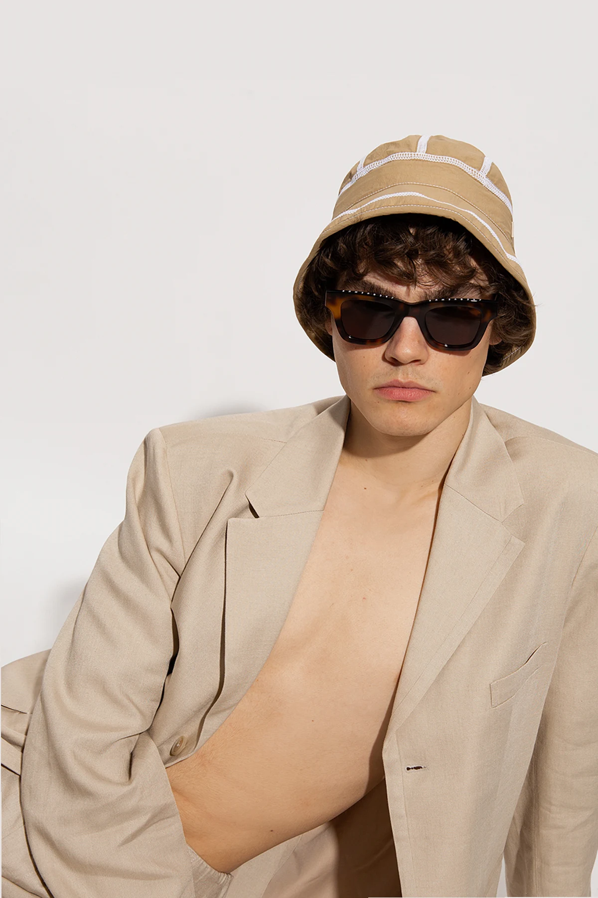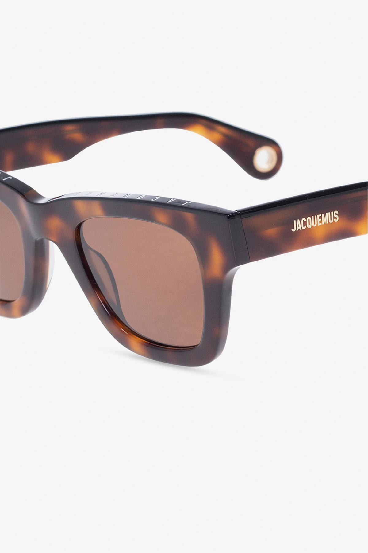 Czarno-brązowe okulary przeciwsłoneczne, model ‘Nocio’ Jacquemus. Zauszniki oraz oprawki ozdobione logo w kolorze białym i złotym. Zauszniki zakończone okrągłym wycięciem umożliwiające dopięcie biżuterii. Brązowe, certyfikowane soczewki 100% UVA/UVB. Dołączone etui.
