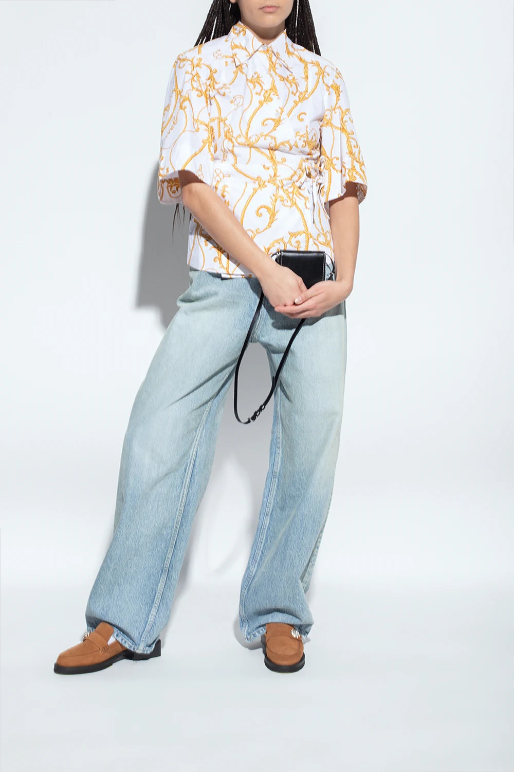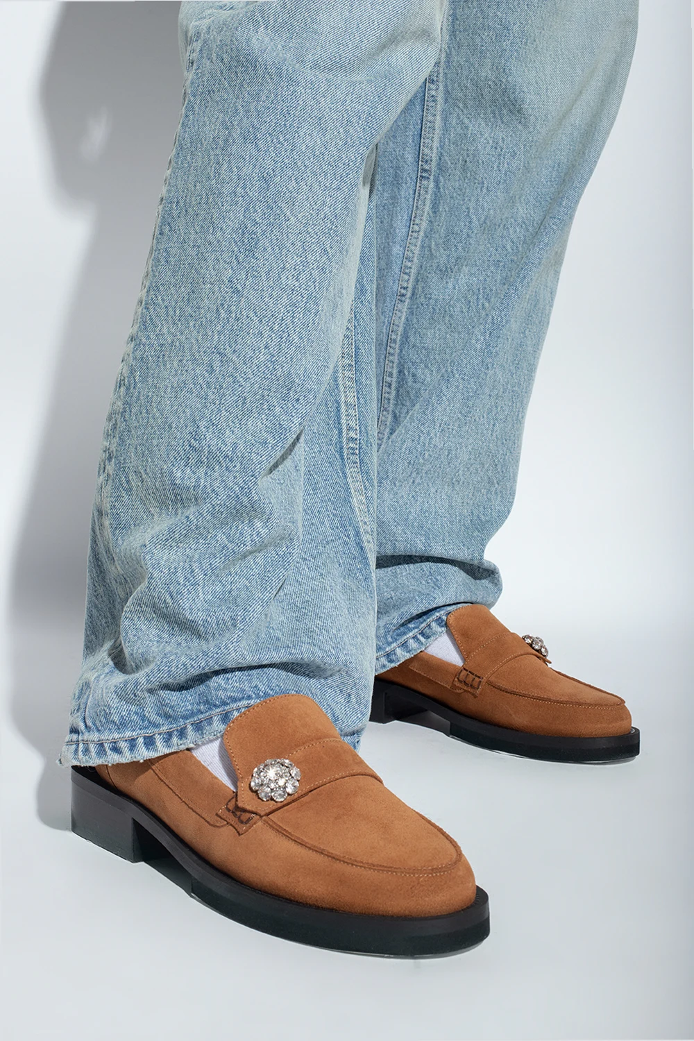 Brązowe mokasyny Ganni. Wykonane z zamszu i skóry. Ozdobione połyskującą aplikacją wysadzaną kamieniami. Czarna, gumowa podeszwa.
