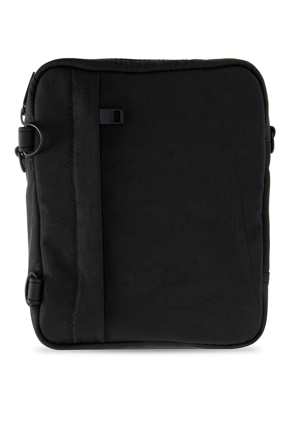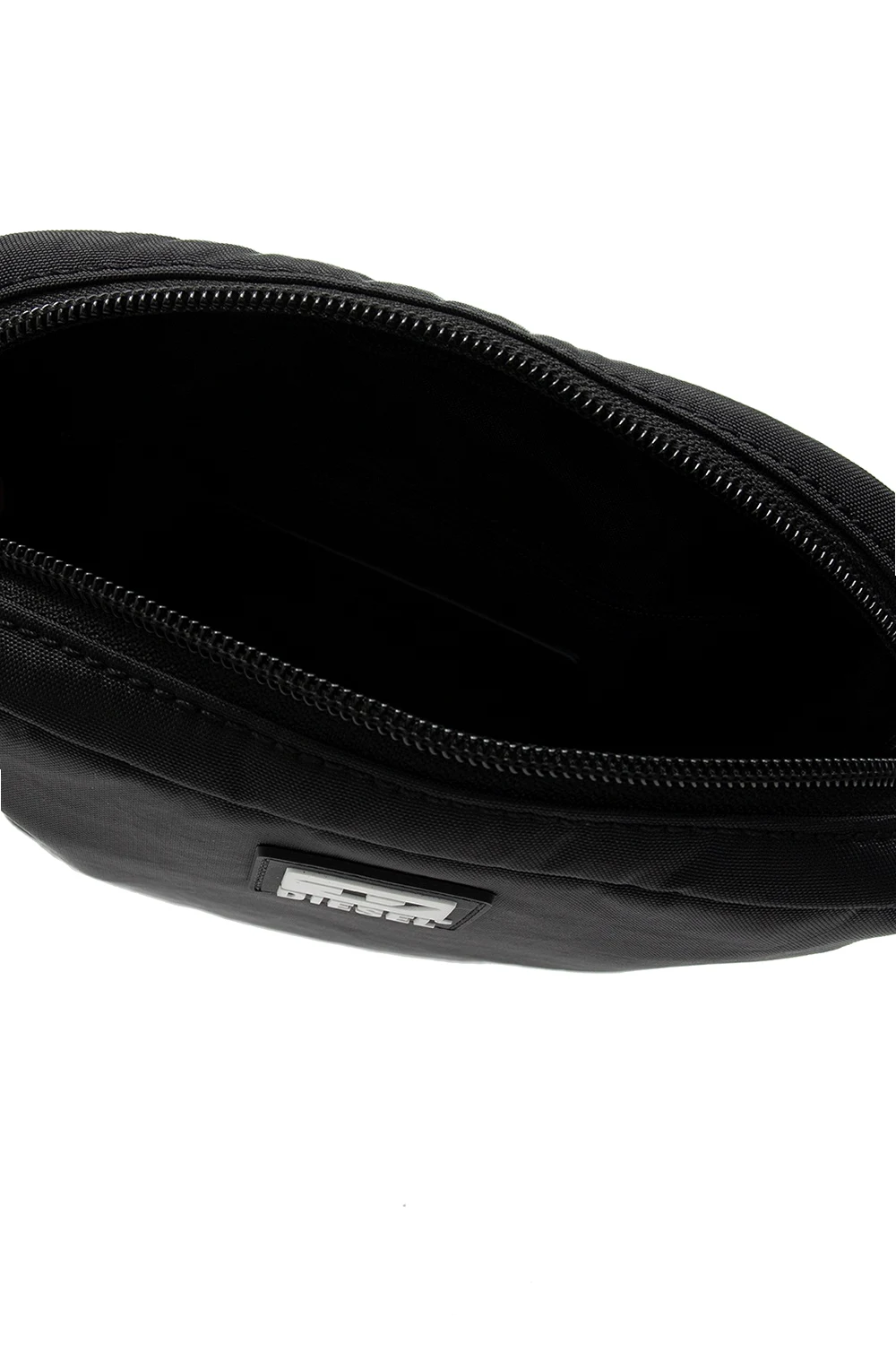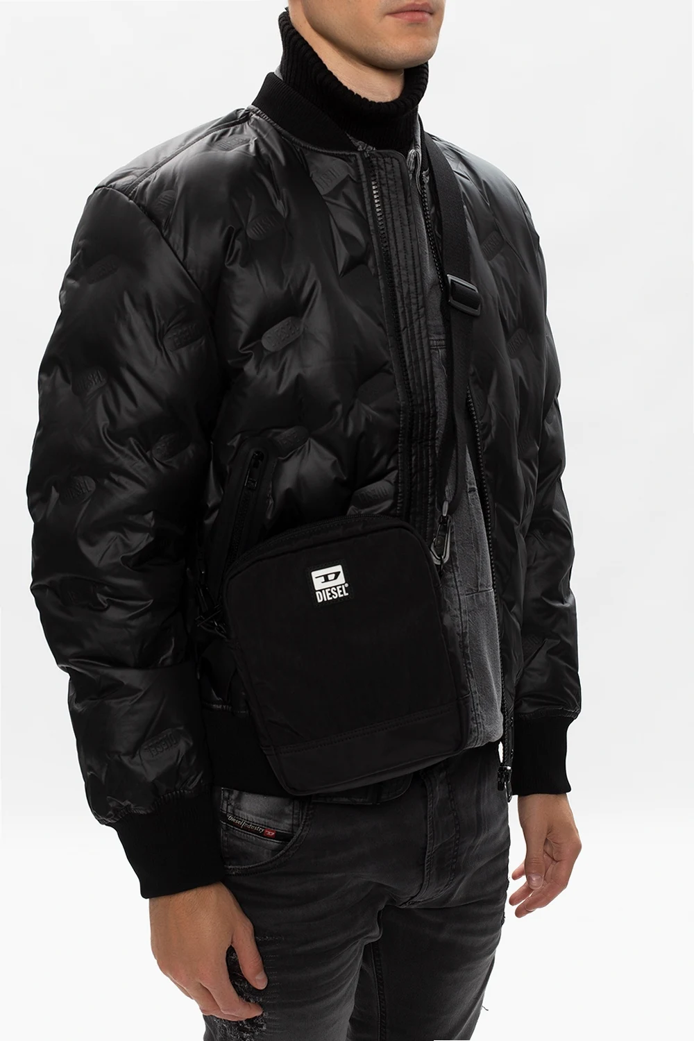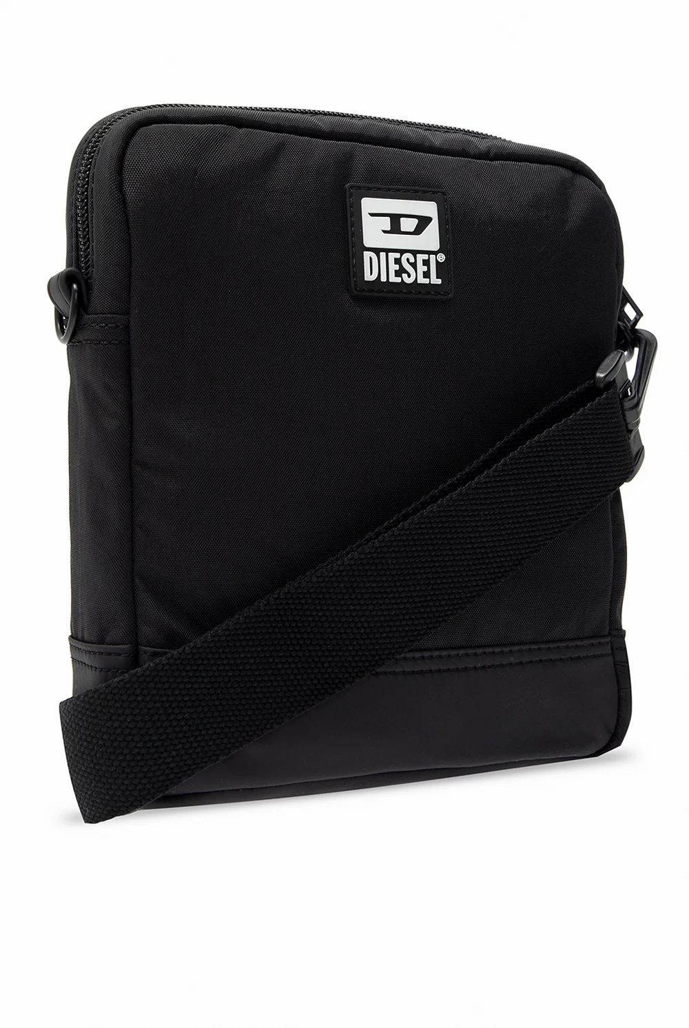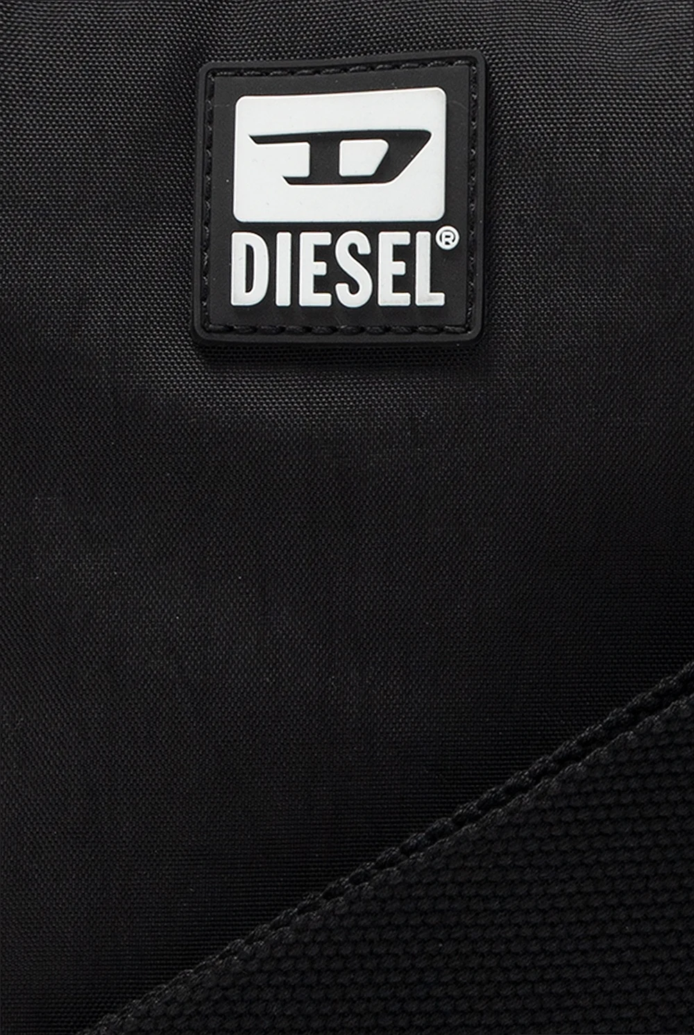Czarna torba na ramię, model 'Tairo' Diesel. Zamykana na dwubiegunowy zamek. Z przodu aplikacja z logo w kolorze czarno-białym. Z tyłu kieszeń zamykana na zamek. Odpinany, regulowany pasek na ramię. Wewnątrz komora z kieszenią zamykaną na zamek.