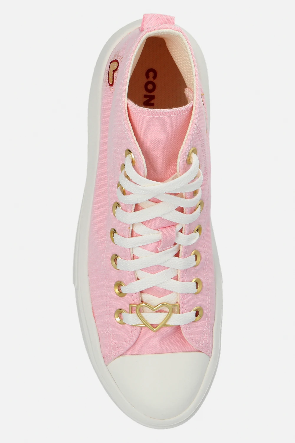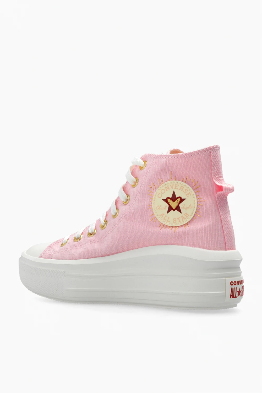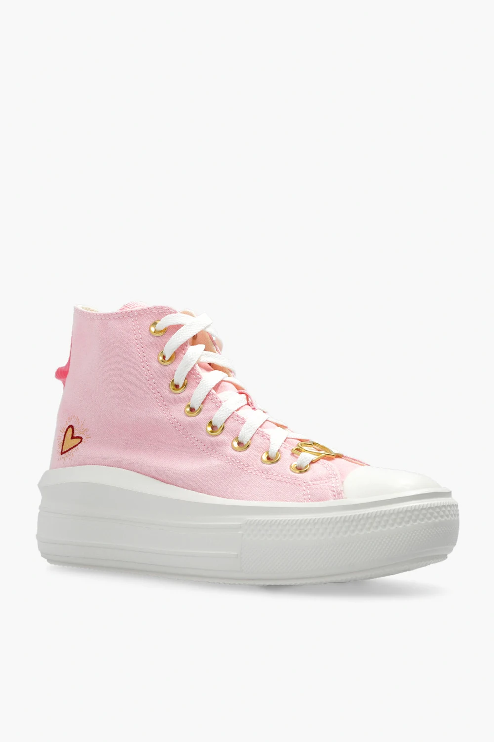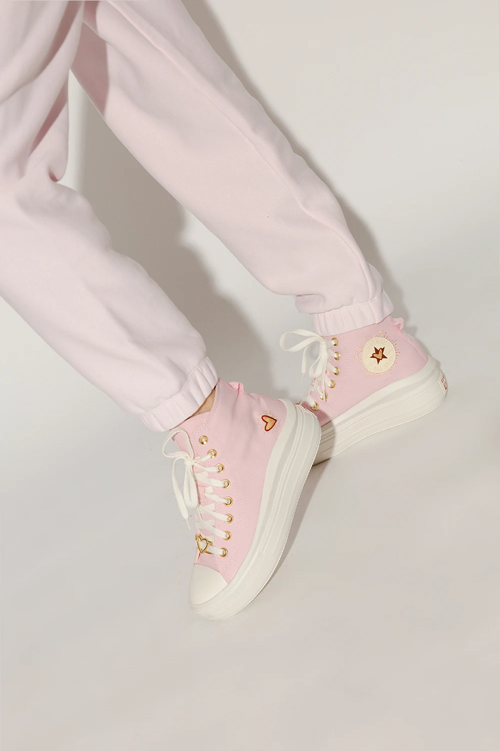 Różowo-kremowe, sznurowane buty sportowe za kostkę, model ‘CTAS Move Hi’ Converse. Wykonane z materiału. Ozdobione aplikacją z logo oraz haftem z motywem serca. Kremowa, gumowa podeszwa.