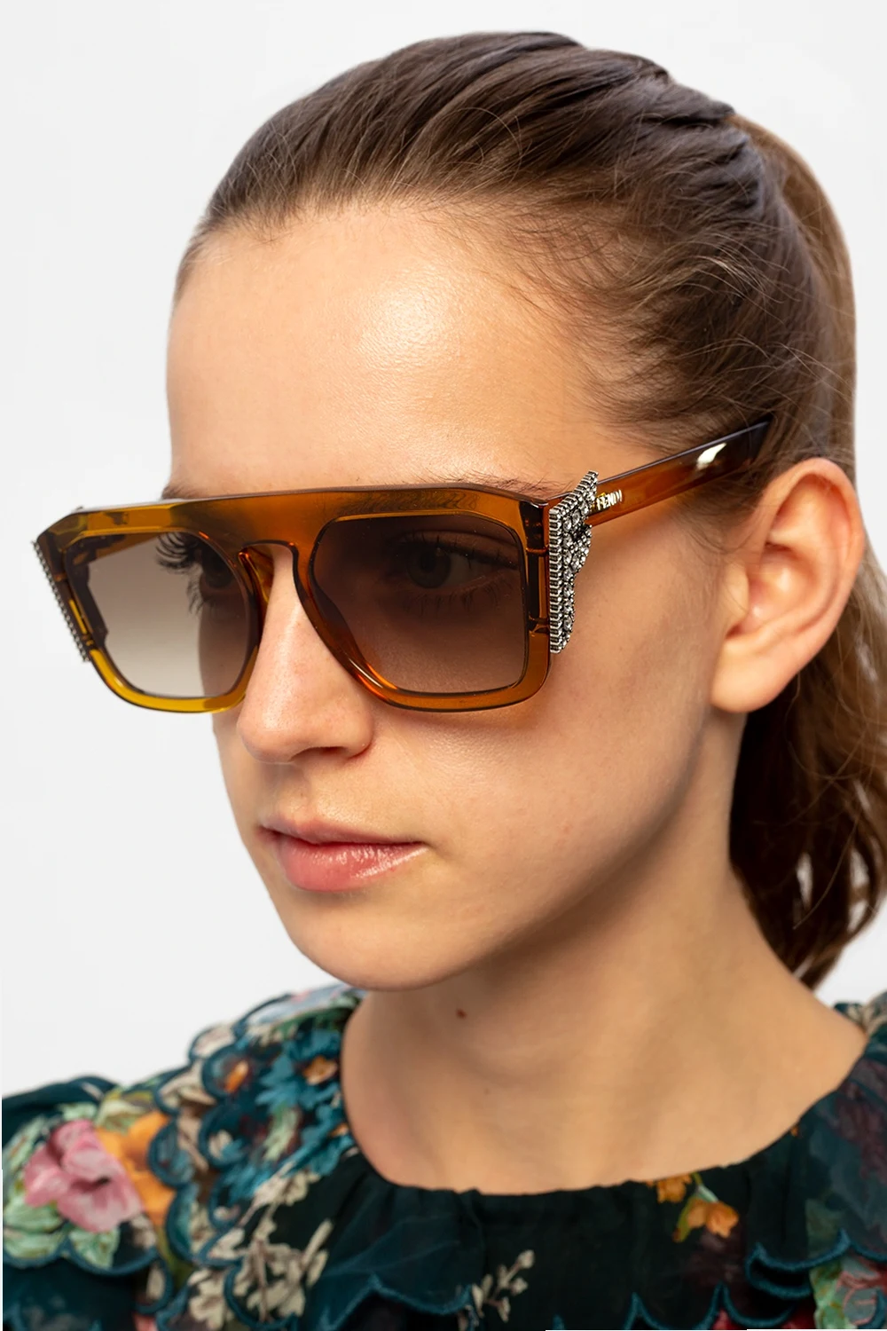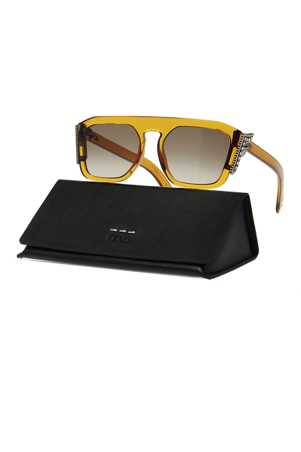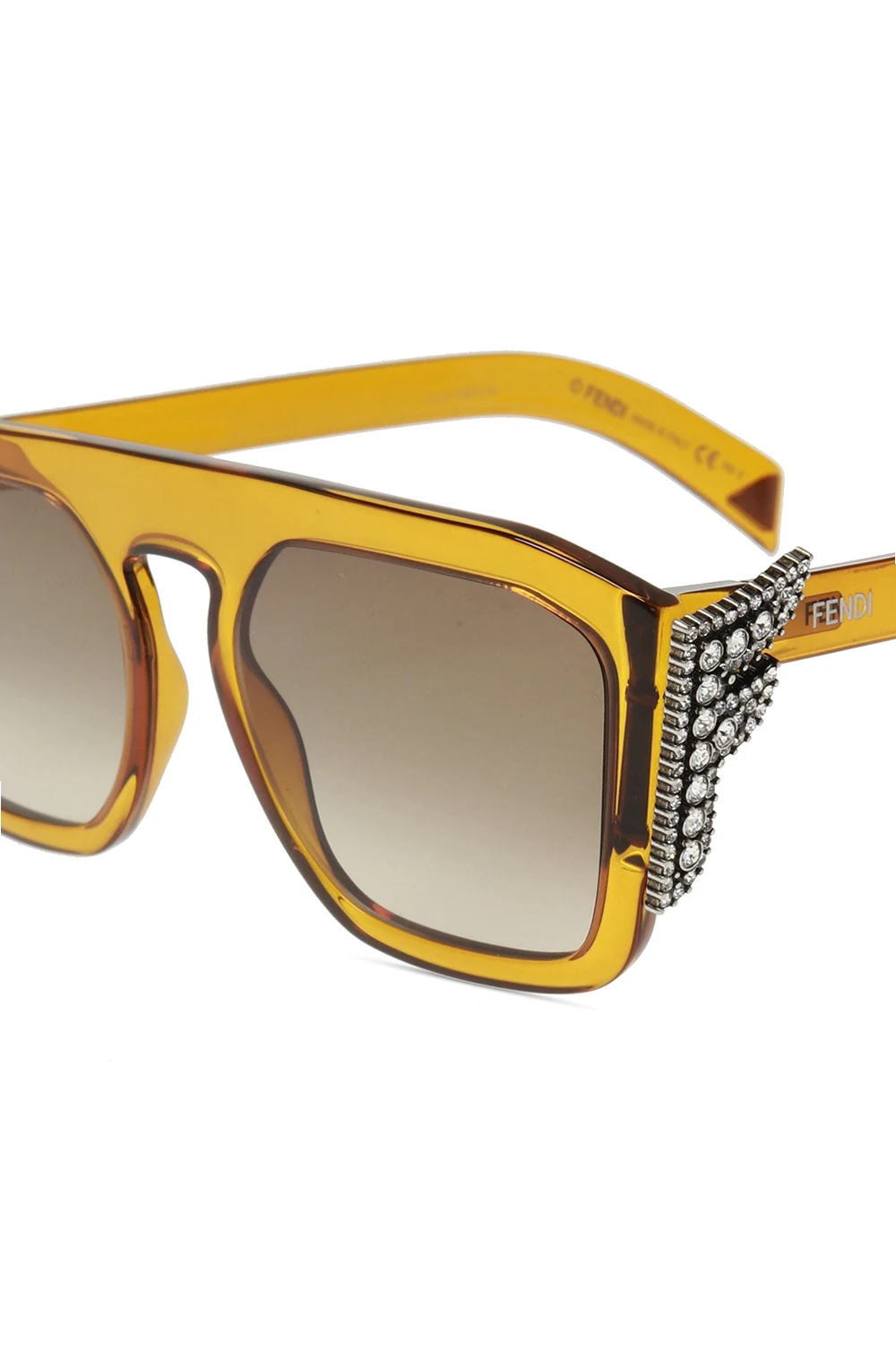 Żółte, transparentne okulary przeciwsłoneczne Fendi. Zauszniki z dekoracyjną aplikacją z logo. Brązowe gradientowe, certyfikowane soczewki UVA/UVB.